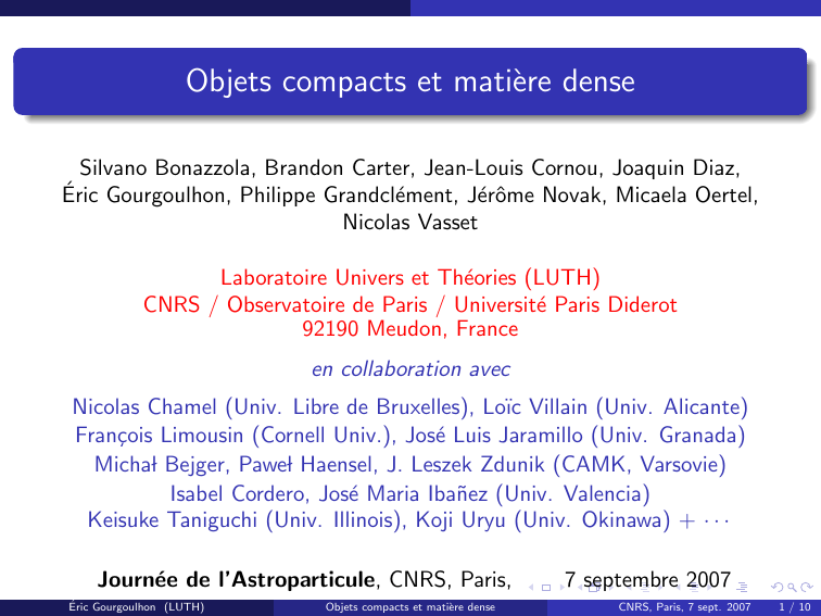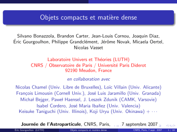 Objets compacts et matière dense Silvano Bonazzola, Brandon Carter, Jean-Louis Cornou, Joaquin Diaz, Éric Gourgoulhon, Philippe Grandclément, Jérôme Novak, Micaela Oertel, Nicolas Vasset Laboratoire Univers et Théories (LUTH) CNRS / Observatoire de Paris / Université Paris Diderot 92190 Meudon, France en collaboration avec Nicolas Chamel (Univ. Libre de Bruxelles), Loı̈c Villain (Univ. Alicante) François Limousin (Cornell Univ.), José Luis Jaramillo (Univ. Granada) Michal Bejger, Pawel Haensel, J. Leszek Zdunik (CAMK, Varsovie) Isabel Cordero, José Maria Ibañez (Univ. Valencia) Keisuke Taniguchi (Univ. Illinois), Koji Uryu (Univ. Okinawa) + · · · Journée de l’Astroparticule, CNRS, Paris, Éric Gourgoulhon (LUTH) Objets compacts et matière dense 7 septembre 2007 CNRS, Paris, 7 sept. 2007 1 / 10 Sw ch iss ee se La sa g S p na ag he tti Écorce solide des étoiles à neutrons B Crust: Core: nuclei + neutron superfluid homogeneous matter Atmosphere Envelope Crust Outer core Inner core Formulation covariante pour la dynamique d’un modèle magnéto-élastique de l’écorce d’une étoile à neutrons [Carter, Chachoua & Chamel, GRG 38, 83-119 (2006)] Traitement BCS mésoscopique de la superfluidité des neutrons dans l’écorce solide [Carter, Chamel & Haensel, Nucl. Phys. A759, 411 (2005)] C A Neutron superfluid Neutron superfluid + proton superconductor Neutron vortex Neutron vortex Magnetic flux tube Nuclei in a lattice Étude de la pénétration des neutrons superfluides dans le réseau cristallin de l’écorce [Carter & Samuelsson, CQG 23, 5367 (2006)] Page & Reddy ARNPS 56, 327 (2006) Éric Gourgoulhon (LUTH) Objets compacts et matière dense CNRS, Paris, 7 sept. 2007 2 / 10 Matière de quark à haute densité Étude de la matière de quarks (u,d,s) dans des états couleur-saveur verrouillés (CFL) ⇒ pas de configuration stable avec uniquement de la matière dans l’état CFL [Buballa, Neumann, Oertel & Shovkoy, PLB 595, 36 (2004)] Bosons de Goldstone dans les états CFL [Werth, Buballa & Oertel, PPNP 59, 308 (2007)] Effet de la supraconductivité de couleur sur les propriétés d’une étoile étrange: atmosphère d’électrons, propriétés de transport Éric Gourgoulhon (LUTH) Objets compacts et matière dense CNRS, Paris, 7 sept. 2007 3 / 10 Transitions de phase dans les étoiles à neutrons Lorene/RotStar Effet observable: accélération par perte de moment cinétique [Zdunik, Bejger, Haensel & Gourgoulhon, A&A 450, 747 (2006)] Calcul de l’énergie libérée durant une transition de phase du premier ordre [Zdunik, Bejger, Haensel & Gourgoulhon, A&A 465, 533 (2007) ] LEA Astro. France-Pologone [Zdunik, Bejger, Haensel & Gourgoulhon, arXiv:0707.3691] Éric Gourgoulhon (LUTH) Objets compacts et matière dense CNRS, Paris, 7 sept. 2007 4 / 10 Dynamique des étoiles à neutrons en rotation Évolution à long terme des modes r d’une étoile à neutrons (approximation anélastique) 0.004 velocity at the surface 0.002 0 -0.002 -0.004 0 500 no. of rotation periods 1000 [Bonazzola, Villain & Bejger, CQG 24, S221 (2007)] Éric Gourgoulhon (LUTH) Objets compacts et matière dense CNRS, Paris, 7 sept. 2007 5 / 10 Effondrement gravitationnel Code hydro (méthodes Godunov) + RG (méthodes spectrales) log ρ 7.00 9.00 t = 0.0 ms 60.0 40.0 20.0 0.0 r [km] 20.0 11.00 13.00 15.00 t = 1.0 ms t = 0.5 ms 40.0 60.0 60.0 40.0 20.0 0.0 r [km] 20.0 40.0 60.0 60.0 40.0 20.0 0.0 r [km] 20.0 40.0 60.0 [Dimmelmeier, Novak, Font, Ibanez, & Müller, PRD 71, 064023 (2005)] Éric Gourgoulhon (LUTH) Objets compacts et matière dense CNRS, Paris, 7 sept. 2007 6 / 10 Binaires spiralantes et contraintes sur l’équation d’état ... à partir de l’observation des ondes gravitationnelles (VIRGO,LIGO) Étoiles à neutrons Étoiles de quarks étranges [Limousin, Gondek-Rosińska & Gourgoulhon, PRD 71, [Bejger, Gondek-Rosińska, Gourgoulhon, Haensel, 064012 (2005)] Taniguchi & Zdunik, A&A 431, 297 (2005)] Éric Gourgoulhon (LUTH) Objets compacts et matière dense CNRS, Paris, 7 sept. 2007 7 / 10 Système binaire trou noir + étoile à neutrons Les coalescences les plus favorables pour VIRGO / LIGO ? [Grandclément, PRD 74, 124002 (2006)] Éric Gourgoulhon (LUTH) Objets compacts et matière dense CNRS, Paris, 7 sept. 2007 8 / 10 Dynamique des trous noirs Approche quasi-locale des trous noirs (horizons de piégeage) Étude des configurations quasi-stationnaires [Gourgoulhon & Jaramillo, Phys. Rep. 423, 159 (2006)] Loi générale d’évolution du moment cinétique dans les cas très dynamiques [Gourgoulhon, PRD 72, 104007 (2005)] Loi d’évolution de l’aire [Gourgoulhon & Jaramillo, PRD 74, 087502 (2006)] Application aux conditions au contour interne pour la relativité numérique [Jaramillo, Gourgoulhon, Cordero, Ibañez, en prép.] Localisateur d’horizon apparent [Lin & Novak, CQG 24, 2665 (2007)] ANR MATH-RG et ANR LISA-France Éric Gourgoulhon (LUTH) Objets compacts et matière dense CNRS, Paris, 7 sept. 2007 9 / 10 Recherches à l’IPN - NSSN Forum Institut de Physique Nucléaire d’Orsay Jérôme Margueron, Peter Schuck Forum Neutron Star - SuperNova Éric Gourgoulhon (LUTH) Objets compacts et matière dense CNRS, Paris, 7 sept. 2007 10 / 10