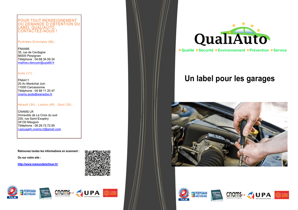 POUR TOUT RENSEIGNEMENT OU DEMANDE D’OBTENTION DU LABEL QUALIAUTO, CONTACTEZ-NOUS ! Pyrénées-Orientales (66) : FNAA66 35, rue de Cerdagne 66000 Perpignan Téléphone : 04.68.34.59.34 [email protected] Qualité Sécurité Environnement Prévention Service Aude (11) : FNAA11 20 Av Maréchal Juin 11000 Carcassonne Téléphone : 04 68 11 20 47 [email protected] Hérault (34) ; Lozère (48) ; Gard (30) : CNAMS LR Immeuble de La Croix du sud 230, rue Saint-Exupéry 34130 Mauguio Téléphone : 06.29.72.72.95 [email protected] Retrouvez toutes les informations en scannant : Ou sur notre site : http://www.maisondelartisan.fr/ Un label pour les garages Label “Garage QualiAuto” UNE REPONSE AUX EXIGENCES PLURIELLES DE LA PROFESSION Qualité Sécurité Environnement Prévention Service Le secteur de l’automobile assiste à une sophistication de l’offre et de la demande. La montée en puissance des exigences rencontrées dans les relations clients, les relations de travail, les relations environnementales ont un impact direct sur la performance des entreprises. Un label gratuit, témoin des performances de l’entreprise Désormais, le degré de performance d’un garage ne se limite pas à la délivrance d’une prestation de service technique conforme à la commande. UN LABEL RECONNAISSABLE DE TOUS Le Label « Garage QualiAuto » est un outil proposé par COMMENT OBTENIR LE LABEL “GARAGE QUALIAUTO” ? Le garage s’auto-évalue à l’aide d’un référentiel contenant des critères dont le degré de satisfaction est mesuré à l’aide d’un système de notation : la FNAA pour apporter une réponse aux exigences CLIENTS plurielles de la profession et valoriser les performances économiques, sociales et environnementales des DONNEURS D’ORDRE FNAA 66 AGENCE DE L’EAU garages. Ce label permet de également de bénéficier d’un accompagnement individualisé. UN LEVIER POUR L’ATTRACTIVITE DES GARAGES AUTOMOBILES RHONE L’obtention du Label « Garage QualiAuto » MEDITERRANEE témoigne de l’existence, au sein d’un CORSE garage automobile (mécanique ou carrosserie automobile), d’une démarche qualité dont le niveau est reconnu par COMMUNAUTE plusieurs partenaires. D’AGGLOMERATION Le garage met ainsi en avant ses engagements en matière PERPIGNAN de : MEDITERRANEE - développement durable ; - prestations de service ; - sécurité au travail dans les ateliers de réparation. En étant labellisé, le garage apporte la garantie de sa performance aux clients, fournisseurs, salariés et administrations publiques territoriales. Un technicien rend ensuite visite au garage pour apprécier l’évaluation et proposer éventuellement des outils et conseils à l’entreprise. Au terme de la visite, une commission se réunit pour prendre une décision quant à la délivrance du label. Le Label « Garage QualiAuto » est obtenu pour une durée de deux ans et l’entreprise labellisée pourra s’en prévaloir dès son obtention, grâce à la délivrance d’une attestation et d’une vitrophanie. Elle pourra également inclure le logo dans toute sa communication.