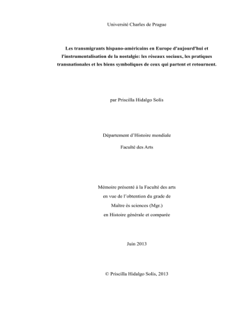 Université Charles de Prague Les transmigrants hispano-américains en Europe d'aujourd'hui et l'instrumentalisation de la nostalgie: les réseaux sociaux, les pratiques transnationales et les biens symboliques de ceux qui partent et retournent. par Priscilla Hidalgo Solís Département d‟Histoire mondiale Faculté des Arts Mémoire présenté à la Faculté des arts en vue de l‟obtention du grade de Maître ès sciences (Mgr.) en Histoire générale et comparée Juin 2013 © Priscilla Hidalgo Solís, 2013 Je, soussignée Priscilla Hidalgo Solís Atteste que le présent mémoire a été écrit indépendamment, que ce travail est personnel et que toutes les sources d‟informations externes et les citations d‟auteurs ont été mentionnées conformément aux Prague, 24 Mai 2013 usages en vigueur. RÉSUMÉ Ce mémoire de maîtrise présente les résultats d'une recherche sur la migration d'Hispano-américains à Prague. En s'appuyant sur l'approche théorique du transnationalisme, ce mémoire présente une description empirique des liens existant entre les transmigrants hispano-américains et leur ville de résidence, en analysant les réseaux migratoires et les pratiques transnationales que surgissent pendant l´expérience migratoire. Nous souhaitons démontrer dans quelle mesure la migration transnationale va fomenter l'échange des biens symboliques entre le pays natal et le pays d'accueil des transmigrants, et comment cet échange est quelquefois déclenché par le sentiment de nostalgie. Le portrait des réseaux migratoires, pratiques transnationales et l'échange de biens symboliques joints au témoignage des transmigrants dans le cadre de cette recherche, constituent des éléments d´analyse principaux. Ils éclairciront la nature des relations établies et expériences vécues par les transmigrants dans une région qui restait inexplorée jusqu'à aujourd'hui. Mots-clés : transnationalisme, champs sociaux, transmigrants, réseaux sociaux, pratiques transnationales, biens symbolique et nostalgie. 1 SHRNUTÍ Tato diplomová práce prezentuje výsledky šetření o transmigrační praxi a integraci hispánských Američanů v Praze. Zkoumá procesy, které souvisí s pracovní a ekonomickou migrací, která není vystěhovalectvím, ale opakovaným procesem vyjíţdění a návratů. Autorka se v této souvislosti opírá o teoretický přístup známý jako transnationalismus a koncept transmigrace. Její výzkum představuje empirický popis existujících vazeb mezi transmigranty a jejich domovskou zemí na jedné straně a jejich novými vazbami utvářenými v místě jejich nového bydliště. Studie analyzuje praktické postupy, které vedou k utváření migrační sítě (sítě migrantů) jako výsledek praxe v průběhu migrace. Práce prokazuje, ţe mezinárodní migrace podněcuje výměnu tzv. symbolického zboţí (Bourdieu) mezi zemí původu a zemí přijímající transmigranty. Tato výměna je často způsobena pocitem nostalgie, která je často spojena se zkušenostmi transmigrantů. Autorka se zaměřujeme na portrét migračních sítí a na identifikaci různých strategií přistěhovalců z Latinské Ameriky. Objevuje nadnárodní postupy migrantů, jejich integrační strategie a nástroje, které jim usnadňují udrţet kontakt se svou vlastí, a nativní civilizací/ kulturou.Výměna symbolických výrobků je jedním z velmi důleţitých nástrojů. Z výpovědí transmigrantů, které tvoří kostru tohoto šetření, z výzkumu působení institucí zprostředkujících kulturní kontakty mezi hispánským světem a českou společností (Instituto Cervantes, rozhlasové vysílání, akademická pracoviště, neformální sítě na Facebook, restaurace apod.) jsme mohli rekonstruovat obraz o fungování hispánskoamerické komunity, vztahů mezi migranty, jejich výchozím prostředím a jejich přijímajícím prostředím. Téma hispánsko-americké migrace v Praze je tématem novým, neprozkoumaným, neboť i jev transmigrace v této oblasti střední Evropy je relativně nový. Klíčová slova: transnacionalismus, sociální oblasti, transmigrace, sociální sítě, nadnárodní postupy, symbolické zboţí a nostalgie. 2 SUMMARY This MA thesis presents the results of an investigation about the Hispanic Americans in Prague. Relying on a transnationalist theoretical approach, this research presents an empirical description about the existing ties between the transmigrants and their city of residence, analyzing the migration networks and the transnational practices that arise during the migratory experience. We wish to demonstrate the measure in which the transnational migration is going to foment the exchange of symbolic goods between the country of origin and the country of reception of the transmigrant, and how this exchange is often triggered by the feeling of nostalgia that is frequently associated with the transmigrants experience. To approach these problems in the thesis we focus on the portrait of the migration networks, and on various strategies adopted by migrants from Latin America. Thus we are able to discover the transnational practices of migrants, their integration strategies, and the tools which facilitate to keep the contact with their homeland, and native civilization/culture. The exchange of symbolic goods is one of the very important instruments. We discover them through the testimonies of the transmigrants, which constitute the frame of this investigation, and function as a window on the nature of the established relations and the experiences lived by the transmigrants in a region that remains unexplored until now. Key words: transnationalism, social fields, transmigrants, social networks, transnational practices, symbolic goods and nostalgia. 3 RESUMEN Esta tesis de maestría presenta los resultados de una investigación acerca de los hispanoamericanos en Praga. Apoyándose en un enfoque teórico transnacionalista, es