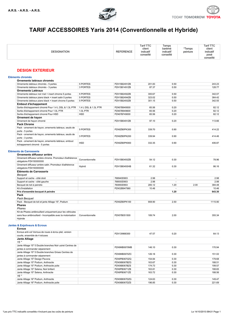 A.R.S. - A.R.S. - A.R.S. TARIF ACCESSOIRES Yaris 2014 (Conventionnelle et Hybride) DESIGNATION REFERENCE Tarif TTC client indicatif conseillé Temps barèmé indicatif conseillé Tarif TTC client indicatif posé conseillé *Temps peinture DESIGN EXTERIEUR Eléments chromés Ornements latéraux chromés Ornements latéraux chromés - 5 portes Ornements latéraux chromés - 3 portes 5 PORTES 3 PORTES PZ415B2491ZB PZ415B1491ZB 201.83 87.37 0.50 0.50 243.23 128.77 5 PORTES 5 PORTES 5 PORTES PZ415B2492ZB PZ415B2494ZB PZ415B2493ZB 300.67 323.02 301.15 0.50 0.50 0.50 342.07 364.42 342.55 1.4 L DSL & 1.3L PTR 1.0L PTR HSD PZ467B949500 PZ467B949600 PZ467B749000 65.56 65.56 65.56 0.20 0.20 0.20 82.12 82.12 82.12 PZ415B0491ZB 97.10 0.20 113.66 5 PORTES PZ49ZB0PK300 339.70 0.90 414.22 3 PORTES PZ49ZB0PK200 339.94 0.90 414.46 HSD PZ49ZB0PK900 332.35 0.90 406.87 PZ415B0493ZB 54.12 0.30 78.96 PZ415B0493HB 61.32 0.30 86.16 768940D903 768930D903 760850D903 PZ402B947560 2.98 2.98 285.12 10.46 1.20 1.20 2.98 2.98 384.48 10.46 643.30 PZ49ZB0PK100 908.90 2.50 1115.90 PZ457B051500 189.74 2.00 355.34 PZ4139968300 47.57 0.20 64.13 PZ49MB0670MB 146.10 0.30 170.94 PZ49MB0670ZC 126.18 0.30 151.02 PZ49PB0670ZQ PZ406B067BZG PZ406B067BZS PZ49PB0671ZB PZ49PB0671ZE 154.84 163.67 174.73 163.81 163.72 0.30 0.30 0.30 0.30 0.30 179.68 188.51 199.57 188.65 188.56 PZ406B067DZG PZ406B067DZS 124.63 196.85 0.30 0.30 149.47 221.69 Ornements Latéraux Ornements latéraux noir mat + insert chrome 5 portes Ornements latéraux piano black + insert satin 5 portes Ornements latéraux piano black + insert chrome 5 portes Embout d'échappement Sortie d'échappement chromé Pour 1.4 L DSL & 1.3L PTR Sortie d'échappement chromé Pour 1.0L PTR Sortie d'échappement chromé Pour HSD Ornement de hayon Ornement de hayon chromé Pack Chrome Pack - ornement de hayon, ornements latéraux, seuils de porte - 5 portes Pack - ornement de hayon, ornements latéraux, seuils de porte - 3 portes Pack - ornement de hayon, ornements latéraux, embout échappement chromé - 5 portes Eléments de Carrosserie Ornements diffuseur arrière Ornement diffuseur arrière chrome. Promoteur d'adhérence Conventionnelle obligatoire PZ4150000000 Ornement diffuseur arrière satin. Promoteur d'adhérence Hybrid obligatoire PZ4150000000 Eléments de Carrosserie Becquet Support et cache - côté droit Support et cache - côté gauche Becquet de toit à peindre Kit d'installation Prix d'ensemble becquet A peindre 2.00 Pack Pack Becquet Pack - Becquet de toit et jante Alliage 15", Podium Phares Phares Kit de Phares antibrouillard uniquement pour les véhicules sans feux antibrouillard - Incompatble avec la motorisation Hybride Conventionnelle Jantes & Enjoliveurs & Ecrous Ecrous Ecrous anti-vol Verrous de roues à écrou plat, version courte, ensemble de 4 écluses Jante Alliage 15 " Jante Alliage 15" 5 Double branches Noir usiné Centres de jantes à commander séparement Jante Alliage 15" 5 Double branches Grises Centres de jantes à commander séparement Jante Alliage 15" Design Pavona Jante Alliage 15" Podium, Anthracite Jante Alliage 15" Podium, Anthracite polie Jante Alliage 15" Selena, Noir brillant Jante Alliage 15" Selena, Anthracite 16 " Jante Alliage 16" Podium, Anthracite Jante Alliage 16" Podium, Anthracite polie *Les prix TTC indicatifs conseillés n'incluent pas les coûts de peinture Le 14/10/2015 09h31 Page 1 A.R.S. - A.R.S. - A.R.S. TARIF ACCESSOIRES Yaris 2014 (Conventionnelle et Hybride) DESIGNATION REFERENCE Tarif TTC client indicatif conseillé Temps barèmé indicatif conseillé Tarif TTC client indicatif posé conseillé *Temps peinture Centre de jante - Grand modèle Les centres de jantes grand modèles doivent OBLIGATOIREMENT être associés à un anneau centre de jante Pour jantes 5 doubles branches Grand centre de jante noir mat logo noir brillant Grand centre de jante noir brillant logo chromé Grand centre de jante gris logo chromé Grand centre de jante noir mat logo chromé Prix unitaire Prix unitaire Prix unitaire Prix unitaire PZ493986722D PZ493986722A PZ493986722C PZ493986722B 21.60 21.60 21.60 21.60 - 21.60 21.60 21.60 21.60 Prix unitaire Prix unitaire Prix unitaire Prix unitaire Prix unitaire Prix unitaire Prix unitaire Prix unitaire Prix unitaire Prix unitaire Prix unitaire Prix unitaire PZ493986723L PZ493986723N PZ493986723J PZ493986723K PZ493986723M PZ493986723P PZ493986723E PZ493986723G PZ493986723C PZ493986723I PZ493986723B PZ493986723A 14.80 14.80 14.80 14.80 14.80 14.80 10.48 10.48 10.48 10.48 10.48 10.48 - 14.80 14.80 14.80 14.80 14.80 14.80 10.48 10.48 10.48 10.48 10.48 10.48 426110D580 62.41 0.30 87.25 426110D600 118.25 0.30 143.09 PZ416B996800 PZ416B996600 33.26 30.49 0.60 0.30 82.94 55.33 3 PORTES 5 PORTES PZ415B185000 PZ415B285000 73.69 73.69 0.50 0.50 115.09 115.09 5 PORTES 3 PORTES 0861152860 PZ451B0531ZA 91.26 79.85 0.60 0.40 140.94 112.97 PZ49UB052000 76.06 0.80 142.30 PZ438B018200 PZ438B002000 9.43 46.99 0.50 0.50 50.83 88.39 PZ49UB054000 58.40 0.20 74.96 PZ467B0521ZB 126.96 0.20 143.52 PZ464B042700 148.28 1.00 231.08 PZ464T342055 9.78 0.10 18.06 78.04 97.10 120.91 103.40 103.40 103.40 103.40 103.40 103.40 - Anneau centre de jantes Anneau bronze 4V8 Anneau bleu 8S7 Anneau blanc 084 Anneau rouge 3N8 Anneau bleu 783 Anneau bleu 8T7 Anneau blanc 068 Anneau rouge 3P0 Anneau gris métallisé Anneau gris foncé 1E0 Anneau noir Anneau chrome Jante Tôle 14" Jante Tôle 14" Merci de respecter la monte d'origine 15 " Jante Tôle 15" Merci de respecter la monte d'origine PROTECTIONS DE CARROSSERIE ET SECURITE Protections Bavettes Bavettes Set arrière Bavettes Set avant Baguettes Latérales Jeu de baguettes de protection latérale - noir Jeu de baguettes de protection latérale - noir Déflecteurs Déflecteurs de vent avant ( compatible 5 portes) Déflecteurs de vent avant ( compatible 3 portes) Protections d'angles de pare-choc Protections d'angles de pare-chocs Films Film de protection des poignées de portes avant Film de pro