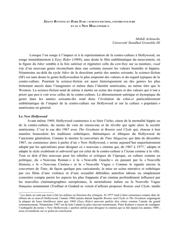 SILENT RUNNING ET DARK STAR : SCIENCE-FICTION, CONTRE-CULTURE ET LE « NEW HOLLYWOOD » Mehdi Achouche Université Stendhal Grenoble III Lorsque l’on songe à l’impact et à la représentation de la contre-culture à Hollywood, on songe immédiatement à Easy Rider (1969), sans doute le film emblématique du mouvement, où la figure du biker semble à la fois satiriser et régénérer celle du cow-boy sur sa monture, road trip d’un nouveau genre réconciliant dans une certaine mesure les valeurs beatniks et hippies. Néanmoins au-delà du cycle biker de la deuxième partie des années soixante, la science-fiction (SF) est sans doute le genre hollywoodien le plus empreint des valeurs et du regard typiques de la contre-culture. Pourtant la science-fiction est aussi historiquement un des genres les plus fortement ancrés dans l’imaginaire et même dans l’identité américaine, au même titre que le Western. La science-fiction tend de même à mettre en scène des tropes et des valeurs qui n’ont a priori que peu à voir avec celles de la contre-culture. Le détournement satirique et dystopique du genre dans les années soixante-dix rend donc l’évolution de celui-ci particulièrement emblématique de l’impact de la contre-culture sur Hollywood et sur la culture « populaire » américaine en général. Le New Hollywood Avant même 1969, Hollywood commence à se faire l’écho, sinon de la mentalité hippie ou de la contre-culture, du moins du vent de renouveau et de révolte qui agite alors la société américaine. C’est le cas dès 1967 avec The Graduate et Bonnie and Clyde qui, chacun à leur manière bousculent les traditions esthétiques, thématiques et éthiques du Hollywood de l’ancienne génération. Comme le montre la couverture de Time Magazine qui date de décembre 1967, on commence alors à parler d’un « New Hollywood, » terme aujourd’hui majoritairement adopté par les spécialistes pour désigner ce « nouveau » cinéma qui, de 1967 à 1977,1 adopte et adapte le style exubérant et subversif qui est celui de la contre-culture à l’écran comme à la ville. Tout se doit d’être nouveau pour les rebelles et critiques de l’époque, en culture comme en politique, du « Nouveau Roman » à la « Nouvelle Gauche » en passant par la « Nouvelle Histoire, » le « Nouveau Cinéma » et la « Nouvelle Vague. » Comme le signale encore la couverture de Time, de façon quelque peu caricaturale, la mise en scène narrative et esthétique par ces films d’une violence et d’une sexualité débridées autrefois tabous ou simplement connotées compte parmi les aspects les plus frappants d’un cinéma profondément influencé par les nouvelles cinématographies européennes, le néoréalisme italien ou la Nouvelle Vague française notamment (Truffaut et Godard se voient d’ailleurs proposer Bonnie and Clyde, tandis 1 Les dates ne sont pas tout à fait les mêmes en fonction des critiques. Si 1977 tend à faire consensus comme date de clôture de ce nouvel Hollywood, l’année 1968 (année durant laquelle Bonnie and Clyde et The Graduate engrangent la plupart de leurs bénéfices) ainsi que 1969 (Easy Rider) peuvent parfois être citées comme l’année du grand commencement. Néanmoins 1967 est de loin l’année la plus souvent mentionnée. Peter Krämer a raison de souligner l’ambiguïté du terme « New Hollywood, » parfois utilisé pour désigner le cinéma qui se fait depuis les années 1980 ; nous reviendrons sur ce point en conclusion. que le A bout de souffle de Godard exerce une grande influence sur le film) (Biskind 26-27). Souvent écrits, tournés et interprétés par de jeunes débutants, 2 ces films mettent en scène de jeunes héros insouciants qui s’y rebellent littéralement contre les figures de l’autorité et du système (les parents, la police, l’armée), pratiquent l’amour libre, font l’expérience de la drogue, etc., sans qu’un film comme Bonnie and Clyde assène une morale claire et bienséante à son intrigue.3 Ce dernier film est d’autant plus frappant qu’il reprend et subvertit un des genres majeurs du cinéma hollywoodien, le film de gangster, dont son propre studio de production, la Warner, est l’emblème historique, produisant la plupart des films du genre dans les années trente (époque où se déroule précisément Bonnie and Clyde). Le nouvel Hollywood correspond à la fin de la prédominance des studios dans l’écologie hollywoodienne, au profit surtout du metteur en scène, que l’on commence à qualifier, sous l’influence de la critique française, d’« auteur. » Sous cette même influence le cinéma de genre est réhabilité, les genres les plus conventionnels et les plus commerciaux apparaissant désormais comme capables, du fait même de leurs conventions, de véhiculer une réflexion, voire une subversion, réelle. D’où également pour de nombreux critiques le début du Nouvel Hollywood en 1967 avec Bonnie and Clyde. Comme l’écrit Peter Biskind dans son histoire du Nouvel Hollywood : If the Bond films legitimized government violence, and the Leone films legitimized vigilante violence, Bonnie and Clyde legitimized violence against the establishment, the same violence that seethed in the hearts and minds of hundreds of thousands of frustrated opponents of the Vietnam War. […] Bonnie and Clyde was a movement movie; like The Graduate, young audiences recognized it was ‘theirs’ (Biskind 49). Tous les critiques ne rejoignent pas l’analyse de Biksind, et Peter Sklar souligne l’absence remarquée dans les films de l’époque de la guerre du Vietnam, des luttes afro-américaines et féministes ou encore de l’émergence des sous-cultures gay et lesbiennes : « Film subjects and forms are likely–more likely–to be determined by the institutional and cultural dynamics of motion picture production than by the most frenetic of social upheavals » (Sklar 322). En réalité ces 