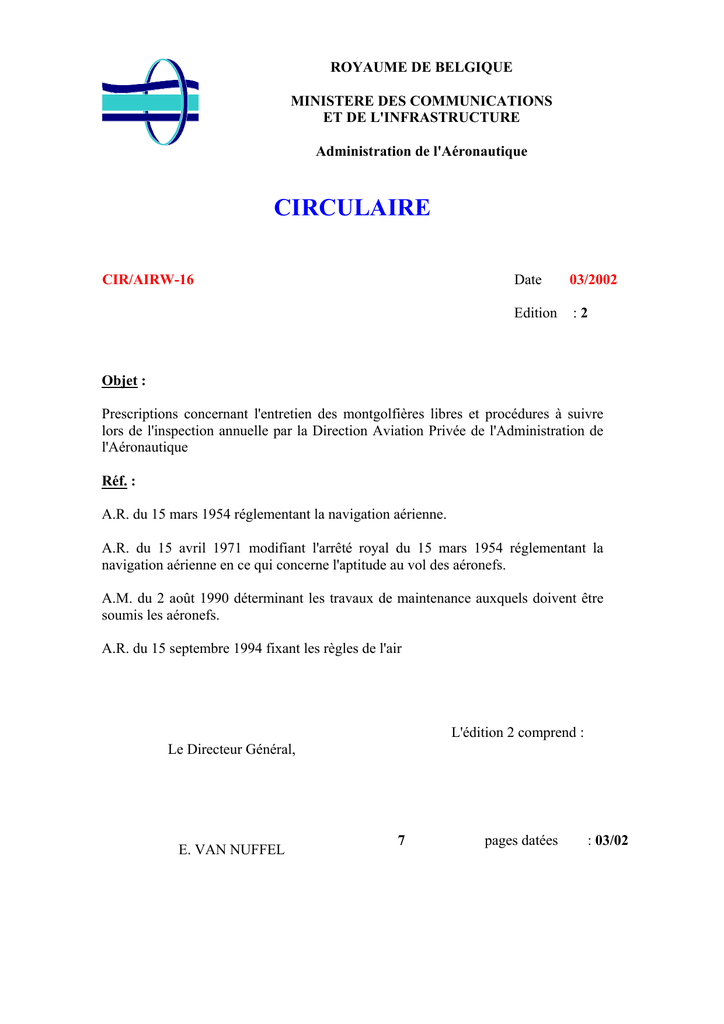 ROYAUME DE BELGIQUE MINISTERE DES COMMUNICATIONS ET DE L'INFRASTRUCTURE Administration de l'Aéronautique CIRCULAIRE CIR/AIRW-16 Date 03/2002 Edition :2 Objet : Prescriptions concernant l'entretien des montgolfières libres et procédures à suivre lors de l'inspection annuelle par la Direction Aviation Privée de l'Administration de l'Aéronautique Réf. : A.R. du 15 mars 1954 réglementant la navigation aérienne. A.R. du 15 avril 1971 modifiant l'arrêté royal du 15 mars 1954 réglementant la navigation aérienne en ce qui concerne l'aptitude au vol des aéronefs. A.M. du 2 août 1990 déterminant les travaux de maintenance auxquels doivent être soumis les aéronefs. A.R. du 15 septembre 1994 fixant les règles de l'air L'édition 2 comprend : Le Directeur Général, E. VAN NUFFEL 7 pages datées : 03/02 1 INTRODUCTION La présente circulaire contient les directives que le propriétaire, l'utilisateur et l'organisme d'entretien doivent suivre lors des travaux d'entretien des montgolfières libres utilisées dans l’aviation privée ou exploitées pour effectuer du travail aérien. 2 BUT Déterminer les travaux d'entretien auxquels doivent être soumis les montgolfières libres, les modalités d'introduction de la demande de délivrance ou de renouvellement du certificat de navigabilité, ainsi que les documents à produire en vue d'établir le maintien de la navigabilité des montgolfières libres. 3 3.1. PRESCRIPTIONS Documentation technique et outillage 3.1.1. Documentation technique Toute personne physique (propriétaire ou utilisateur) ou morale (organisme d'entretien) chargée de la maintenance d'une montgolfière libre doit être en possession de la documentation technique du constructeur relative à cet aéronef, y compris ses accessoires, selon la nature des travaux envisagés. La documentation technique comprend pour chaque type de montgolfière libre et selon la nature des travaux envisagés : le manuel de vol et le manuel de maintenance ; l'abonnement aux publications techniques du constructeur (Service Bulletins, Service Letters, Service Instructions, …). Cette documentation doit être maintenue à jour. Lorsque la documentation technique est inexistante par le fait que l'aéronef est trop ancien ou que le constructeur n'en dispose plus, l'Administration de l'Aéronautique détermine les moyens de preuve appropriés permettant d'établir que l'article 24 de l’ A.R. du 15 mars 1954 est observé. La documentation technique doit toujours être tenue à la disposition du contrôleur de l'Administration de l'Aéronautique lors de l'inspection annuelle. 3.1.2. Outillage Toute personne physique ou morale chargée de la maintenance d'une montgolfière libre doit disposer de l'outillage requis pour la bonne exécution des travaux, selon la nature des travaux envisagés. 3.2. Travaux d'entretien des montgolfières libres Les travaux de maintenance d'une montgolfière libre comprennent : CIR/AIRW-16 – Ed.2 – 03/2002 Page 2 sur 7 - - - les travaux d'inspection et d'entretien préventifs périodiques prévus au programme d'inspection et d'entretien recommandé ou fixé par le constructeur et approuvé par le directeur général de l'Administration de l'Aéronautique ; les travaux de correction des défauts constatés en vol ou au sol ; les travaux d'inspection ou de modification résultant de l'application des bulletins de service (service bulletins) et des consignes ou directives de navigabilité (airworthiness directives, notes techniques de l'Administration de l'Aéronautique, etc.) ; les travaux d'inspection ou de modification résultant du respect des limitations des durées d'utilisation recommandées ou fixées par le constructeur et approuvées par le directeur général de l'Administration de l'Aéronautique. Toutes les inspections, toutes les réparations et tous les travaux de maintenance des montgolfières libres et des leurs éléments doivent être réalisés selon les prescriptions du constructeur. Une distinction est faite entre les travaux simples d'entretien et de réparation d'une part et les travaux approfondis d'entretien et de réparation d'autre part. 3.2.1. Travaux simples d'entretien et de réparation Les travaux simples d'entretien et de réparation sont ceux qui peuvent être effectués par le propriétaire ou l'utilisateur. Ces travaux sont décrits dans le manuel de vol ou dans le manuel de maintenance du constructeur. 3.2.2. Travaux approfondis d'entretien et de réparation Les travaux approfondis d'entretien et de réparation (y compris l'inspection 100 heures) à l'enveloppe, aux brûleurs, à la nacelle et aux instruments doivent être effectués soit par le constructeur, soit par un organisme d'entretien agréé par l'Administration de l'Aéronautique. L'organisme d'entretien ne peut effectuer ces travaux d'entretien que s'il a obtenu une autorisation écrite à cet effet de l'Administration de l'Aéronautique. La demande relative à cette autorisation doit être accompagnée d'une copie de la déclaration du constructeur attestant que le(s) technicien(s) de l'organisme d'entretien est (sont) compétent(s) pour effectuer lesdits travaux d'entretien. Une copie du rapport des travaux d'entretien et des réparations doit toujours être remise au propriétaire de la montgolfière libre. L'inspection 100 heures doit être réalisée annuellement ou toutes les 100 heures, selon le cas qui se présente en premier lieu. L'inspection 100 heures peut être effectuée par le propriétaire s'il possède une autorisation à cet effet, délivrée par la Direction Aviation Privée (DAP). Le propriétaire ne peut réaliser ces travaux que sur les montgolfières libres immatriculées à son nom. CIR/AIRW-16 – Ed.2 – 03/2002 Page 3 sur 7 La demande d’obtention de cette autorisation doit être accompagnée d'une copie de la déclaration du constructeur attestant que le propriétaire est compétent pour effectuer lesdits travaux d'entretien. Le propriéta