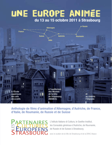 une Europe animée du 13 au 15 octobre 2011 à Strasbourg Russie Allemagne France Suisse Autriche Roumanie Italie à l'École supérieure des arts décoratifs à l'auditorium des Musées de la Ville de Strasbourg (MAMCS) et au cinéma l'Odyssée Anthologie de films d’animation d’Allemagne, d’Autriche, de France, d’Italie, de Roumanie, de Russie et de Suisse L'Istituto Italiano di Cultura, le Goethe-Institut, les Consulats généraux d’Autriche, de Roumanie, de Russie et de Suisse à Strasbourg avec le soutien de la Ville de Strasbourg et de la DRAC Alsace Carte blanche à l’Ecole Supérieure des Arts Décoratifs de Strasbourg Jeudi 13 octobre à 18 h 30 à l’auditorium de l’ESAD Réalisations d'élèves de 2007 à 2011 * L’amour m’anime Chloé Mazlo, 2007, 9’30 A Le travailleur Lémuel Malicoutis, 2008, 3’15 Dithyrambe, la naissance de la vigne B Brice Tourneux, 2008, 2’45 C Le sommet Lise Grossmann, 2008, 6’ D L’épaisseur de la route Maud Guerche, 2009, 5’ E Face to Face Delphine Roux, 2009, 3’10 F Paul & Matha Julie Ledru, 2009, 6’15 G Ils sont parfaits Laura Fernandez, 2010, 4’ H Définition personnelle de la paresse Agathe Bouvachon, 2011, 2’40 I Amazone Nelly Zagury, 2011, 2’20 J Strasbourg, souvenirs de demain Amélie Pélégrin, 2011, 5’10 K Hybridation Marion Delarue, 2011, 1’20 K Complainte Fabienne Wagenaar, 2011, 6’ K Hunden (chiens) Fabienne Wagenaar, 2011, 1’30 K Mots d’histoires Mélanie Vialaneix, 2011, 5’30 entrée libre Séance jeune public Séance tout public Vendredi 14 octobre à 14 h 30 à l’auditorium des Musées (MAMCS) Vendredi 14 octobre à 20 h 30 K Laokoongruppe: Walzerkönig (La valse du roi) Adnan Popovic, 2009, 5’, D + C Konkord L Paris Recyclers Nikki Schuster, 2011, 5’40, Tresfilm M J – La casa dei poveri (La maison des pauvres) Virgilio Villoresi, 2009, 4’10 N Sputnik 5 Susanna Nicchiarelli, 2009, 6’30, B5, Nicchia Film O Winter Sonata Yves Gutjahr, 2009, 6’, Hochschule Luzern P Pink Nanuq Jeanine Reutemann, 2009, 6’ Hochschule Luzern Black Fantastic (Noirs fantastiques) Q Calin Pop, 2010, 6’ R Bad Habits (Les mauvaises habitudes) Oana Gheorghiu, 2009, 10’20 S Cyber Stefan Eling, 2007, 5’, Stephan Eling Moving Pictures T Das Floss (Le radeau) Jan Thüring, 2004, 10’ FilmAkademie Baden-Württemberg U Tikhaya istoriya (Histoire tranquille) Alexey Demin, 2003 10’, Master-film Company V Devotchka doura (La fille sotte) Zoya Kireeva, 2006, 7’, A-film Studio W Danny Boy Marek Skrobecki, 2010 Archangel Film Group / Se-Ma-For Production X Laterarius Marina Rosset, 2010, 4’, Swiss-Films Y Ariadne’s Thread (Le fil d’Ariane) Bertoti Attila, 2009, 9’, Inforg Studio, Argo, Sapienta EMTE Z V.L.C. (Vive la crise) Alexei Gubenco, 2009, 3’ Fenster mit Aussicht (Fenêtre avec vue) * Vera Lalyko, 2001, 9’ Kunsthochschule für Medien Köln A Kein Platz für Gerold (Pas de place pour Gerold) Daniel Nocke, 2006, 5’, Studio Film Bilder Tuzik B Agamurad Amanov, 2001, 7’, Master-Film Company C Antonio Vivaldi (Tales of the Old Piano) Irina Margolina, 2007, 13’ Studio M.I.R D Robin Hood (Robin des Bois) Gianluigi Toccafondo, 2010, 6’ Acme Filmworks, Universal Studios Contrappassouno (La loi du talion premier) E Massimo « Niba » Barbini et Matteo Giacchella, 2004, 7’ F In Transit Reinhold Bidner, 2009, 5’50 G All People is Plastic Harald Hund, 2005, 12’ entrée libre au cinéma Odyssée entrée libre Séance Jeune public Séance tout public Samedi 15 octobre à 14 h Samedi 15 octobre à 16 h à l’auditorium des Musées (MAMCS) à l’auditorium des Musées (MAMCS) H Frère Benoît et les grandes orgues Michel Dufourd, 2010, 8’, Nadasdy Film Little Eden I Nino Christen, 2009, 6’, Hochschule Luzern J Sophia’s Sofa (Le canapé de Sofia) Thomas Aigelsreiter, 2001, 3’ Auge Animated K Seemannstreue (La fidélité du marin) Anna Kalus, 2008, 10’ L Ecco, é ora (Voilà, c’est maintenant) Magda Guidi, 2004, 3’20 Senza testa (Sans tête) M Michele Bernardi, 2009, 4’50 N Urban Tree Vali Chincisan, 2009, 8’45 O How to Deal With Non Sense (Comment faire face au non-sens) Veronica Solomon, 2010, 4’50 P Der Bettnässer (L’incontinent) Ingo Schiller, Stephan-Flint Müller, 2007, 5’ Kater (Chat) Q Tine Kluth, 2005, 13’ Filmakademie Baden-Württemberg R Pisma Roberta Schuman Letters Skazki starogo Pianino (Lettres - Contes du vieux piano) Irina Margolina, 2009, 10’, Studio M.I.R S Attractsion (Attraction) Alexey Demin, 1995, 3’, Studio Shar S Fast Film Virgil Widrich, 2003, 14’, Minotaurus Film La T Belle et la Bête Bady Minck, 2005, 3’, Minotaurus Film U Pinocchio Gianluigi Toccafondo, 1999, 6’, la Sept Arte V Sensi (Sens) Andrea Gallo, Nicola Moretti, Mario A. Rincon, 2006, 1’30, Sugodesign W Prostaya istoriya (Histoire simple) Agamurad Amanov, 2003, 4’ Studio Guberniya Y Maltchik (Petit garçon) Anna Karpova, 2008, 15’50, A-film Studio Z Allerleirauh (Toutes fourrures) Anja Struck, 2004, 8’ Kunsthochschule für Medien Köln Tagebuch einer perfekten Liebe * (Le journal d'un parfait amour) Sebastian Peterson, 2007, 13’ A Grand Café Bogdan Mihailescu, 2009, 9’ B O Brave New World (Ô courageux nouveau monde) Marius Si Pandele, 2010, 2’40 Miramare C Michaela Müller, 2009, 8’ Academy of Fine Arts Zagreb E Retouches Georges Schwizgebel, 2008, 5’20 Studio GDS, NFB Canada, TSR, ARTE entrée libre entrée libre Russie Allemagne France Suisse Autriche Roumanie Italie Films sélectionnés PAR PAYS Roumanie Allemagne Ariadne’s Thread (Le fil d’Ariane) V.L.C. (Vive la crise) Grand Café O Brave New World Jeune public Black Fantastic (Noirs fantastiques) Bad Habits (Les mauvaises habitudes) Urban Tree How to Deal With Non Sense Tagebuch einer perfekten Liebe (Journal d’un parfait amour) Fenster mit Aussicht (Fenêtre avec vue) Kein Platz für Gerold (Pas de place pour Gerold) Allerleirauh (Toutes fourrures) Jeune public Der Bettnässer (