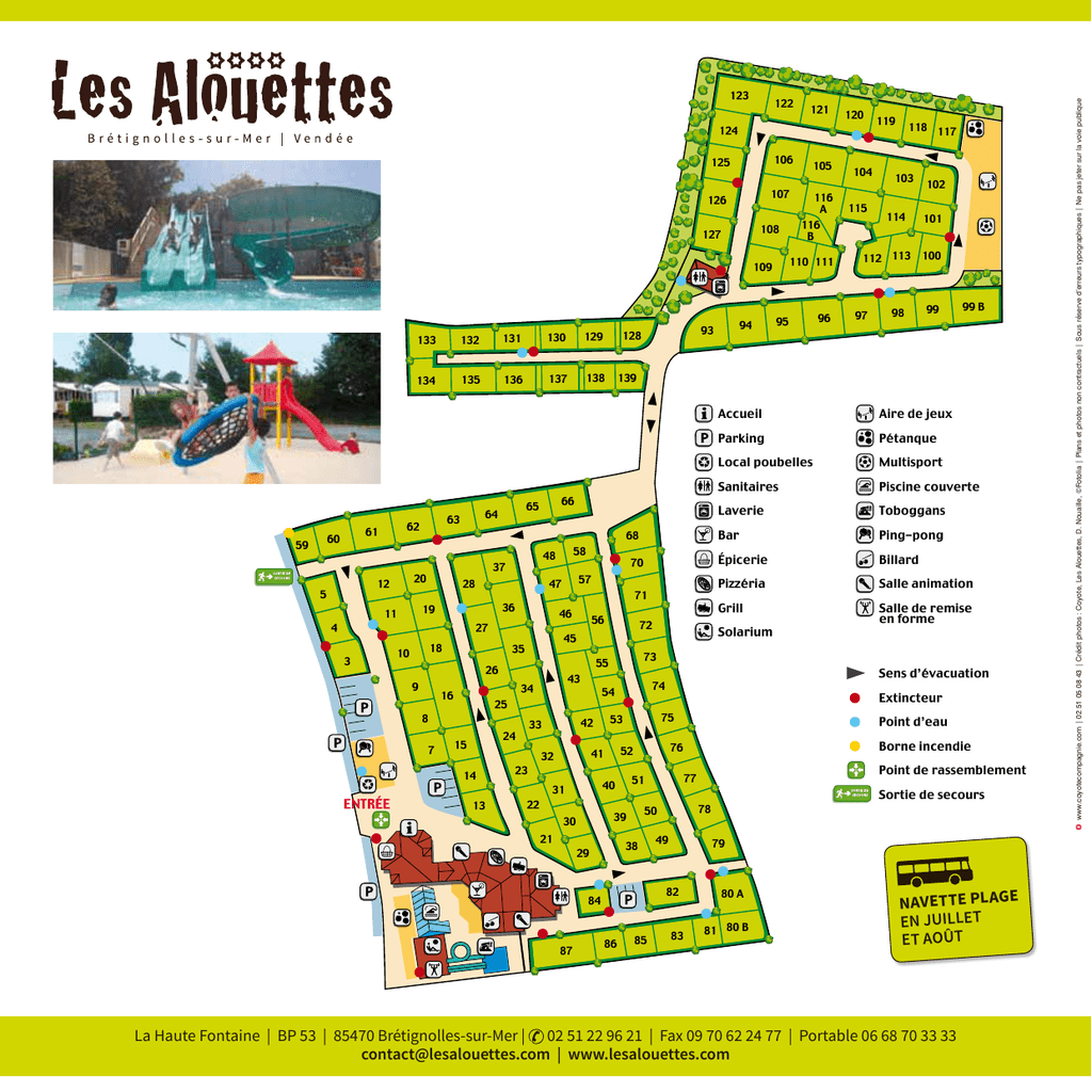 122 121 120 124 106 125 107 126 108 127 60 59 131 130 129 134 135 136 137 138 3 37 28 18 7 14 13 23 22 99 99 B Pétanque Multisport Sanitaires Piscine couverte Laverie Toboggans Bar Ping-pong Épicerie Billard Pizzéria Salle animation Grill Salle de remise en forme Sens d’évacuation Extincteur Borne incendie 49 Sortie de secours 79 82 85 Point de rassemblement 78 50 84 86 Point d’eau 77 51 38 29 87 98 Local poubelles 76 39 30 21 97 100 Aire de jeux 75 40 31 112 113 101 Parking 74 52 41 32 114 102 Accueil Solarium 53 42 33 24 96 115 103 73 54 25 15 72 55 43 34 16 56 45 35 8 ENTRÉE 71 26 9 70 57 46 27 10 58 47 36 19 11 4 68 48 95 104 118 117 139 66 65 64 63 20 12 5 132 62 61 128 133 94 116 A 116 B 110 111 109 93 105 119 83 80 A 81 80 B NAVETTE PL AGE EN JUILLET ET AOÛT La Haute Fontaine | BP 53 | 85470 Brétignolles-sur-Mer | 02 51 22 96 21 | Fax 09 70 62 24 77 | Portable 06 68 70 33 33 [email protected] | www.lesalouettes.com www.coyotecompagnie.com | 02 51 05 08 43 | Crédit photos : Coyote, Les Alouettes, D. Nouaille, ©Fotolia | Plans et photos non contractuels | Sous réserve d’erreurs typographiques | Ne pas jeter sur la voie publique 123 Connexion WIFI possible sur 100% des emplacements Vous êtes ici... et vous êtes chez vous ! nouveauté Tarifs emplacements 2016 Tarifs à la nuitée de 14h à 12h 02/04 02/07 02/07 30/07 30/07 20/08 20/08 27/08 27/08 24/09 Forfait A : emplacement + 1 à 2 pers. + 1 véhicule 15,00 e 26,00 e 30,00 e 22,50 15,00 e Forfait B : emplacement + 1 à 2 pers. + 1 véhicule + électricité 6A 20,00 e 31,00 e 35,00 e 27,50 e 20,00 e Personne supplémentaire 6,00 e 7,00 e 7,50 e 6,50 e 6,00 e Enfant - 5 ans 5,00 e 5,00 e 5,50 e 5,00 e 5,00 e Voiture supplémentaire 3,00 e 3,00 e 3,00 e 3,00 e 3,00 e Animal tatoué et vacciné 3,00 e 4,00 e 4,50 e 3,50 e 3,00 e Visiteur Gratuit 4,00 e 4,50 e 3,50 e Gratuit Garage mort 4,50 e - - - 4,50 e Forfait camping car du 02/04 au 02/07 et du 27/08 au 25/09 2 personnes + 1 camping-car 12 e + électricité 2 e + chien 2 e personne supplémentaire 2 e 2016 Nos prix comprennent : l’emplacement de 70 à 100 m2 ombragé ou ensoleillé avec la place pour un véhicule, le nombre de personnes mentionné sur le contrat (6 maxi), le branchement électrique suivant forfait, la consommation d’eau potable, l’accès aux sanitaires, à la salle de jeux, aux aires de jeux et à la piscine. À l’exception de la taxe de séjour du 1er avril au 30 septembre : 0,61 e / jour / personne de + 18 ans (base 2015). Pour faciliter votre séjour, sanitaires de qualité avec lavabos individuels, douches chaudes gratuites, salle de bains pour bébés, laverie, vidoir toilettes chimiques, sanitaires adaptés aux personnes à mobilité réduite. La Haute Fontaine | BP 53 85470 Brétignolles-sur-Mer Tél 02 51 22 96 21 Fax 09 70 62 24 77 Portable 06 68 70 33 33 [email protected] www.lesalouettes.com Tarifs locatifs 2016 NOUVEAUTÉ ! Location du 02/07 au 27/08 En juillet et août, réservez votre locatif à partir de 3 nuits ! Arrivée à partir de 15h et départ à partir de 9h, le mercredi ou le samedi. A • Bungalow toilé 4/5 pers. | Meublé 25 m 2 + terrasse bois (- 7 ans) Sans sanitaire. Séjour/cuisine équipé d’un plan de travail avec deux feux intégrés, 1 chambre avec un lit 140x190cm, 1 chambre avec 3 lits simples 80x190cm dont 1 superposé, terrasse bois avec auvent de 9 m2 et salon de jardin. 4 +1 02/07 06/07 06/07 09/07 09/07 13/07 13/07 16/07 16/07 20/07 20/07 23/07 23/07 27/07 27/07 30/07 30/07 03/08 03/08 06/08 06/08 10/08 10/08 13/08 13/08 17/08 17/08 20/08 20/08 24/08 24/08 27/08 4 NUITS 3 NUITS 4 NUITS 3 NUITS 4 NUITS 3 NUITS 4 NUITS 3 NUITS 4 NUITS 3 NUITS 4 NUITS 3 NUITS 4 NUITS 3 NUITS 4 NUITS 3 NUITS 285€ 220 e 450€/semaine 22 e 17 e 35 €/semaine 335 e 260 e 530 e/semaine 22 e 17 e 35 €/semaine 335€ 260 e 530 e/semaine 22 e 17 e 35 €/semaine 365 e 285 e 580 e/semaine 22 e 17 e 35 €/semaine 430 e 335 e 680 e/semaine 22 e 17 e 35 €/semaine B • Mobil-home Confort 430 e 335 e 680 e/semaine 22 e 17 e 35 €/semaine 430 e 335 e 680 e/semaine 22 e 17 e 35 €/semaine 225 e 175 e 360 e/semaine 22 e 17 e 35 €/semaine 2/4 pers. | Toit double pente 20 à 22 m 2 + terrasse bois (- de 10 ans) Espace salon/repas avec banquette, coin cuisine équipé d’une plaque de cuisson, évier, eau chaude, chauffage, 1 chambre avec 1 lit 140x190cm, 1 chambre avec 2 lits séparés 70x190cm, salle d’eau avec cabine de douche et lavabo, WC séparés, terrasse semi-couverte et salon de jardin. 2 +1 02/07 06/07 06/07 09/07 09/07 13/07 13/07 16/07 16/07 20/07 20/07 23/07 23/07 27/07 27/07 30/07 30/07 03/08 03/08 06/08 06/08 10/08 10/08 13/08 13/08 17/08 17/08 20/08 20/08 24/08 24/08 27/08 4 NUITS 3 NUITS 4 NUITS 3 NUITS 4 NUITS 3 NUITS 4 NUITS 3 NUITS 4 NUITS 3 NUITS 4 NUITS 3 NUITS 4 NUITS 3 NUITS 4 NUITS 3 NUITS 300 e 235 e 480€/semaine 22 e 17 e 35 €/semaine 365 e 285 e 580 e/semaine 22 e 17 e 35 €/semaine 365 e 3285 e 580 e/semaine 22 e 17 e 35 €/semaine 395 e 310 e 625 e/semaine 22 e 17 e 35 €/semaine 485 e 380 e 760 e/semaine 22 e 17 e 35 €/semaine C • Mobil-home Loisirs 485 e 380 e 760 e/semaine 22 e 17 e 35 €/semaine 485 e 380 e 760 e/semaine 22 e 17 e 35 €/semaine 285 e 225 e 440 e/semaine 22 e 17 e 35 €/semaine 4/6 pers. | Ancienne génération | toit double pente 25 à 27 m 2 + terrasse bois (entre 10 et 17 ans) Espace salon/repas avec banquette convertible 120x190cm, coin cuisine équipé d’une plaque de cuisson, évier, eau chaude, chauffage, 1 chambre avec 1 lit 140x190cm, 1 chambre avec 2 lits séparés 70x190cm, salle d’eau avec cabine de douche, lavabo et WC séparés pour certains modèles, terrasse semi-couverte et salon de jardin. 4 +1 02/07 06/07 06/07 09/07 09/07 13/07 13/07 16/07 16/07 20/07 20/07 23/07 23/07 27/07 27/07 30/07 30/07 03/08 03/08 06/08 06/08 10/08 10/08 13/08 13/08 17/08 17/08 20/08 20/08 24/08 24/08 27/08 4 NUITS 3 NUITS 4 NUITS 3 NUITS 4 NUITS 3 NUITS 4 N