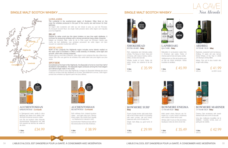 La LA Cave single Malt scotch whisky Orkney lOWLANDS The Lowlands is the southernmost region of Scotland. Often floral on the nose the whiskies produced in this part of the country are well known for their lightness. La région des Lowlands est celle qui est située la plus au sud de l’Ecosse. Au bouquet souvent fleuri, les single malts produits dans cette région sont réputés pour leur légèreté. TRAVEL retail TRAVEL retail exclusive exclusive ISLAY Inverness Speyside Aberdeen Highlands Jura Edinburgh Glasgow Islay Campbeltown Despite its rather small size this island shelters no less than eight distilleries. It is known for producing whiskies with a strong sometimes heavy peaty character. Malgré sa modeste taille, cette île de la côte ouest de l’Ecosse n’abrite pas moins de huit distilleries. Les whiskies provenant de cette région ont bien souvent un caractère tourbé bien affirmé. HIGHLANDS Dundee North of the Lowlands the Highlands region includes some islands nestled on the west coast of Scotland. It offers a wide diversity of whiskies, some light and smooth, other with a strong character. Située juste au nord des Lowlands, cette région inclut certaines îles des côtes écossaises. Elle offre une gamme de whiskies très variés allant des plus légers aux plus racés. SPEYSIDE Lowlands Considered as the heart of the Highlands, the Speyside is home to more than half of Scotland’s malt distilleries. The Speyside region produces among the most elegant and refined single malts in the world. Considérée comme le coeur des Highlands, la région du Speyside héberge plus de la moitié du nombre total des distilleries en Ecosse. Mondialement connue, cette région produit des whiskies qui figurent parmi les plus raffinés. TRAVEL retail NEW smokehead laphroaig ardbeg Rich, seaweedy and intensely peaty whisky. The flavour is fresh, fruity and immense, with notes of sherry, iodine, toffee, smoke and sea salt. Maturation in ex-bourbon casks then in American oak casks. Notes of intense peat smoke and spicy vanilla. Explosive, exuberant and tumultuous, Ardbeg 10 years old was named World Whisky of the Year in 2008 Jim Murray’s whisky Bible. EXTRA RARE - Islay Whisky tourbé et fumé. Notes de xérès, d’iode, de caramel et de sel marin. Vieillissement en fûts de bourbon puis en fûts de chêne américain. Notes tourbées et vanillées. Arbeg 10yo est le plus tourbé des single malts d’Islay. 1 litre £ 41.99 40% vol 46% vol UK.RRP £ 58.80 1 litre £ 45.99 10 Year old - Islay 40% vol 1 litre £ 35.99 QA CASK - Islay TRAVEL retail exclusive exclusive auchentoshan AUCHENTOSHAN BOWMORE SURF bowmore enigma bowmore mariner In Springwood warm vanilla & citrus lightness are drawn from darkly charred North American bourbon casks Les fûts de bourbon dans lesquels Auchentoshan Springwood est vieilli font ressortir les arômes de vanille et de citron. Soft nuttiness from charred bourbon casks - and dark fruits from Oloroso sherry casks. We cherish them equally - so Heartwood is matured in both. Scent of peat smoke, light zesty fruits with a hint of fresh sea air. It is bursting with warm smoke, oak and honey, balanced with a hint of zesty lime. Initial sweet sherry flavours are followed by a more robust smokiness with a trace of fresh lemon zest. Creamy Oak smokiness with sweet stewed fruits and a hint of sea salt. Auchentoshan Heartwood est vieilli en fûts de bourbon et en fûts d’Oloroso. Single malt d’Islay au goût fumé et tourbé. SPRINGWOOD - Lowlands 1 litre 40% vol 54 Nos Alcools single Malt scotch whisky £34.99 HEARTWOOD - Lowlands 1 litre £ 38.99 43% vol L’abus d’alcool est dangereux pour la santé. À CONSOMMER AVEC MODÉRATION Islay 1 litre 40% vol £ 29.99 12 Year old - Islay Whisky vieilli 12 ans en fûts de sherry. Quelques notes de citron et de miel. 1 litre 40% vol £ 35.49 15 Year old - Islay Une des meilleures bouteilles de la distillerie : tourbée, fumée, avec un petit goût de violette. 1 litre £ 42.99 43% vol L’abus d’alcool est dangereux pour la santé. À CONSOMMER AVEC MODÉRATION 55 La LA Cave single Malt scotch whisky Nos Alcools single Malt scotch whisky TRAVEL retail TRAVEL retail Glen scotia highland park highland park glenmorangie glenmorangie glenmorangie Produced at one of Campbeltown’s 3 distilleries. Nose : spiced, slightly smoky with hints of old ropes and dry herbs. Sea air, smoked barley & honey. With an emphasis on first-fill American oak Sherry casks in its maturation, this vintage reveals the smoky side of Highland Park. Wholly matured in American Oak casks, in recognition of Leif Eriksson’s achievements as the 1st European to set foot on North American soil. Initially matured in bourbon casks, extra matured in Oloroso sherry casks to create its rich, nutty flavour. Initially matured in bourbon casks, extra matured in Ruby port casks to create the chocolate & minty notes. Elaboré dans une des 3 distilleries de la région Campbeltown. Epicé et légèrement malté. Caractère marin. Vieilli pendant 12 ans dans des fûts de chêne américain qui révèlent le goût fumé du whisky Highland Park. Créé en hommage à Leif Eriksson, 1er européen à explorer les terres de l’Amérique du Nord. De belles touches de noix et de raisins secs. Une texture somptueuse et une remarquable intensité aromatique. Maturation dans les meilleurs fûts de Porto Ruby. De magnifiques arômes chocolatés, mentholés et une texture soyeuse. Matured in hand selected wine barriques from Sauternes -France. Rich, spicy and dessert-like flavours. Non chill-filtered. exclusive 12 Year old - Campbelton 70 cl 46% vol 2001 - Highlands £ 32.49 1 litre UK.RRP £ 42.99 40% vol £ 42.59 exclusive LEIF ERIKSSON - Highlands 70 cl £ 51.59 40% vol LASANTA - Highlands QUINTA RUBAN - Highlands NECTAR D’OR - Highlands Affiné en fûts de Sauternes. Notes de citrons meringués, de fruits confits et de miel. 1 litre £ 41.59 1 litre £ 41.59 1 litre £ 