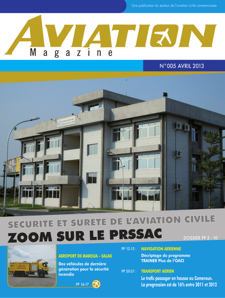 Joseph POKOSSY DOUMBE Président du Conseil d’Administration Aéroports Du Cameroun S.A est une société anonyme de droit camerounais qui a pour missions principales : la gestion, l’exploitation, l’entretien, le renouvellement, la réhabilitation et le développement du patrimoine aéroportuaire dans sept aéroports du Cameroun dont trois de classe internationale, à savoir : Douala, Yaoundé- Nsimalen et Garoua. Depuis quelques temps ADC SA. a mis le cap vers la modernisation et le renouvellement des infrastructures. C’est Ainsi que plusieurs réalisations visant la mise à niveau des équipements et infrastructures aéroportuaires sont en cours : climatisation et aménagement des salles d’embarquements, réhabilitation salons VIP, réorganisation et informatisation des services de facturation et de recouvrement. ADC SA. met également à la disposition des compagnies aériennes des services pour améliorer le confort et la sécurité des passagers dans les aéroports. Ces prestations de qualité sont offertes aux clients et aux usagers de Aéroports Du Cameroun, par un personnel dynamique, professionnel et dévoué. Thomas OWONA ASSOUMOU Directeur Général Une porte ouverte sur le monde… DIRECTION GÉNÉRALE B.P:13615 YAOUNDE Tel: + 237 22 23 45 21 Fax: +237 22 23 45 20 SOMMAIRE EDITO par Pierre TANKAM D.G. CCAA Des avancées majeures GENESE SECURITE AERIENNE Comment le Cameroun a intégré le PRSSAC Les inspecteurs mieux outillés CDOU, matériel roulant Navigation Aérienne L’approche systématique de TRAINAIR plus Clôture de sureté de l’aéroport international de Douala Formation en recherches et sauvetage Tout un plan sensibilisation à la sureté Equipement de sureté Interview du Cordonateur du PRSSAC TRANSPORT AERIEN Le trafic passager en hausse au Cameroun Budget programme la CCAA à la page Le DG de l’ASECNA au Cameroun Croisade contre les cendres volcaniques Des véhicules incendie de dernière génération our Maroua salak Télécommunications électroniques: La nécessité d’une relecture de la loi Aéroport international de Douala: La modernisation bat son plein Aviation Magazine Une publication du secteur de l’aviation civile camerounaise Comité Editorial Pierre TANKAM (Directeur Général CCAA) Thomas OWONA ASSOUMOU (Directeur Général ADC) Frédéric MBOTTO EDIMO (Représentant Résident de l’ASECNA au Cameroun) Directeur de publication Pierre TANKAM Secrétaires de Rédaction Serge William FOTSO, Julien CHONGWANG Rédacteur en chef Joël WADEM Rédaction Jean DJON, Marc-Olivier MAMIAH, Robert NGONGANG, Jules-Lionel TCHOUNGUI, Victorine ZOGO, Aboubacar NSANGOU, Jean-Victor BELL, Cyrille ABONDO, Jacques BELINGA ONANA, Paul NGONDJO ESSO Directeur de la Rédaction Allabira MAMADOU Rédacteurs en chef adjoints Théodore TCHUISSEU Manfred Josué NGOM Relecture Aline ATANGANA KOUNA, Zélyne NKOUANDOU Secrétariat Christiane Hervée ONANA Conception et Mise en page [email protected] Impression: CREATIVA Tél : 22 02 07 67 3 Editorial Des avancées majeures Par Pierre TANKAM Directeur Général de la CCAA “ L’ensemble des mesures institutionnelles, organiques et opérationnelles, ont permis une nette amélioration du système de sûreté de l’aviation civile au Cameroun et se sont traduites par l’augmentation de la fréquentation des aéroports. Le trafic aérien passager est ainsi passé de 627 159 en 2006 à 1 047 401 en 2012 “ 4 L’actualité nous renvoie à l’émergence d’actes humains de prise d’otage et de sabotage dirigés contre les personnes et les biens. Les passagers, les aéroports, les aéronefs, le personnel aéronautique et le public ne sont à l’abri de ces actes malveillants perpétrés par des criminels. L’industrie aéronautique du Cameroun dans sa participation à l’émergence de notre pays, pourrait constituer une cible potentielle pour les hors la loi en mal de publicité assassine. Les audits de l’Organisation de l’Aviation Civile Internationale (OACI) de septembre 1998 et de novembre 2001 ont identifiés les faiblesses du système de sûreté des aéroports, notamment : • l’accès facile aux zones vulnérables des plates formes aéroportuaires par des personnes, des véhicules non autorisés et même du bétail de pâturage; • l’absence de clôture de sûreté ; • l’insuffisance ou la carence du système d’identification des employés d’aéroports, du public et des véhicules ; • la protection insuffisante des aéronefs et des installations et services essentiels d’aéroport; • l’application incompatible des règlements établis et parfois l’absence totale de règlements ; • l’absence des centres directeurs des opérations d’urgence ; • l’insuffisance d’un personnel AVSEC formé et qualifié. Suite à cette sonnette d’alarme, le Cameroun a dû remodeler par étapes successives, son système de gestion de la sûreté. Au plan règlementaire, le Décret portant définition et organisation du Programme National de Sûreté de l’Aviation Civile, celui portant création d’un Comité National de Sûreté de l’Aviation Civile et l’Arrêté portant création des Comités de Sûreté de l’aviation civile dans les aéroports, ont été signé par le Chef de l’Etat, le 13 juillet 2004. Le cadre de la gestion des crises éventuelles de sûreté a été normalisé à travers la signature par le Président de la République, du Décret n°2005/327 du 06 septembre 2005 portant organisation de la gestion des crises de sureté de l’aviation civile au Cameroun. Dans le même temps, des Conventions de partenariats dans le domaine de la sûreté de l’aviation civile ont été signées avec la police, la gendarmerie et la douane en 2005. Les personnels de ces administrations reçoivent systématiquement des formations en sûreté de l’aviation civile aussi bien au Cameroun qu’à l’étranger, sur financement de l’Autorité Aéronautique. Par ailleurs, des 