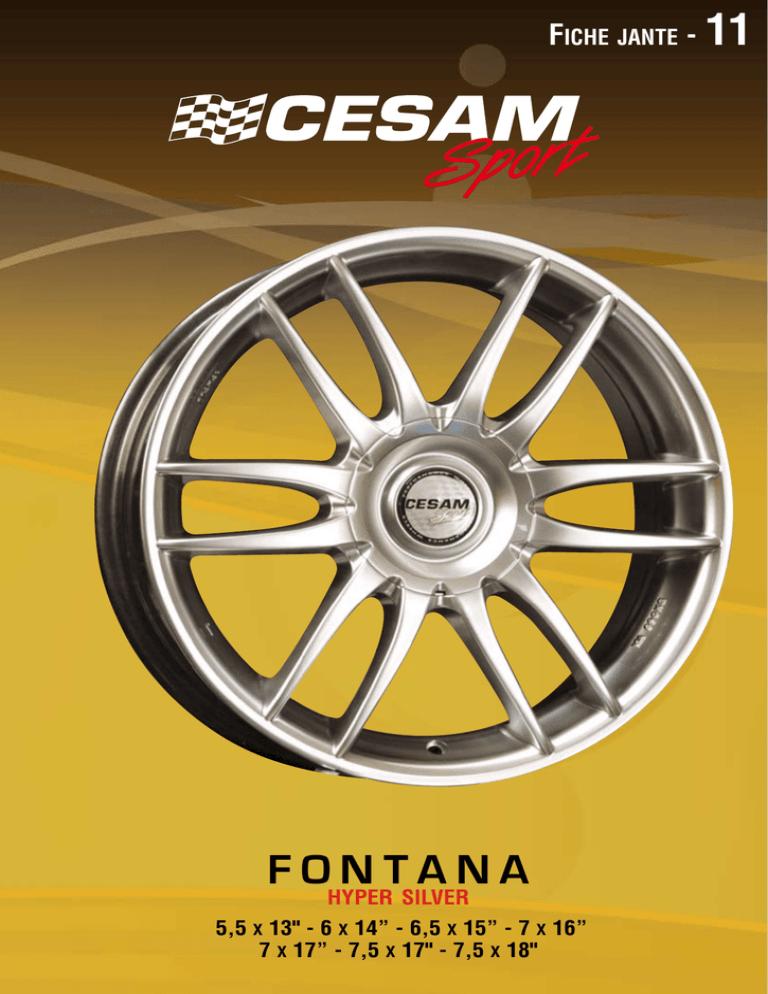 Fiche jante - 11 fontana hyper silver 5,5 x 13" - 6 x 14” - 6,5 x 15” - 7 x 16” 7 x 17” - 7,5 x 17" - 7,5 x 18" Cesam Sport - FONTANA Hyper Silver Références Affectations Entraxes Déports 5,5 x 13" FON3153098/ PEUGEOT/CITROEN 5,5*13» 3T. FONTANA HS 3098 15 FON3358098108/ FIAT/ALFA/AUDI/FORD 5,5*13 FONTANA HS 4098/108 35 FON3354100/ RENAULT/VW/ 5,5*13 FONTANA HS 4100 35 FON3154108/ PEUGEOT/CITROEN 5,5*13 FONTANA HS 4108 15 6,0 x 14" FON4153098/ PEUGEOT/CITROEN 6*14 3T. FONTANA HS 3098 15 FON4358098108/ FIAT/ALFA/LANCIA/AUDI/FORD 6*14 FONTANA 4098/108 35 FON4358100114/ RENAULT/VW/JAPONNAISE 6*14 FONTANA 4100/114 35 FON4359100/ RENAULT/VW/SEAT 6*14 FONTANA 4100/5100 35 FON4154108/ PEUGEOT/CITROEN 6*14 FONTANA (P65) 4108 15 FON4254108/ 206/307/C2 6*14 FONTANA HS (P65) 4108 25 Affectations données à titre indicatif, hors montage spécifique. Infomations non contractuelles, sauf erreur ou omission, sous réserve de modifications techniques. 6,5 x 15" FON5358098108/ FIAT/ALFA/LANCIA/AUDI/FORD 6,5*15 FONTAN 4098/108 35 FON5358100114/ RENAULT/VW/JAPONNAISE 6,5*15 FONTANA 4100/114 35 FON5408100114/ OPEL/HONDA/JAPONNAISE 6,5*15 FONTANA 4100/114 40 FON5154108/ PEUGEOT/CITROEN 6,5*15 FONTANA (P65) 4108 15 FON5254108/ 206/307/C2/C3 6,5*15 FONTANA HS (P65) 4108 25 FON53510098108/ ALFA/806/PEUGEOT/RENAULT 6.5*15 FONTANA 5098/108 35 FON53510100112/ GOLF4/AUDI A3/AUDI/MERC 6,5*15 FONTANA 5100/112 35 FON54510108112/ 407/MONDEO/GOLF V/A3 6,5*15 FONTANA 5108/112 45 FON54010110114/ OPEL/SAAB/JAPONAISE 6,5*15 FONTANA HS 5110/114 40 7,0 x 16" FON6358098108/ FIAT/ALFA/LANCIA/AUDI/FORD 7*16 FONTANA 4098/108 35 FON6358100114/ RENAULT/VW/JAPONNAISE 7*16 FONTANA 4100/114 35 FON6154108/ PEUGEOT/CITROEN 7*16 FONTANA (P65) 4108 15 FON6254108/ 206/307 7*16 FONTANA HS (P65) 4108 25 FON63210098108/ ALFA/806/PEUGEOT/RENAULT 7*16 FONTANA 5098/108 32 FON63510100112/ GOLF4/AUDI A3/AUDI/MERC 7*16 FONTANA 5100/112 35 FON64510108112/ 407/MONDEO/GOLF V/A3 7*16 FONTANA 5108/112 45 FON64010110114/ OPEL/SAAB/JAPONAISE 7*16 FONTANA HS 5110/114 40 FON6355120/ BMW 3 E36/E46 7*16 FONTANA 5120 35 7,0 x 17" FON7358098108/ FIAT/ALFA/LANCIA/AUDI/FORD 7*17 FONTANA 4098/108 35 FON7358100114/ RENAULT/VW/JAPONNAISE 7*17 FONTANA 4100/114 35 FON7154108/ PEUGEOT/CITROEN 7*17 FONTANA (P65) 4108 15 FON7254108/ 206/307 7*17 FONTANA HS (P65) 4108 25 7,5 x 17" FON73510098108/ ALFA/806/PEUGEOT/RENAULT 7,5*17 FONTANA 5098/108 35 FON73510100112/ GOLF4/AUDI A3/AUDI/MERC 7,5*17 FONTANA 5100/112 35 FON74510108112/ 407/MONDEO/GOLF V/A3 7,5*17 FONTANA 5108/112 45 FON74010110114/ OPEL/SAAB/JAPONAISE 7,5*17 FONTANA HS 5110/114 40 FON7205120/ BMW SERIE 5 E39/E34/7 E32 7,5*17 FONTANA 5120 20 FON7405120/ BMW 3 E36/E46 7,5*17 FONTANA HS 5120 40 7,5 x 18" FON8358100114/ RENAULT/VW/JAPONNAISE 7,5*18 FONTANA 4100/114 35 FON83510100112/ GOLF4/AUDI A3/AUDI/MERC 7,5*18 FONTANA 5100/112 35 FON83510110114/ OPEL/SAAB/JAPONAISE 7,5*18 FONTANA HS 5110/114 35 FON8385120/ BMW 3 E36/E46 7,5*18 FONTANA HS 5120 38