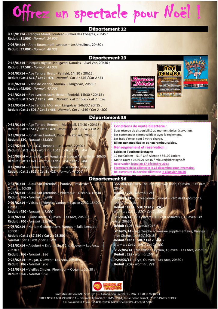 Offrez un spectacle pour Noël ! Département 22 18/01/14 - François Morel, Loudéac – Palais des Congrès, 20h45 : Réduit : 21.90€ - Normal : 24.90€ 03/04/14 – Anne Roumanoff, Lannion – Les Ursulines, 20h30 : Réduit : 37.00€ - Normal : 40.00€ Département 29 18/01/14 – Jacques Higelin, Plougastel Daoulas – Avel Vor, 20h30 : Réduit : 37.50€ - Normal : 43.00€ 01/02/14 – Age Tendre, Brest - Penfeld, 14h30 / 20h15 : Réduit : Cat 1 51€ / Cat 2 : 47€ - Normal : Cat 1 : 55€ / Cat 2 : 51€ 05/02/14 – Valse de Vienne, Morlaix – Langolvas, 20h30 : Réduit : 43.00€ - Normal : 47.00€ 14/02/14 – Rdv avec les stars, Brest – Penfeld, 14h30 / 20h15 : Réduit : Cat 1 52€ / Cat 2 : 48€ - Normal : Cat 1 : 56€ / Cat 2 : 52€ 17/05/14 – Age Tendre, Morlaix – Langolvas, 14h30 / 20h15 : Réduit : Cat 1 : 50€ / Cat 2 : 46€ - Normal : Cat 1 : 54€ / Cat 2 : 50€ Département 35 31/01/14 – Age Tendre, Rennes – Musikhall, 14h30 / 20h15 : Réduit : Cat 1 : 51€ / Cat 2 : 47€ - Normal : Cat 1 : 55€ / Cat 2 : 51€ 19/02/14 – Jonathan Lambert, Pacé – Le Ponant, 20h30 : Réduit : 32€ - Normal : 35.00€ 22/02/14 – D.I.S.C.O, Rennes – Le Liberté, 20h00 : Réduit : Cat 1 : 45€ - Normal : Cat 1 : 59€ / Cat 2 : 45€ Conditions de vente billetterie : Sous réserve de disponibilité au moment de la réservation. Les commandes seront validées avec le règlement. Les frais d’envoi sont à votre charge. Billets non modifiables et non remboursables. Renseignement et réservation : 20/03/14 – Lynda Lemay, Fougères – Espace Aumaillerie, 20h30 : Réduit : Cat 1 : 42€ - Normal : Cat 1 : 45€ / Cat 2 : 40€ 17/04/14 – Etienne Daho, Rennes – Le Liberté, 20h30 : Réduit : Cat 1 : 62€ / Cat 2 : 42€ - Normal : 43.00€ Loisirs et Tourisme Bretagne 12 rue Colbert – 51 P Cité Allende / 56100 Lorient Marie-Laure : 02.97.21.59.16 / [email protected] Réservation jusqu’au 17 décembre 2013 Fermeture de la billetterie le 18 décembre pour inventaire. Ré-ouverture du service billetterie le 6 janvier 20140 Département 56 31/01/14 – A qui sait attendre…, Pontivy – Palais des Congrès, 20h30 : 23/02/14 – A qui sait attendre…, Ploemeur – Océanis, 15h30 Réduit : 36€ - Normal : 39.00€ 01/02/14 – Valses de Vienne, Vannes – Espace 2000, 15h00 / 20h15 : Réduit : 43€ - Normal : 47.00€ 01/02/14 – Claire Diterzi, Queven – Les Arcs, 20h30 : Réduit : 20€ - Normal : 22.00€ 08/02/14 – Harlem Globetrotters, Vannes – Salle Kercado, 20h00 : Réduit : Cat 1 : 37.25€ / Cat 2 : 26.25€ Normal : Cat 1 : 40€ / Cat 2 : 29€ 15/02/14 – Aldebert « Enfantillages 2 », Queven – Les Arcs, 20h30 : Réduit : 16€ - Normal : 18€ 28/02/14 – Mugar, Queven – Les Arcs, 20h30 : Réduit : 18€ - Normal : 20€ 21/03/14 – Vieilles Chipies, Ploemeur – Océanis, 20h30 : Réduit : 36€ - Normal : 39€ 27/03/14 – RJ & The James Brown Band, Queven – Les Arcs, 20h30 : Réduit : 22€ - Normal : 24€ 29/03/14 – Sacrée Soirée, Lorient – Parc des Expositions, 14h30 / 20h15 : Réduit : Cat 1 : 53€ / Cat 2 : 49€ Normal : Cat 1 : 57€ / Cat 2 : 53€ 12/04/14 – BS Concert « Au Vent Mauvais », Queven, Les Arcs, 20h30 : Réduit : 10€ - Normal : 24€ 16/05/14 – Age Tendre – Tournée Supplémentaire, Vannes – Le Chorus, 14h30 / 20h15 : Réduit : Cat 1 : 50€ / Cat 2 : 46€ Normal : Cat 1 : 54€ / Cat 2 : 50€ 22/05/14 – Madeleine Peyroux, Queven – Les Arcs, 20h30 : Réduit : 22€ - Normal :24€ 24/05/14 – Tryo, Queven – Les Arcs, 20h30 : Réduit : 20€ - Normal : 22€ Immatriculation IMO 56110015 – Association Loi 1901 - TVA : FR70337608293 SIRET N°337 608 293 000 11 – Garantie financière : FMS-UNAT, 8 rue César Franck, 75015 PARIS CEDEX Responsabilité Civile : MACIF 79037 NIORT Cedex 09 –Contrat S002