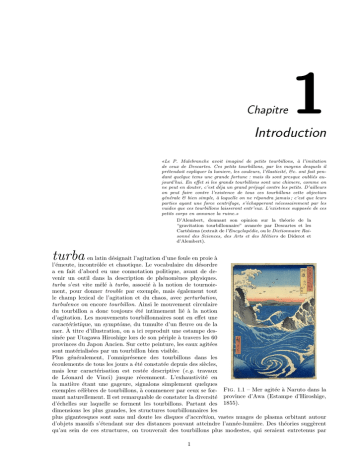 Chapitre 1 Introduction «Le P. Malebranche avoit imaginé de petits tourbillons, à l’imitation de ceux de Descartes. Ces petits tourbillons, par les moyens desquels il prétendoit expliquer la lumiere, les couleurs, l’élasticité, &c. ont fait pendant quelque tems une grande fortune : mais ils sont presque oubliés aujourd’hui. En effet si les grands tourbillons sont une chimere, comme on ne peut en douter, c’est déja un grand préjugé contre les petits. D’ailleurs on peut faire contre l’existence de tous ces tourbillons cette objection générale & bien simple, à laquelle on ne répondra jamais ; c’est que leurs parties ayant une force centrifuge, s’échapperont nécessairement par les vuides que ces tourbillons laisseront entr’eux. L’existence supposée de ces petits corps en annonce la ruine.» D’Alembert, donnant son opinion sur la théorie de la “gravitation tourbillonnaire” avancée par Descartes et les Cartésiens (extrait de l’Encyclopédie, ou le Dictionnaire Raisonné des Sciences, des Arts et des Métiers de Diderot et d’Alembert). turba en latin désignait l’agitation d’une foule en proie à l’émeute, incontrôlée et chaotique. Le vocabulaire du désordre a en fait d’abord eu une connotation politique, avant de devenir un outil dans la description de phénomènes physiques. turba s’est vite mêlé à turbo, associé à la notion de tournoiement, pour donner trouble par exemple, mais également tout le champ lexical de l’agitation et du chaos, avec perturbation, turbulence ou encore tourbillon. Ainsi le mouvement circulaire du tourbillon a donc toujours été intimement lié à la notion d’agitation. Les mouvements tourbillonnaires sont en effet une caractéristique, un symptôme, du tumulte d’un fleuve ou de la mer. À titre d’illustration, on a ici reproduit une estampe dessinée par Utagawa Hiroshige lors de son périple à travers les 60 provinces du Japon Ancien. Sur cette peinture, les eaux agitées sont matérialisées par un tourbillon bien visible. Plus généralement, l’omniprésence des tourbillons dans les écoulements de tous les jours a été constatée depuis des siècles, mais leur caractérisation est restée descriptive (e.g. travaux de Léonard de Vinci) jusque récemment. L’exhaustivité en la matière étant une gageure, signalons simplement quelques exemples célèbres de tourbillons, à commencer par ceux se for- Fig. 1.1 – Mer agitée à Naruto dans la mant naturellement. Il est remarquable de constater la diversité province d’Awa (Estampe d’Hiroshige, d’échelles sur laquelle se forment les tourbillons. Partant des 1855). dimensions les plus grandes, les structures tourbillonnaires les plus gigantesques sont sans nul doute les disques d’accrétion, vastes nuages de plasma orbitant autour d’objets massifs s’étendant sur des distances pouvant atteindre l’année-lumière. Des théories suggèrent qu’au sein de ces structures, on trouverait des tourbillons plus modestes, qui seraient entretenus par 1 le cisaillement ambiant et favoriseraient la formation de planétésimaux, embryons de planètes. D’une nature similaire à ces derniers, mais beaucoup plus proche de nous, la Grande Tâche Rouge de Jupiter (illustrée figure 1.2), découverte dès 1665 par Hook, est un tourbillon très robuste qui a peu varié depuis sa découverte (Marcus, 1993). De dimensions astronomiques (on pourrait y loger plus de deux fois la Terre), cet anticyclone bénéficie d’une longévité exceptionnelle (et encore inexpliquée), là où ses homologues terriens ont une espérance de vie limitée à la dizaine de jours. Quittant les échelles astrophysiques pour celles de la géophysique, on constate que des phénomènes météorologiques particulièrement violents revettent l’apparence de tourbillons : les cyclones et les tornades. Ces tourbillons très concentrés, et donc très intenses, ont une capacité destructrice immense. Leur trajectoire étant à la base d’un enjeu économique et humain important, le comportement de ces tourbillons fait l’objet de nombreuses études. Il est d’ailleurs intéressant de noter que la communauté météorologique a fait beaucoup d’avancées scientifiques dans le domaine des tourbillons, comme nous aurons souvent l’occasion de le constater dans la suite du manuscrit. Avant de poursuivre notre rapide galerie de portraits des tourbillons apparaissant spontanément, faisons un bref détour par une classe de tourbillons générés par l’homme : les tourbillons de sillage d’avion. En effet, à la force de portance qui sustente les avions est associée une distribution de pression particulière sur l’aile (basse pression sur l’extrados – haute pression sur l’intrados) qui est à l’origine de la génération de tourbillons. Plus précisément, en bout d’aile d’avion, l’air est “aspiré” en quelque sorte par les basses pressions et contourne le bout Fig. 1.2 – Haut : Tâche Rouge de d’aile, créant un mouvement d’ensemble tournoyant, c’est-à-dire un Jupiter prise par la sonde Voyager 1. Les nuages blancs sont constitués tourbillon. Ce sont ces tourbillons qui sont visualisés par des traı̂nées d’ammoniac. Bas : Photo d’une torblanches dans le ciel, lorsque les conditions météorologiques se prêtent nade dans le Texas. On notera une à la condensation de l’eau dans ces zones dépressionnaires. La photo sorte de bulbe d’éclatement à sa (figure 1.3) illustrant ces tourbillons est extraite d’une campagne de base. la NASA visant à caractériser ces structures, qui représentent un réel danger pour les avions suiveurs. En effet, de par leur cohérence à grande échelle et leur robustesse, ces écoulements tournants sont à l’origine d’un très fort moment de roulis appliqué à l’avion qui s’y serait piégé, pouvant le conduire au crash s’il ne ne parvient pas à s’en extraire. De fait, la présen