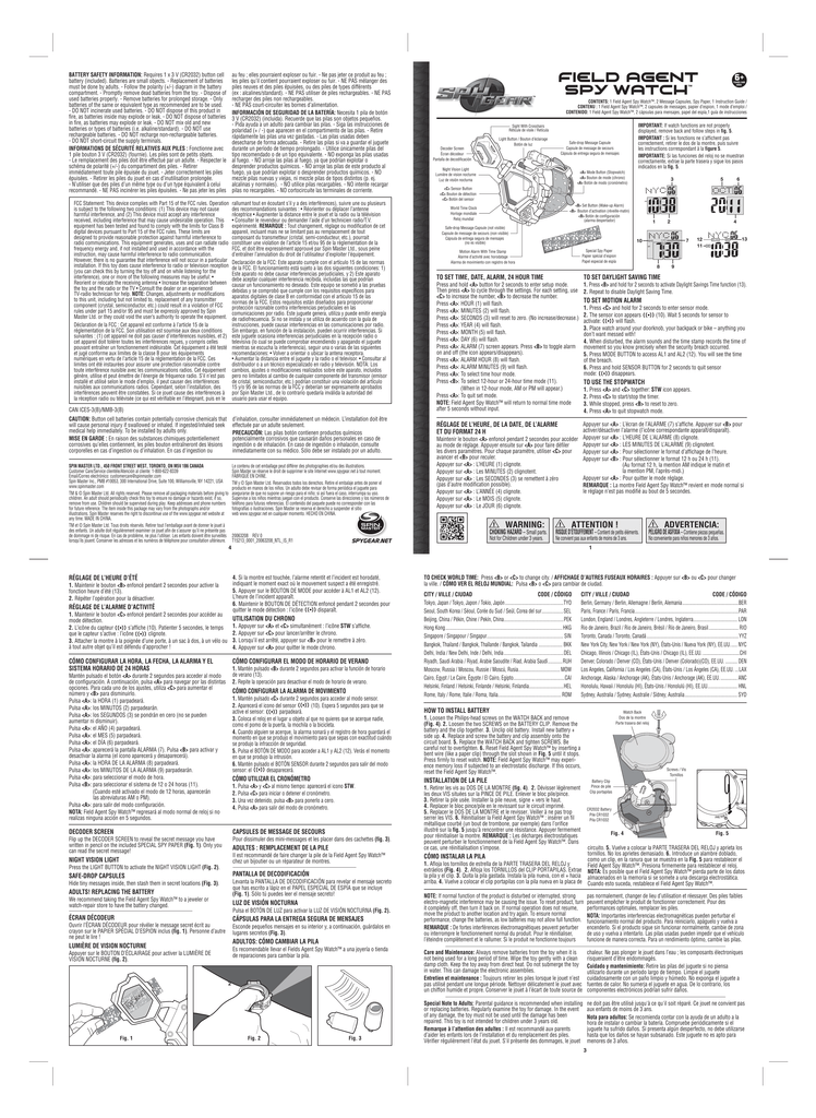 BATTERY SAFETY INFORMATION: Requires 1 x 3 V (CR2032) button cell battery (included). Batteries are small objects. - Replacement of batteries must be done by adults. - Follow the polarity (+/-) diagram in the battery compartment. - Promptly remove dead batteries from the toy. - Dispose of used batteries properly. - Remove batteries for prolonged storage. - Only batteries of the same or equivalent type as recommended are to be used. - DO NOT incinerate used batteries. - DO NOT dispose of this product in fire, as batteries inside may explode or leak. - DO NOT dispose of batteries in fire, as batteries may explode or leak. - DO NOT mix old and new batteries or types of batteries (i.e. alkaline/standard). - DO NOT use rechargeable batteries. - DO NOT recharge non-rechargeable batteries. - DO NOT short-circuit the supply terminals. INFORMATIONS DE SÉCURITÉ RELATIVES AUX PILES : Fonctionne avec 1 pile bouton 3 V (CR2032) (fournie). Les piles sont de petits objets. - Le remplacement des piles doit être effectué par un adulte. - Respecter le schéma de polarité (+/-) du compartiment des piles. - Retirer immédiatement toute pile épuisée du jouet. - Jeter correctement les piles épuisées. - Retirer les piles du jouet en cas d’inutilisation prolongée. - N’utiliser que des piles d’un même type ou d’un type équivalent à celui recommandé. - NE PAS incinérer les piles épuisées. - Ne pas jeter les piles au feu ; elles pourraient exploser ou fuir. - Ne pas jeter ce produit au feu ; les piles qu’il contient pourraient exploser ou fuir. - NE PAS mélanger des piles neuves et des piles épuisées, ou des piles de types différents (ex : alcalines/standard). - NE PAS utiliser de piles rechargeables. - NE PAS recharger des piles non rechargeables. - NE PAS court-circuiter les bornes d’alimentation. INFORMACIÓN DE SEGURIDAD DE LA BATERÍA: Necesita 1 pila de botón 3 V (CR2032) (incluida). Recuerde que las pilas son objetos pequeños. - Pida ayuda a un adulto para cambiar las pilas. - Siga las instrucciones de polaridad (+ / -) que aparecen en el compartimento de las pilas. - Retire rápidamente las pilas una vez gastadas. - Las pilas usadas deben desecharse de forma adecuada. - Retire las pilas si va a guardar el juguete durante un período de tiempo prolongado. - Utilice únicamente pilas del tipo recomendado o de un tipo equivalente. - NO exponga las pilas usadas al fuego. - NO arroje las pilas al fuego, ya que podrían explotar o desprender productos químicos. - NO arroje las pilas de este producto al fuego, ya que podrían explotar o desprender productos químicos. - NO mezcle pilas nuevas y viejas, ni mezcle pilas de tipos distintos (p. ej. alcalinas y normales). - NO utilice pilas recargables. - NO intente recargar pilas no recargables. - NO cortocircuite las terminales de corriente. FCC Statement: This device complies with Part 15 of the FCC rules. Operation is subject to the following two conditions: (1) This device may not cause harmful interference, and (2) This device must accept any interference received, including interference that may cause undesirable operation. This equipment has been tested and found to comply with the limits for Class B digital devices pursuant to Part 15 of the FCC rules. These limits are designed to provide reasonable protection against harmful interference to radio communications. This equipment generates, uses and can radiate radio frequency energy and, if not installed and used in accordance with the instruction, may cause harmful interference to radio communication. However, there is no guarantee that interference will not occur in a particular installation. If this toy does cause interference to radio or television reception (you can check this by turning the toy off and on while listening for the interference), one or more of the following measures may be useful: • Reorient or relocate the receiving antenna • Increase the separation between the toy and the radio or the TV • Consult the dealer or an experienced TV-radio technician for help. NOTE: Changes, adjustments or modifications to this unit, including but not limited to, replacement of any transmitter component (crystal, semiconductor, etc.) could result in a violation of FCC rules under part 15 and/or 95 and must be expressly approved by Spin Master Ltd. or they could void the user’s authority to operate the equipment. Déclaration de la FCC : Cet appareil est conforme à l’article 15 de la réglementation de la FCC. Son utilisation est soumise aux deux conditions suivantes : (1) cet appareil ne doit pas causer d’interférences nuisibles, et 2) cet appareil doit tolérer toutes les interférences reçues, y compris celles pouvant entraîner un fonctionnement indésirable. Cet équipement a été testé et jugé conforme aux limites de la classe B pour les équipements numériques en vertu de l’article 15 de la réglementation de la FCC. Ces limites ont été instaurées pour assurer une protection raisonnable contre toute interférence nuisible avec les communications radios. Cet équipement génère, utilise et peut émettre de l’énergie de fréquence radio. S’il n’est pas installé et utilisé selon le mode d’emploi, il peut causer des interférences nuisibles aux communications radios. Cependant, selon l’installation, des interférences peuvent être constatées. Si ce jouet cause des interférences à la réception radio ou télévisée (ce qui est vérifiable en l’éteignant, puis en le rallumant tout en écoutant s’il y a des interférences), suivre une ou plusieurs des recommandations suivantes : • Réorienter ou déplacer l’antenne réceptrice • Augmenter la distance entre le jouet et la radio ou la télévision • Consulter le revendeur ou demander l’aide d’un technicien radio/T.V. expérimenté. REMARQUE : Tout changement, réglage ou modification de cet appareil, incluant mais ne se limitant pas au remplacement de tout composant d