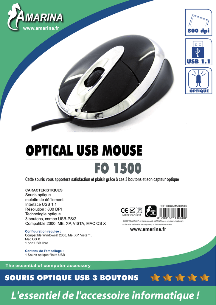 www.amarina.fr 800 dpi USB 1.1 OPTICAL USB MOUSE FO 1500 Cette souris vous apportera satisfaction et plaisir grâce à ces 3 boutons et son capteur optique CARACTERISTIQUES Souris optique molette de défilement Interface USB 1.1 Résolution : 800 DPI Technologie optique 3 boutons, combo USB-PS/2 Compatible 2000, ME, XP, VISTA, MAC OS X Configuration requise : Compatible Windows® 2000, Me, XP, Vista™, Mac OS X 1 port USB libre REF: SOUAMA00050B GARANTIE WARRANTY 2 ANS/YEARS 3 700151 110500 •© 2008 "AMARINA® ", all rights reserved. AMARINA logo is a registered trademark All the other trademarks are the property of their respective owners. www.amarina.fr Contenu de l’emballage : 1 Souris optique filaire USB SOURIS OPTIQUE USB 3 BOUTONS L'essentiel de l'accessoire informatique !
