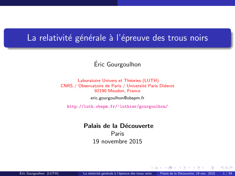 La relativité générale à l’épreuve des trous noirs Éric Gourgoulhon Laboratoire Univers et Théories (LUTH) CNRS / Observatoire de Paris / Université Paris Diderot 92190 Meudon, France [email protected] http://luth.obspm.fr/~luthier/gourgoulhon/ Palais de la Découverte Paris 19 novembre 2015 Éric Gourgoulhon (LUTH) La relativité générale à l’épreuve des trous noirs Palais de la Découverte, 19 nov. 2015 1 / 59 Plan 1 La théorie : qu’est-ce qu’un trou noir ? 2 Voir un trou noir ? 3 Les observations actuelles 4 Tester la relativité générale Éric Gourgoulhon (LUTH) La relativité générale à l’épreuve des trous noirs Palais de la Découverte, 19 nov. 2015 2 / 59 La théorie : qu’est-ce qu’un trou noir ? Outline 1 La théorie : qu’est-ce qu’un trou noir ? 2 Voir un trou noir ? 3 Les observations actuelles 4 Tester la relativité générale Éric Gourgoulhon (LUTH) La relativité générale à l’épreuve des trous noirs Palais de la Découverte, 19 nov. 2015 3 / 59 La théorie : qu’est-ce qu’un trou noir ? Qu’est-ce qu’un trou noir ? Une définition en quelques mots : Un trou noir est une région de l’espace-temps d’où rien, pas même la lumière, ne peut s’échapper. La frontière (immatérielle) entre l’intérieur du trou noir et le reste de l’Univers est appelée horizon des événements. [Alain Riazuelo, 2007] Éric Gourgoulhon (LUTH) La relativité générale à l’épreuve des trous noirs Palais de la Découverte, 19 nov. 2015 4 / 59 La théorie : qu’est-ce qu’un trou noir ? Pourquoi la lumière ne peut s’échapper ? Réponse pour la mécanique newtonienne (J. Michell 1783, Laplace 1796) : C’est en raison de la gravitation : la vitesse de libération dépasse la vitesse de la lumière Éric Gourgoulhon (LUTH) La relativité générale à l’épreuve des trous noirs Palais de la Découverte, 19 nov. 2015 5 / 59 La théorie : qu’est-ce qu’un trou noir ? Pourquoi la lumière ne peut s’échapper ? Réponse pour la mécanique newtonienne (J. Michell 1783, Laplace 1796) : C’est en raison de la gravitation : la vitesse de libération dépasse la vitesse de la lumière Théorie de Newton de la gravitation : la vitesse de libération d’un corps de masse M et de r 2GM rayon R est Vlib = R avec G = 6.67 10−11 m3 kg−1 s−2 (constante de Newton) Terre : Vlib = 11 km/s Soleil : Vlib = 617 km/s La lumière ne s’échappe pas si Vlib > c ' 300 000 km/s Éric Gourgoulhon (LUTH) La relativité générale à l’épreuve des trous noirs Palais de la Découverte, 19 nov. 2015 5 / 59 La théorie : qu’est-ce qu’un trou noir ? La préhistoire des trous noirs... Vlib GM 1 1 G 4 > c ⇐⇒ 2 > ⇐⇒ 2 × πR3 ρ > ⇐⇒ R > c R 2 c R 3 | {z } | {z } 2 C M s 3c2 8πGρ John Michell (1783) Un corps de même densité que le Soleil, mais de rayon 500 fois plus grand ne laisserait pas s’échapper la lumière Pierre Simon de Laplace (1796) “Un astre lumineux, de la même densité que la Terre, et dont le diamètre serait 250 fois plus grand que le Soleil, ne permettrait, en vertu de son attraction, à aucun de ses rayons de parvenir jusqu’à nous. Il est dès lors possible que les plus grands corps lumineux de l’univers puissent, par cette cause, être invisibles.” Éric Gourgoulhon (LUTH) La relativité générale à l’épreuve des trous noirs Palais de la Découverte, 19 nov. 2015 6 / 59 La théorie : qu’est-ce qu’un trou noir ? Les “corps invisibles” tombent dans l’oubli... Mention des “corps invisibles” par Laplace dans les deux premières éditions de son Exposition du système du Monde (1796 et 1799) Suppression dans la troisième édition (1808) et les suivantes : prédominance de la théorie ondulatoire de la lumière sur la théorie corpusculaire après les expériences de Thomas Young (1801) [R. Taillet] Éric Gourgoulhon (LUTH) La relativité générale à l’épreuve des trous noirs Palais de la Découverte, 19 nov. 2015 7 / 59 La théorie : qu’est-ce qu’un trou noir ? Limites du concept newtonien de trou noir Pas de rôle privilégié de la vitesse de la lumière en théorie newtonienne : rien n’interdit V > c Vlib ∼ c =⇒ énergie du champ gravitationnel ∼ énergie de masse M c2 =⇒ théorie relativiste de la gravitation nécessaire ! =⇒ le traitement correct des trous noirs ne peut se faire qu’en relativité générale (ou dans l’une de ses généralisations) Éric Gourgoulhon (LUTH) La relativité générale à l’épreuve des trous noirs Palais de la Découverte, 19 nov. 2015 8 / 59 La théorie : qu’est-ce qu’un trou noir ? Limites du concept newtonien de trou noir Pas de rôle privilégié de la vitesse de la lumière en théorie newtonienne : rien n’interdit V > c Vlib ∼ c =⇒ énergie du champ gravitationnel ∼ énergie de masse M c2 =⇒ théorie relativiste de la gravitation nécessaire ! =⇒ le traitement correct des trous noirs ne peut se faire qu’en relativité générale (ou dans l’une de ses généralisations) 1 8πG R− Rg = 4 T 2 c (A. Einstein, novembre 1915) La relativité générale décrit la gravitation comme la courbure de l’espace-temps Éric Gourgoulhon (LUTH) La relativité générale à l’épreuve des trous noirs Palais de la Découverte, 19 nov. 2015 8 / 59 La théorie : qu’est-ce qu’un trou noir ? Mais au fait, qu’est-ce que l’espace-temps ? Nous vivons dans un espace à trois dimensions : devant / derrière, gauche / droite, haut / bas =⇒ 3 nombres (x, y, z) (coordonnées) pour décrire la position d’un point dans l’espace. Éric Gourgoulhon (LUTH) La relativité générale à l’épreuve des trous noirs Palais de la Découverte, 19 nov. 2015 9 / 59 La théorie : qu’est-ce qu’un trou noir ? Mais au fait, qu’est-ce que l’espace-temps ? Nous vivons dans un espace à trois dimensions : devant / derrière, gauche / droite, haut / bas =⇒ 3 nombres (x, y, z) (coordonnées) pour décrire la position d