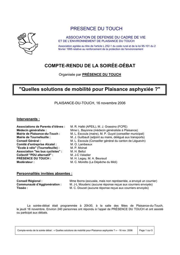 PRESENCE DU TOUCH ASSOCIATION DE DEFENSE DU CADRE DE VIE ET DE L'ENVIRONNEMENT DE PLAISANCE DU TOUCH Association agréée au titre de l'article L.252-1 du code rural et de la loi 95-101 du 2 février 1995 relative au renforcement de la protection de l'environnement COMPTE-RENDU DE LA SOIRÉE-DÉBAT Organisée par PRÉSENCE DU TOUCH "Quelles solutions de mobilité pour Plaisance asphyxiée ?" PLAISANCE-DU-TOUCH, 16 novembre 2006 Intervenants : Associations de Parents d’élèves : Médecin généraliste : Mairie de Plaisance-du-Touch : Mairie de Tournefeuille : Conseil Général : Comité d’entreprise Alcatel : "Ecole à vélo" (Tournefeuille) : Association "les bus cyclistes" : Collectif "PDU alternatif" : PRÉSENCE DU TOUCH : Modérateur : M. R. Hallé (APEIL), M. J. Grassino (FCPE) Mme L. Bayonne (médecin généraliste à Plaisance) M. L. Escoula (maire), M. P. Guyot (conseiller municipal) M. J. Guilbault (adjoint au maire, délégué aux transports) M. L. Escoula (Conseiller général du canton de Léguevin) M. O. Lambeaux M. P. Moinat M. H. Bellut M. J-C Valadier M. H. Legay, M. A. Beuraud M. C. Moretto (La Dépêche du Midi) Personnalités invitées absentes : Conseil Régional : Communauté d’Agglomération : Tisséo : Mme Iborra (excusée, mais non représentée, a envoyé un courrier) M. J-L Moudenc (aucune réponse reçue aux courriers envoyés) M. C. Doucet (aucune réponse reçue aux courriers envoyés) La soirée-débat était programmée à 20h30, à la salle des fêtes de Plaisance-du-Touch, le jeudi 16 novembre. Environ 240 personnes ont répondu à l’appel de PRÉSENCE DU TOUCH et ont assisté ou participé aux débats. Compte-rendu de la soirée débat : « Quelles solutions de mobilité pour Plaisance asphyxiée ? » - 16 nov. 2006 Page 1 sur 5 PRÉSENCE DU TOUCH avait décidé d’entamer la soirée par la projection d’un film de 12 minutes, tourné par l’association. L’objectif du film était de montrer la vie quotidienne de Plaisançois (une salariée se rendant à Airbus en voiture, des lycéennes revenant du lycée, un salarié utilisant son vélo pour aller à Alcatel) confrontés aux problèmes de transport. Le petit montage vidéo se terminait par l’intervention de deux responsables de PRÉSENCE DU TOUCH qui ont repris et argumenté les solutions préconisées par l’association plaisançoise (voir page 3 du "Colvert" de novembre 2006). C. Moretto, modérateur, a ensuite ouvert le débat en donnant la parole aux intervenants. 1ère partie : Qu’est-il envisageable de demander aux territoriales pour améliorer les conditions de transports ? APEIL (R. Hallé) : Association de parents d'élèves du lycée FCPE (J. Grassino) : Association de parents d'élèves du lycée Mme L. Bayonne : Médecin généraliste collectivités Présentation de la "journée-type" du lycéen plaisançois. Les enfants se lèvent vers 6h15 le matin, et doivent prendre le bus de 7h12 pour atteindre le lycée Rive-Gauche en temps utile. Pour les enfants dont les cours démarrent à 9h, plusieurs cas d’arrivées en retard récents sont cités (le bus part pourtant à 8h05 de Monestié !). Le soir, le retour sur Plaisance s’effectue vers 19h puisque les bus, noyés dans les encombrements, mettent environ 1h pour regagner Plaisance. Et c’est alors que les lycéens doivent commencer à faire leurs devoirs. Les lycéens subissent donc des conditions de travail infernales, avec des journées d’une durée inacceptable. Témoignage sur une action "coup de poing", menée à Tournefeuille en 2004/2005. Les bus, partant de Plaisance, étaient tellement bondés en passant à Tournefeuille, qu’ils ne s’arrêtaient même plus ! Les enfants, devaient donc attendre le bus suivant, et arrivaient immanquablement en retard. Les tentatives d’actions "amiables" n’ayant donné aucune suite, il a fallu "bloquer les bus" un matin, pour qu’enfin Tisséo réagisse, et dédouble les bus. Mais le problème du temps de trajet reste entier, et la question de la future carte scolaire est loin d’être réglée. Remarque sur le fait que, parmi ses patients, un grand nombre d’adolescents souffrent de stress et d’anxiété. Les enfants ont peur d’être en retard, ont peur de ne pas avoir le temps de faire leurs devoirs … Les journées qu’ils subissent sont intolérables, et les dégâts pour la santé des lycéens, à court ou moyen terme, sont significatifs, et insuffisamment pris en considération. PRÉSENCE DU TOUCH : L'association déplore le manque d’anticipation des problèmes de la part des élus, quelle que soit leur tendance politique. Elle réitère ses propositions d’urgence figurant dans le Colvert (bus en site propre sur CD50, et réexamen de la carte scolaire). M. Guilbaut et M. Escoula considèrent que les problèmes soulevés sont effectivement préoccupants, mais rappellent que l’Ouest toulousain doit faire face à un afflux massif de nouveaux habitants. M. Escoula indique que l’Ouest toulousain est maintenant devenu une priorité pour la mise en place de transports en commun. M. Guilbault signale que les fréquences des bus 65 et 67 vont être accrues début 2007. J-C Valadier Collectif PDU alternatif regrette la part très faible de déplacement en transport en commun sur l’agglomération toulousaine, les objectifs du PDU en cours, pourtant peu ambitieux en la matière, étant très loin d’être atteints. Il déplore l’orientation « tout-voiture » des récents investissements en Midi-Pyrénées, ainsi que le « gouffre » financier qu’a représenté et que représente encore la construction des lignes A et B du métro. Compte-rendu de la soirée débat : « Quelles solutions de mobilité pour Plaisance asphyxiée ? » - 16 nov. 2006 Page 2 sur 5 Débat dans la salle : Un débat alors se développe entre la salle et les intervenants, notamment sur les investissements récents et à venir en matière de transports. De nombreuses expériences in