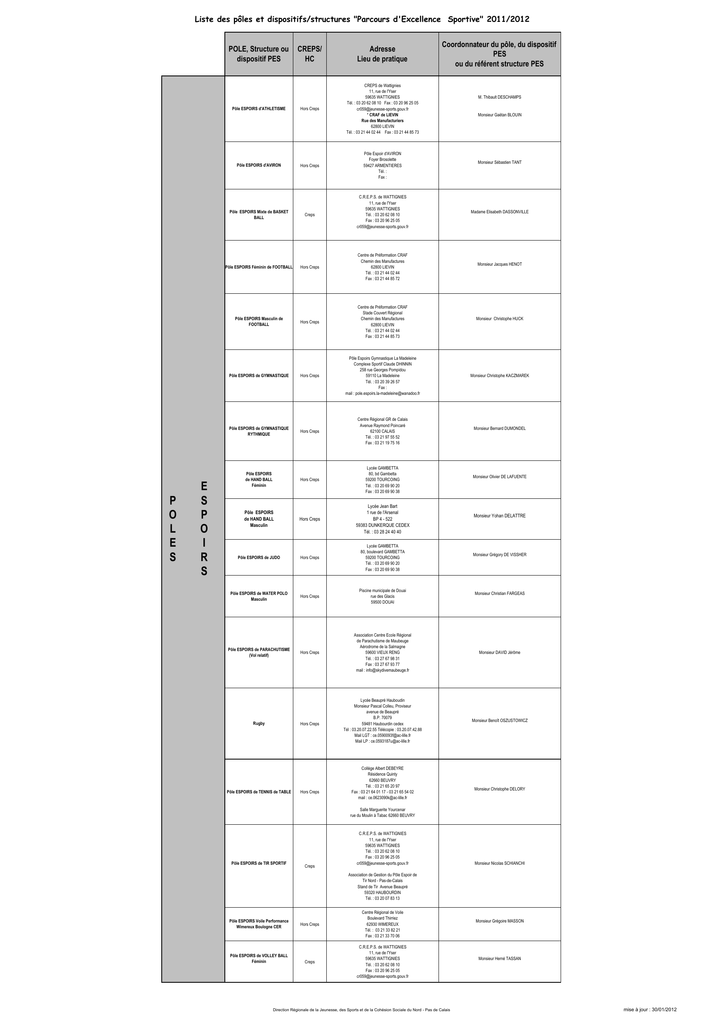 Liste des pôles et dispositifs/structures "Parcours d'Excellence Sportive" 2011/2012 POLE, Structure ou dispositif PES Pôle ESPOIRS d'ATHLETISME Pôle ESPOIRS d'AVIRON Pôle ESPOIRS Mixte de BASKET BALL Hors Creps CREPS de Wattignies 11, rue de l'Yser 59635 WATTIGNIES Tél. : 03 20 62 08 10 Fax : 03 20 96 25 05 [email protected] * CRAF de LIEVIN Rue des Manufacturiers 62800 LIEVIN Tél. : 03 21 44 02 44 Fax : 03 21 44 85 73 Hors Creps Creps Coordonnateur du pôle, du dispositif PES ou du référent structure PES Pôle Espoir d'AVIRON Foyer Brosolette 59427 ARMENTIERES Tél. : Fax : C.R.E.P.S. de WATTIGNIES 11, rue de l'Yser 59635 WATTIGNIES Tél. : 03 20 62 08 10 Fax : 03 20 96 25 05 [email protected] M. Thibault DESCHAMPS Monsieur Gaëtan BLOUIN Monsieur Sébastien TANT Madame Elisabeth DASSONVILLE Hors Creps Hors Creps Centre de Préformation CRAF Stade Couvert Régional Chemin des Manufactures 62800 LIEVIN Tél. : 03 21 44 02 44 Fax : 03 21 44 85 73 Pôle ESPOIRS de GYMNASTIQUE Hors Creps Pôle Espoirs Gymnastique La Madeleine Complexe Sportif Claude DHINNIN 258 rue Georges Pompidou 59110 La Madeleine Tél. : 03 20 39 26 57 Fax : mail : [email protected] Pôle ESPOIRS de GYMNASTIQUE RYTHMIQUE Hors Creps Centre Régional GR de Calais Avenue Raymond Poincaré 62100 CALAIS Tél. : 03 21 97 55 52 Fax : 03 21 19 75 16 Hors Creps Lycée GAMBETTA 80, bd Gambetta 59200 TOURCOING Tél. : 03 20 69 90 20 Fax : 03 20 69 90 38 Pôle ESPOIRS de HAND BALL Masculin Hors Creps Lycée Jean Bart 1 rue de l'Arsenal BP 4 - 522 59383 DUNKERQUE CEDEX Tél. : 03 28 24 40 40 Pôle ESPOIRS de JUDO Hors Creps Lycée GAMBETTA 80, boulevard GAMBETTA 59200 TOURCOING Tél. : 03 20 69 90 20 Fax : 03 20 69 90 38 Pôle ESPOIRS de WATER POLO Masculin Hors Creps Piscine municipale de Douai rue des Glacis 59500 DOUAI Hors Creps Association Centre Ecole Régional de Parachutisme de Maubeuge Aérodrome de la Salmagne 59600 VIEUX RENG Tél. : 03 27 67 98 31 Fax : 03 27 67 93 77 mail : [email protected] Monsieur DAVID Jérôme Lycée Beaupré Hauboudin Monsieur Pascal Colleu, Proviseur avenue de Beaupré B.P. 70079 59481 Haubourdin cedex Tél : 03.20.07.22.55 Télécopie : 03.20.07.42.88 Mail LGT : [email protected] Mail LP : [email protected] Monsieur Benoît OSZUSTOWICZ Pôle ESPOIRS Masculin de FOOTBALL P O L E S Adresse Lieu de pratique Centre de Préformation CRAF Chemin des Manufactures 62800 LIEVIN Tél. : 03 21 44 02 44 Fax : 03 21 44 85 72 Pôle ESPOIRS Féminin de FOOTBALL E S P O I R S CREPS/ HC Pôle ESPOIRS de HAND BALL Féminin Pôle ESPOIRS de PARACHUTISME (Vol relatif) Rugby Hors Creps Pôle ESPOIRS de TENNIS de TABLE Hors Creps Collège Albert DEBEYRE Résidence Quinty 62660 BEUVRY Tél. : 03 21 65 20 97 Fax : 03 21 64 01 17 - 03 21 65 54 02 mail : [email protected] Monsieur Jacques HENOT Monsieur Christophe HUCK Monsieur Christophe KACZMAREK Monsieur Bernard DUMONDEL Monsieur Olivier DE LAFUENTE Monsieur Yohan DELATTRE Monsieur Grégory DE VISSHER Monsieur Christian FARGEAS Monsieur Christophe DELORY Salle Marguerite Yourcenar rue du Moulin à Tabac 62660 BEUVRY Pôle ESPOIRS de TIR SPORTIF Creps C.R.E.P.S. de WATTIGNIES 11, rue de l'Yser 59635 WATTIGNIES Tél. : 03 20 62 08 10 Fax : 03 20 96 25 05 [email protected] Monsieur Nicolas SCHIANCHI Association de Gestion du Pôle Espoir de Tir Nord - Pas-de-Calais Stand de Tir Avenue Beaupré 59320 HAUBOURDIN Tél. : 03 20 07 83 13 Pôle ESPOIRS Voile Performance Wimereux Boulogne CER Pôle ESPOIRS de VOLLEY BALL Féminin Hors Creps Centre Régional de Voile Boulevard Thirriez 62930 WIMEREUX Tél. : 03 21 33 82 21 Fax : 03 21 33 70 06 Creps C.R.E.P.S. de WATTIGNIES 11, rue de l'Yser 59635 WATTIGNIES Tél. : 03 20 62 08 10 Fax : 03 20 96 25 05 [email protected] Direction Régionale de la Jeunesse, des Sports et de la Cohésion Sociale du Nord - Pas de Calais Monsieur Grégoire MASSON Monsieur Herné TASSAN mise à jour : 30/01/2012 Liste des pôles et dispositifs/structures "Parcours d'Excellence Sportive" 2011/2012 CREPS/ HC Adresse Lieu de pratique Coordonnateur du pôle, du dispositif PES ou du référent structure PES Creps C.R.E.P.S. de WATTIGNIES 11, rue de l'Yser 59635 WATTIGNIES Tél. : 03 20 62 08 10 Fax : 03 20 96 25 05 Salle d'Armes : Tél/fax : 03 20 62 08 40 [email protected] Monsieur Jean-Loup BOULANGER Creps C.R.E.P.S. de WATTIGNIES 11, rue de l'Yser 59635 WATTIGNIES Tél. : 03 20 62 08 10 Fax : 03 20 96 25 05 [email protected] Pôle FRANCE Jeune de LUTTE Féminine Creps C.R.E.P.S. de WATTIGNIES 11, rue de l'Yser 59635 WATTIGNIES Tél. : 03 20 62 08 10 Fax : 03 20 96 25 05 mail : [email protected] Pôle France Jeunes de NATATION Hors Creps Piscine Paul Asseman 59240 DUNKERQUE Tél. : 03 28 21 17 45 / 06 09 60 18 48 Fax : 03 28 21 17 45 [email protected] Creps C.R.E.P.S. de WATTIGNIES 11, rue de l'Yser 59635 WATTIGNIES Tél. : 03 20 62 08 10 Fax : 03 20 96 25 05 [email protected] Hors Creps Boulogne Canoë Kayak 7, boulevard de Chanzy 62200 BOULOGNE SUR MER Tél : 03 21 80 99 93 Hors Creps Canoë Club Lillois Piscine Olympique Marx Dormoy 38, avenue Marx Dormoy 59000 LILLE tél : Fax : Hors Creps Canoë Kayak Montreuillois 4, rue du Moulin des Orphelins 62170 MONTREUIL SUR MER Tél : 03 21 06 20 16 Fax : 03 21 06 20 16 Hors Creps Club de Canoë Kayak Association Sport et Loisirs Base Nautique Robert Pecqueur rue Laurent Gers 62223 SAINT LAURENT BLANGY Tél : 03 21 58 13 50 Fax : 03 21 73 97 40 Mail : [email protected] Canoë Kayak Club Saint Omer (C.K.C.S.O.) Kayak Polo Féminin Hors Creps Bassin de l'Aa Ecluse St Bertin 62500 SAINT OMER Tél : 03 21 38 08 47 Fax : 03 21 93 21 34 Pôle ESPOIRS Voile Ambition Dunkerque CER Hors Creps Voile Ambition Dunkerque Quai de l'Armement 59140 DUNKERQUE Tél : 03 28 66 89 85 POLE, Structure ou dispositif PES Pôle France Jeune Fleuret Masculin ESCRIME F R A N C E P O L E S J E U N E Pôle France Jeune Féminin de HOCKEY SUR GAZON Pôle FRANCEJEUNE Masculin de VOLLEY BALL S T R U C T U R E S A S S O C I E E S A