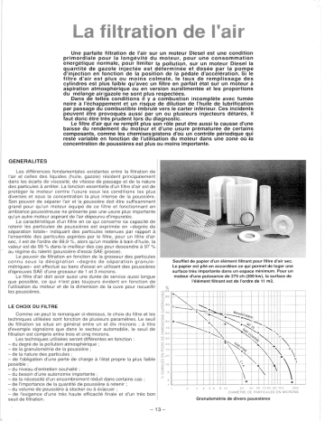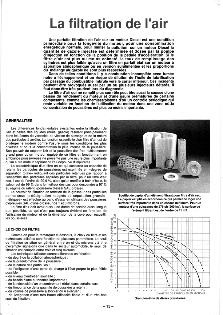 Une parfaite filtration de I'air sur un moteur Diesel est une condition primordiale pour la longévité du moteur, pour une consommation energétique normale, pour limiter la pollution, sur un moteur Diesel la quantité de gazole injectée est déterminée et dosée par la pompe d'injection en fonction de la position de la pédale d'accelération. Si le filtre d'air est plus ou moins colmaté, le taux de remplissage des cylindres est plus faible qu'avec un filtre en parfait état sur un moteur à aspiration atmosphérique ou en version suralimentée et les proportions du mélange airlgazole ne sont plus respectées. Dans de telles conditions il y a combustion incomplète avec fumée noire à l'échappement et un risque de dilution de l'huile de lubrification par passage du combustible imbrulé vers le carter inférieur. Ces incidents peuvent être provoqués aussi par un ou plusieurs injecteurs détarés, il faut donc être très prudent lors du diagnostic. Le filtre d'air qui ne remplit plus son rôle peut être aussi la causse d'une baisse du rendement du moteur et d'une usure prématurée de certains composants, comme les chemises/pistons d'où un contrôle périodique qui reste variable en fonction de I'utilisation du moteur dans une zone où &a concentration de poussières est plus ou moins importante. GENERALITES Les différences fondamentales existantes entre la filtration de I'air et celles des liquides (huile, gazole) résident principalement dans les écarts de viscosité, de vitesse de passage et de la nature des particules à arrêter. La fonction essentielle d'un filtre d'air est de protéger le moteur contre l'usure sous les conditions les plus diverses et sous la concentration la plus intense de la poussière. Son pouvoir de séparer I'air et la poussière doit être suffisamment grand pour qu'un moteur équipé de ce filtre et fonctionnant en ambiance poussiéreuse ne présente pas une usure plus importante qu'un autre moteur aspirant de I'air dépourvu d'impuretés. La caractéristique d'un filtre en ce qui concerne sa capacité de retenir les particules de poussières est exprimée en <<degrésde séparation totale,, indiquant des particules retenues par rapport à l'ensemble des particules aspirées par le filtre, pour un filtre d'air sec, il est de l'ordre de 99,9%, alors qu'un modèle à bain d'huile, la valeur est de 99 % dans le meilleur des cas pour descendre à 97 % au régime du ralenti (poussière d'essai SAE grosse). Le oouvoir de filtration en fonction de la arosseur des oarticules connu'sous la désignation <<degrésdesséparation Sranuiométriques,, est effectué au banc d'essai en utilisant des poussières d'épreuves SAE d'une grosseur de 1 et 3 microns. Le filtre d'air doit avoir aussi une durée de service aussi longue que possible, ce qui n'est pas toujours évident en fonction de l'utilisation du moteur et de la dimension de la cuve pour recueillir les poussières. Soufflet de papier d'un élément filtrant pour filtre d'air sec. Le papier est plié en accordéon ce qui permet de loger une surface très importante dans un espace minimum. Pour un moteur d'une puissance de 275 ch (200 kw), la surface de l'élément filtrant est de l'ordre de 11 m2. LE CHOIX DU FILTRE Comme an peut le remarquer ci-dessous, le choix du filtre et les techniques utilisées sont fonction de plusieurs paramètres. Le seuil de filtration se situe en général entre un et dix microns ; à titre d'exemple signalons que dans le secteur automobile, le seuil de filtration est compris entre trois et cinq microns. Les techniques utilisées seront différentes en fonction : - du degré de la pollution atmosphérique ; -de la granulométrie de la poussière ; -de la nature des particules ; - de l'obligation d'une perte de charge à l'état propre la plus faible possible ; -du niveau d'entretien souhaité ; -du besoin d'une autonomie importante ; -de la nécessité d'un encombrement réduit dans certains cas ; -de l'importance de la quantité de poussière à retenir ; - du volume de poussière à stocker ou à évacuer ; - de l'exigence d'une très haute efficacité finale et d'un très bon seuil de filtration. 1 2 3 4 5 6 8 1 0 20 3 0 4 0 50 6'2 80 100 200 DIAMETRE DE PARTICULES EN MICRONS Granulométrie de divers poussières Dans les pages qui suivent nous citons les principaux filtres d'air utilisés sur les moteurs Diesel. Le filtre à bain d'huile était présent dans de nombreuses applications jusque dans les années 1975, actuellement ce type d'appareil est encore en service sur certains matériels mais en laissant la place au filtre d'air sec. Le filtre d'air à bain d'huile est principalement prévu pour les applications dans lesquelles l'utilisation d'un filtre sec est exclue, souvent pour des questions d'approvisionnement ou de maintenance. Sur les voitures de tourisme et utilitaires légers, l'enveloppe est souvent en matière plastique d'où moins de corrosion, gain de poids mais aussi moins de bruit au passage de I'air. En ce qui concerne les applications industrielles, les enveloppes sont le plus souvent en acier en 1991, mais la matière plastique pourrait apparaître pour certaines séries de matériels dans quelques années. ENTREE D'AIR -1 Cuve à Poussieres Concentration moyenne en poussière de 1 à 1,50 m du sol (mg/m3) Elément filtrant à l'intérieur d'une enceinte avec buse d'entrée tangentielle donnant un effet centrifuge à I'air et cuve de récupération des poussières. Camions européens ................... . . . ......................... ............................... Camions hors Europe................. . . Camions tout terrain ........................................................ l... ( - - - -- - . - . -- . . . . - - ENTREE D'AIR -. Autocars européens avec admission d'air arrière ........... Autocars hors Europe avec admission d'air arrière ......... Matériels de travaux publics ............................................ k / -- . . ... Bala