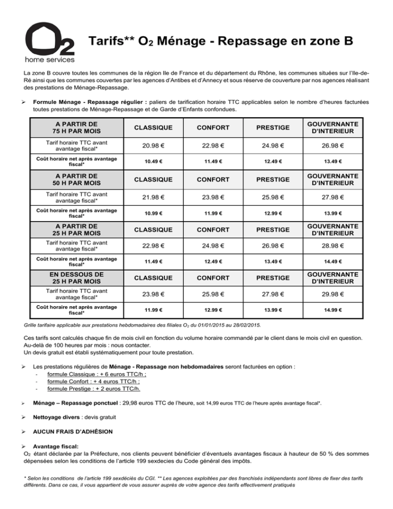 Tarifs** O2 Ménage - Repassage en zone B La zone B couvre toutes les communes de la région Ile de France et du département du Rhône, les communes situées sur l’Ile-deRé ainsi que les communes couvertes par les agences d’Antibes et d’Annecy et sous réserve de couverture par nos agences réalisant des prestations de Ménage-Repassage. Formule Ménage - Repassage régulier : paliers de tarification horaire TTC applicables selon le nombre d’heures facturées toutes prestations de Ménage-Repassage et de Garde d’Enfants confondues. A PARTIR DE 75 H PAR MOIS CLASSIQUE CONFORT PRESTIGE GOUVERNANTE D’INTERIEUR Tarif horaire TTC avant avantage fiscal* 20.98 € 22.98 € 24.98 € 26.98 € Coût horaire net après avantage fiscal* 10.49 € 11.49 € 12.49 € 13.49 € A PARTIR DE 50 H PAR MOIS CLASSIQUE CONFORT PRESTIGE GOUVERNANTE D’INTERIEUR Tarif horaire TTC avant avantage fiscal* 21.98 € 23.98 € 25.98 € 27.98 € Coût horaire net après avantage fiscal* 10.99 € 11.99 € 12.99 € 13.99 € A PARTIR DE 25 H PAR MOIS CLASSIQUE CONFORT PRESTIGE GOUVERNANTE D’INTERIEUR Tarif horaire TTC avant avantage fiscal* 22.98 € 24.98 € 26.98 € 28.98 € Coût horaire net après avantage fiscal* 11.49 € 12.49 € 13.49 € 14.49 € EN DESSOUS DE 25 H PAR MOIS CLASSIQUE CONFORT PRESTIGE GOUVERNANTE D’INTERIEUR Tarif horaire TTC avant avantage fiscal* 23.98 € 25.98 € 27.98 € 29.98 € Coût horaire net après avantage fiscal* 11.99 € 12.99 € 13.99 € 14.99 € Grille tarifaire applicable aux prestations hebdomadaires des filiales O2 du 01/01/2015 au 28/02/2015. Ces tarifs sont calculés chaque fin de mois civil en fonction du volume horaire commandé par le client dans le mois civil en question. Au-delà de 100 heures par mois : nous contacter. Un devis gratuit est établi systématiquement pour toute prestation. Les prestations régulières de Ménage - Repassage non hebdomadaires seront facturées en option : formule Classique : + 6 euros TTC/h ; formule Confort : + 4 euros TTC/h ; formule Prestige : + 2 euros TTC/h. Ménage – Repassage ponctuel : 29,98 euros TTC de l’heure, soit 14,99 euros TTC de l’heure après avantage fiscal*. Nettoyage divers : devis gratuit AUCUN FRAIS D’ADHÉSION Avantage fiscal: O2 étant déclarée par la Préfecture, nos clients peuvent bénéficier d’éventuels avantages fiscaux à hauteur de 50 % des sommes dépensées selon les conditions de l’article 199 sexdecies du Code général des impôts. * Selon les conditions de l’article 199 sexdéciès du CGI. ** Les agences exploitées par des franchisés indépendants sont libres de fixer des tarifs différents. Dans ce cas, il vous appartient de vous assurer auprès de votre agence des tarifs effectivement pratiqués Conditions et modes de paiement acceptés : Modalités de paiement applicables aux filiales O2 du 01/01/2015 au 28/02/2015. Les agences exploitées par des franchisés indépendants sont libres de fixer des modalités différentes. Dans ce cas, il vous appartient de vous assurer auprès de votre agence des modalités effectivement pratiquées. Pour le ménage-repassage régulier, les moyens de paiement sont : prélèvement automatique SEPA : le règlement des prestations du mois s’effectue à la quinzaine avec : - un premier prélèvement SEPA le 20 du mois, afférent au nombre d’heures de prestations réalisées pour la période allant du 1er au 14 du mois ; - la facture, émise le dernier jour du mois, informe le client de l’ensemble des heures réalisées dans le mois ; - un second prélèvement SEPA portant sur le solde Net à Payer sera réalisé le 7 du mois suivant ; chèques Emploi Service Universel (CESU) préfinancés : - qu’il s’agisse de CESU papiers ou en cas de recours à un système de dématérialisation des CESU, ces derniers devront être parvenus au centre administratif du Mans ou à votre agence pour les clients dépendants d’une agence franchisée avant le 20 du mois en cours pour être pris en compte pour le règlement de la facture du même mois. La preuve de la réception des CESU et des informations dématérialisées est à la charge du client ; - - tout paiement des prestations en CESU sera encaissé et non remboursable ; - - en l’absence de réception des CESU dans les délais susvisés, ou en cas de montant insuffisant de ces derniers : le prélèvement automatique SEPA qui sera réalisé le 7 du mois suivant complètera le paiement mensuel de la facture, si le client a choisi le prélèvement automatique SEPA comme moyen de paiement combiné ; l’envoi du chèque par le client complètera le paiement mensuel de la facture, si le client a choisi le chèque comme moyen de paiement combiné, et ce dès la réception de la facture. Ce moyen de paiement entraîne une facturation de frais de paiement de 3 euros TTC par mois et le versement à la signature du contrat d’une caution équivalente à 5 semaines de prestations ; chèque bancaire : le règlement des prestations du mois s’effectue à réception de la facture. Ce moyen de paiement entraîne une facturation de frais de paiement de 3 euros TTC par mois et le versement à la signature du contrat d’une caution équivalente à 5 semaines de prestations. En cas de choix par le client de paiement de tout ou partie de sa facture par prélèvement automatique SEPA, le prestataire et le client conviennent expressément que le délai de notification préalable avant chaque prélèvement sera réduit à deux jours. Pour le ménage-repassage ponctuel, les moyens de paiement sont : CESU + chèque bancaire ; chèque bancaire seul. Le paiement est effectif à la commande. Frais de gestion de 3 euros TTC mensuels offerts. Frais kilométriques : - absence de frais de transport pour les interventions ne nécessitant pas l’utilisation d’un véhicule pour se rendre sur les lieux de la prestation ; - pour les interventions nécessitant l’utilisation d’un véhi
