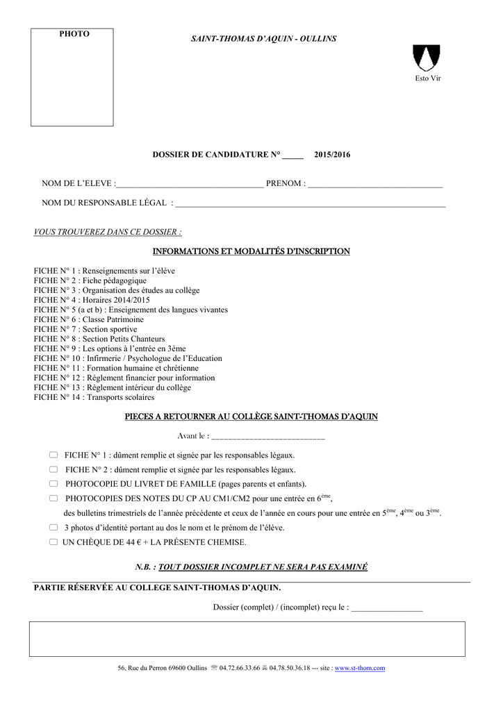 PHOTO SAINT-THOMAS D’AQUIN - OULLINS Esto Vir DOSSIER DE CANDIDATURE N° _____ 2015/2016 NOM DE L’ELEVE :___________________________________ PRENOM : ________________________________ NOM DU RESPONSABLE LÉGAL : ________________________________________________________________ VOUS TROUVEREZ DANS CE DOSSIER : INFORMATIONS ET MODALITÉS D’INSCRIPTION FICHE N° 1 : Renseignements sur l’élève FICHE N° 2 : Fiche pédagogique FICHE N° 3 : Organisation des études au collège FICHE N° 4 : Horaires 2014/2015 FICHE N° 5 (a et b) : Enseignement des langues vivantes FICHE N° 6 : Classe Patrimoine FICHE N° 7 : Section sportive FICHE N° 8 : Section Petits Chanteurs FICHE N° 9 : Les options à l’entrée en 3ème FICHE N° 10 : Infirmerie / Psychologue de l’Education FICHE N° 11 : Formation humaine et chrétienne FICHE N° 12 : Règlement financier pour information FICHE N° 13 : Règlement intérieur du collège FICHE N° 14 : Transports scolaires PIECES A RETOURNER AU COLLÈGE SAINT-THOMAS D’AQUIN Avant le : ___________________________ FICHE N° 1 : dûment remplie et signée par les responsables légaux. FICHE N° 2 : dûment remplie et signée par les responsables légaux. PHOTOCOPIE DU LIVRET DE FAMILLE (pages parents et enfants). PHOTOCOPIES DES NOTES DU CP AU CM1/CM2 pour une entrée en 6ème, des bulletins trimestriels de l’année précédente et ceux de l’année en cours pour une entrée en 5 ème, 4ème ou 3ème. 3 photos d’identité portant au dos le nom et le prénom de l’élève. UN CHÈQUE DE 44 € + LA PRÉSENTE CHEMISE. N.B. : TOUT DOSSIER INCOMPLET NE SERA PAS EXAMINÉ PARTIE RÉSERVÉE AU COLLEGE SAINT-THOMAS D’AQUIN. Dossier (complet) / (incomplet) reçu le : _________________ 56, Rue du Perron 69600 Oullins 04.72.66.33.66 04.78.50.36.18 --- site : www.st-thom.com Esto Vir Madame, Monsieur, Vous souhaitez inscrire votre enfant à Saint-Thomas d’Aquin-Veritas. Nous vous remercions de votre confiance. Nous vous prions de trouver dans ce dossier de nombreux renseignements sur notre maison et sur les modalités d’inscription. Saint-Thomas d’Aquin-Veritas est un établissement scolaire privé catholique fondé en 1833 et installé depuis 1836 au 56 Rue du Perron à Oullins. Cette ancienne maison de campagne des archevêques de Lyon permet en pleine ville d’assurer aux élèves un cadre de verdure et de plein air grâce à son parc, son terrain de sport, ses salles de sports et ses cours de récréation ombragées. Saint-Thomas d’Aquin-Veritas est né du catholicisme libéral illustré par le Père LACORDAIRE (18021861) dont les fils spirituels, les Dominicains ont dirigé l’établissement jusqu’en 1985. Dès l’origine, à Saint-Thomas, ont été privilégiées la conquête de la Liberté, la recherche de la Vérité, l’union de la Foi et de la Science, la pratique de la Miséricorde. La devise donnée par LACORDAIRE à notre établissement reste toujours un très bel idéal d’éducation « ESTO VIR », c’est-à-dire « Deviens un homme ». L’établissement continue à vivre ces valeurs au XXIème siècle. Notre encadrement humain et les moyens matériels mis en place sont au service de votre enfant. Notre principale réussite est le développement de ses talents et l’épanouissement de sa personnalité. Depuis 1961, nous sommes associés par contrat avec l’Enseignement Public. En 1967 notre établissement devient mixte. En 1970, est créé un collège annexe à Saint-Genis-Laval. En 1989, le collège privé de Mornant intègre notre centre scolaire Saint-Thomas- d’Aquin. En 2004 est créé un lycée annexe à Mornant. En 2012, l’école Sainte-Marie de Givors, l’école, le collège et le lycée professionnel Notre-Dame de Givors ont rejoint notre centre scolaire. Aujourd’hui, notre centre scolaire compte plus de 3 200 élèves répartis en cinq unités pédagogiques, sur cinq sites. Il reçoit demi-pensionnaires et externes. Le tableau au verso vous indique les structures du centre scolaire Saint-Thomas d’Aquin-Veritas. Restant à votre disposition pour d’autres renseignements, je vous prie d’agréer, Madame, Monsieur, l’expression de mes sentiments dévoués. Le Directeur Ph. BLANC 56, Rue du Perron 69600 OULLINS 04.72.66.33.66 04.78.50.36.18 --- Site : www.st-thom.com Esto Vir CENTRE SCOLAIRE SAINT-THOMAS D’AQUIN-VERITAS DIRECTEUR GÉNÉRAL : M. Philippe BLANC COLLÈGE D’OULLINS - 1833 LYCÉE D’OULLINS - 1833 Chef d’Etablissement : M. BLANC Formation humaine et chrétienne : Père A. HANNA o.p., Mmes PELLIN et BERNARD Conseiller Principal d’Education : M. MILLET Régent sixièmes : Mme DOUTRE Régent cinquièmes et quatrièmes : Mme PAREYRE Régent troisièmes : Mme CARBONI Secrétariat : Mme ROUDIER Chef d’Etablissement : M. BLANC Formation humaine et chrétienne : Père A. HANNA o.p. Conseiller Principal d’Education : M. LECLERE Régents secondes et premières : M. LACROIX Régents terminales : Mme CUCUMEL, séries L, ES, STMG et M. VILLEGAS, série S. Responsable Enseignement Supérieur : M. DESSEIGNE Secrétariat : M. CHELLAT COLLÈGE DE SAINT-GENIS LAVAL (annexe) - 1970 LYCÉE DE MORNANT (annexe) - 2004 Chef d’Etablissement : M. BLANC Directrice des Etudes : Mme MAZADE Formation humaine et chrétienne : Mmes RAHME et BERNARD Conseiller Principal d’Education : M. GIBAUD Secrétariat : Mme OLLIER Chef d’Etablissement : M. BLANC Formation humaine et chrétienne : Pères HANNA o.p. Directeur du site : M. DESSEIGNE Directrice des Etudes : Melle BRUYERE Conseiller Principal d’Education : Mme ROSA Secrétariat : Mmes DESORME et CHARPENTIER COLLÈGE DE MORNANT - 1989 LYCÉE PROFESSIONNEL NOTRE-DAME - 2012 Directeur : M. DESSEIGNE Formation humaine et chrétienne : Mmes RAHME et BERNARD Conseiller Principal d’Education : Mme ROSA Secrétariat : Mme VALDENAIRE Chef d’Etablissement : M. COMBARETTE Formation humaine et chrétienne : Père P.A. D’HARDEMARE COLLÈGE NOTRE-DAME - 2012 ÉCOLE 