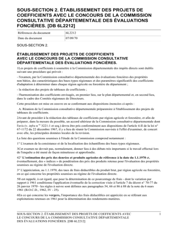 SOUS-SECTION 2. ÉTABLISSEMENT DES PROJETS DE COEFFICIENTS AVEC LE CONCOURS DE LA COMMISSION CONSULTATIVE DÉPARTEMENTALE DES ÉVALUATIONS FONCIÈRES. [DB 6L2212] Références du document 6L2212 Date du document 07/09/70 SOUS-SECTION 2. ÉTABLISSEMENT DES PROJETS DE COEFFICIENTS AVEC LE CONCOURS DE LA COMMISSION CONSULTATIVE DÉPARTEMENTALE DES ÉVALUATIONS FONCIÈRES. 1Les projets de coefficients à soumettre à la Commission départementale des impôts directs sont établis suivant une procédure qui prévoit : - l'examen, par la Commission consultative départementale des évaluations foncières des propriétés non bâties, des caractéristiques des baux-types régionaux et des paramètres significatifs des coefficients d'adaptation à déterminer dans chaque région agricole ou forestière du département ; - la rédaction des projets de tableaux de coefficients ; - l'harmonisation des coefficients envisagés, en premier lieu, sur le plan départemental et, en second lieu, dans le cadre des Comités régionaux de Directeurs. Cette procédure est mise en oeuvre en se conformant aux dispositions énoncées ci-après : A. Réunion de la Commission consultative départementale préparatoire à l'établissement des projets de tableaux de coefficients. 2Avant de procéder à la rédaction des tableaux de coefficients par région agricole et forestière, et afin de préparer, dans la mesure du possible, un accord ultérieur de la Commission consultative départementale dont l'avis (v. infra n os 3221-1 et seq.) devra être pris conformément aux dispositions de l'article 4-II de la loi n° 67-1172 du 22 décembre 1967, il y a lieu de réunir la Commission susvisée à l'effet d'examiner, de concert avec elle, les principales données locales de la revision. La liste des questions soumises à l'étude de la Commission comprend notamment : 1° L'examen de la consistance et de la localisation des échantillons des baux-types régionaux. 3Cet examen ne devrait pas, normalement, donner lieu à des débats très importants si le travail effectué lors de l'enquête a été mené de façon minutieuse et approfondie. 42° L'estimation des prix des denrées et produits agricoles de référence à la date du 1.1.1970 et, éventuellement, des « indices » de pondération des prix des produits retenus pour l'évaluation des propriétés soumises au régime de l'évaluation directe. 3° L'appréciation, au 1.1.1970, des taux de frais déductibles du produit brut, par région agricole ou forestière, en ce qui concerne les propriétés soumises au régime de l'évaluation directe. 5Il est rappelé, à cet égard, que pour la détermination de ce pourcentage de frais - dont la variation par rapport à 1961 conditionne l'application éventuelle de la correction visée à l'article 7 du décret n° 70-77 du 26 janvier 1970 - les règles à suivre sont définies aux paragraphes 54, 66 et 86 à 88 de la note du 6 mars 1961 (B.O.C.D., 1962, IV - 25). 6En ce qui concerne les vergers, l'importance des frais déductibles est appréciée en se référant aux exploitations retenues en 1961 pour la détermination des rendements-matières. SOUS-SECTION 2. ÉTABLISSEMENT DES PROJETS DE COEFFICIENTS AVEC LE CONCOURS DE LA COMMISSION CONSULTATIVE DÉPARTEMENTALE DES ÉVALUATIONS FONCIÈRES. [DB 6L2212] 1 7Pour ce qui est des vignes, le pourcentage de frais applicable dans la généralité des cas demeure de l'ordre de 80 % comme en 1961. Toutefois, il est admis que le pourcentage de frais déductibles du produit brut des vignes produisant des vins de consommation courante, d'une part, et celui afférent aux vignes produisant certains vins blancs d'appellation d'origine contrôlée connaissant actuellement des difficultés de commercialisation, d'autre part, peuvent, en principe, être portés, dans les cas les plus défavorables, à 85 % du produit brut. 8Enfin, en ce qui touche les bois, le pourcentage de frais moyen applicable au produit brut de chaque nature de bois se situe, en principe, à l'intérieur des pourcentages encadrants ci-après 1 dont la quotité a été arrêtée au terme d'une enquête effectuée dans plusieurs départements forestiers, particulièrement représentatifs des natures de bols examinées, et après avis de la Commission consultative nationale des évaluations foncières des propriétés non bâties : 94° L'examen des valeurs vénales des terrains à bâtir à la même date. 10Ce programme d'étude ne pouvant être épuisé au cours d'une séance unique, il lui est consacré deux ou plusieurs séances consécutives dont l'espacement tient compte des nécessités de l'information de la Commission et, également, des impératifs du calendrier assigné aux travaux (v. n os 3213-1 et seq .). 11L'esprit dans lequel sont menées les discussions, au sein de la Commission consultative départementale, est orienté vers la recherche en commun de conclusions raisonnables sur les divers points concernant l'ordre du jour. L'examen de ces points doit, par suite, s'achever normalement sur un accord sincère et complet entre les représentants de l'administration et ceux de la profession agricole. 12Enfin, il est signalé, touchant la composition de la Commission susvisée, qu'à la suite des modifications survenues dans l'organisation des services extérieurs du Ministère de l'Agriculture 2 le Directeur départemental de l'Agriculture remplace, dans les nouvelles structures, à la fois l'ancien Directeur départemental des Services agricoles et - pour partie de ses attributions - l'ancien Conservateur des Eaux et Forêts 3 . Compte tenu de ce fait nouveau, l'arrêté du Ministre de l'Économie et des Finances en date du 18 mars 1969 (v. annexe ne 3) a modifié l'article 121 quinquies B de l'annexe IV au Code général des Impôts relatif à la composition de la Commission consultative départementale en substituant aux anciens membres susmentionnés, respectivement, le Directeur départemental de l'