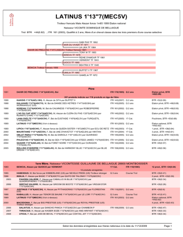 LATINUS 1'13"7(MEC5V) Trotteur francais Male Alezan fonce 1m65 1999 Etalon national Naisseur VICOMTE DOMINIQUE DE BELLAIGUE Trot BTR +44(0.82) , ITR 161 (2003), Qualifié à 2 ans, Mere d'un cheval classe dans les trois premiers d'une course selective SABI PAS TF 1962 FAKIR DU VIVIER TF 1971 UA UKA TF 1964 DAHIR DE PRELONG 1'14"2 (ASC4V) Trotteur francais 1991 TONY M TF 1963 MARIEVA TF 1978 REINE D'AMOUR TF 1961 VERMONT TF 1943 QUIOCO TF 1960 BEATRIX II TF 1945 BENICIA Trotteur francais 1989 BUFFET II TF 1967 RUMILIA TF 1983 GAMELIA TF 1972 Père 1991 DAHIR DE PRELONG 1'14"2(ASC4V), Bai ITR 170(1995) Q 2 ans Etalon privé, BTR +40(0.98) 1998 KAKISIS 1'13"0(AEL10H), H, Alezan de SITA par BUFFET II ITR 143(2007) Q 2 ans BTR +52(0.69) 1998 KALAHARI 1'12"6(ASC7V), M, Bai de DANSE DES HETRES 1'14"7(ASC6H) par WORKAHOLIC (US) ITR 143(2005) Q 3 ans Etalon privé, BTR +49(0.68) 1998 KOREAN 1'12"6(ASC4V), M, Bai de CALMNESS 1'16"0(AEC4V) par ROBESPIERRE 1'14"9(ASC5H) ITR 161(2002) Q 2 ans Etalon privé, BTR +49(0.93) 1999 L'AS DU CAP VERT 1'14"9(AEC3V), M, Alezan de CLERA DU PAS 1'20"5(AEC3H) par RUANITO D'ARC 1'13"7(ASC5H) ITR 140(2002) Q 2 ans Etalon privé, BTR +39(0.64) 1999 LANA SVELTE 1'13"3(ASC5V), F, Bai de EUSTASIE 1'16"6(AEL5V) par TURQUETIL 1'14"6(ASC4V) ITR 147(2005) 1? Cat. Pouliniere, BTR +50(0.68) 1999 LATINUS 1'13"7(MEC5V) (Voir ci-dessus) ITR 161(2003) Q 2 ans Etalon national, BTR +44(0.82) 1999 LIPICA 1'16"3(ASC4V), F, Alezan fonce de QUEEN SISTER 1'18"2(MEC7V) par ECU DE RETZ ITR 140(2003) 1? Cat. 1 prod., BTR +38(0.64) 2000 MAURITANIE 1'13"1(AEC5V), F, Bai de UNE D'HAVETOT 1'16"5(AEL6H) par HIKITAN ITR 141(2004) 1? Cat. 3 prod., BTR +44(0.61) 2002 OBLAT PIERJI 1'13"0(ASL7V), M, Bai de DARIOLA 1'16"1(AEL5V) par QUARISSO 1'14"9(ASC4V) ITR 140(2005) Q 2 ans Etalon privé, BTR +42(0.65) 2003 PHLEGYAS 1'12"9(AEC4V), M, Bai de GEA 1'19"5(AEC3H) par STEED JAMES 1'12"8(ASC6H) ITR 141(2006) Q 2 ans Etalon privé, BTR +42(0.62) 2004 QUAHIR 1'15"4(AEL4H), M, Bai de FORET NOIRE 1'15"7(ASC3H) par OURAGON 1'15"8(AEL7H) ITR 142(2008) Q 2 ans BTR +45(0.57) 2005 ROLLING D'HERIPRE 1'11"2(AEL4V), M, Bai de HARMONY BLUE 1'18"3(ASC3V) par BLUE DREAM 1'14"9(AEC4V) ITR 158(2009) Q 3 ans BTR +49(0.56) 1989 BENICIA, Alezan par QUIOCO par VERMONT 357 produits indicés sur 718 produits en âge de l'être 1ere Mère, Naisseur VICOMTESSE GUILLAUME DE BELLAIGUE 28800 MONTBOISSIER 1? Cat. ITR 118(1993) 12 prod., BTR +34(0.64) Q 3 ans Course Trot BTR +35(0.41) 12 produits enregistrés 1995 HABESSUS, M, Bai fonce par KIMBERLAND (US) par NEVELE PRIDE (US) Trotteur etranger 1996 INSILIA, F, Alezan par BASIC 1'14"9(ASC7V) par QUITO DE TALONAY 1'13"5(AEC5V) 2 prod., BTR +33(0.39) 2003 PAHORA VALIERE, F, Alezan par CABALLIO IN BLUE 1'16"2(ASC4V) par QUADROPHENIO 1'13"9(ASC6H) BTR +38(0.34) 2006 SERTAO VALIERE, M, Alezan par GROOM DE BOOTZ 1'13"5(AEC6V) par VROUM D'OR 1'13"3(ASC5H) BTR +35(0.29) 1997 JUSTINUS 1'18"8(AEC3H), H, Alezan par PYTHAGORAS 1'13"8(ASC5V) par FLORESTAN (US) ITR 110(2001) Q 2 ans BTR +29(0.6) 1998 KABALLUS, H, Alezan par TENOR DE BAUNE 1'14"3(ASC4V) par LE LOIR 1'17"4(AEC4V) Q 3 ans BTR +41(0.41) 1999 LATINUS 1'13"7(MEC5V) (Voir ci-dessus) ITR 161(2003) Q 2 ans 2000 MACEDONIA, F, Bai par BIG PRESTIGE (US) 1'14"6(ASC3H) par ROYAL PRESTIGE (US) Trotteur etranger Course Trot Etalon national, BTR +44(0.82) 4 prod., BTR +32(0.43) 2006 SALIATUS, H, Alezan par SANCHO PANCA 1'15"2(AEC5V) par CHAMBON P 2007 THRACIUS, H, Alezan par KAISER SOZE 1'12"8(AEC5V) par AND ARIFANT 1'16"5(ASC4V) ITR 106(2009) Q 3 ans BTR +38(0.33) 2008 UTICIA, F, Bai par JAIN DE BEVAL 1'13"6(AEC4V) par COKTAIL JET 1'11"2(ASC5H) BTR +36(0.34) Selon les données enregistrées aux Haras nationaux à la date du 11/12/2009 BTR +39(0.47) Page 1 Fiche de LATINUS 2009 VEHEMENTIA, F, Bai par NEOH JIEL 1'13"3(MEC5V) par CAPRICCIO 1'12"3(ASC7V) BTR +44(0.26) 2001 NEREUS 1'13"7(MEL6H), H, Alezan par SANCHO PANCA 1'15"2(AEC5V) par CHAMBON P ITR 136(2009) Q 2 ans BTR +49(0.67) 2002 OBRIZIUS, H, Bai fonce par ELVIS DE ROSSIGNOL 1'13"0(ASC7H) par SANCHO PANCA 1'15"2(AEC5V) Q 2 ans Course Trot BTR +43(0.39) 2003 PHENICIA, F, Bai par ELVIS DE ROSSIGNOL 1'13"0(ASC7H) par SANCHO PANCA 1'15"2(AEC5V) Q 4 ans Course Trot 1 prod., BTR +43(0.39) 2009 VULCANIA, F, Bai par ORLANDO VICI 1'12"7(ASC4V) par QUADROPHENIO 1'13"9(ASC6H) BTR +46(0.26) 2005 REGENCIA, F, Alezan par DAHIR DE PRELONG 1'14"2(ASC4V) par FAKIR DU VIVIER 2007 TERENTIA, F, Alezan par KERIDO DU DONJON 1'12"0(ASC4H) par COKTAIL JET 1'11"2(ASC5H) Prime Sel. Q 3 ans BTR +29(0.51) BTR +38(0.39) 2009 VENICIA, F, Alezan par NEOH JIEL 1'13"3(MEC5V) par CAPRICCIO 1'12"3(ASC7V) BTR +45(0.31) 1983 RUMILIA, Alezan par BUFFET II par NONANT LE PIN 2eme Mère, Naisseur VICOMTE GUILLAUME DE BELLAIGUE 1? Cat. Q 3 ans 7 prod., BTR +37(0.65) ITR 118(1993) 12 prod., BTR +34(0.64) 7 produits enregistrés 1989 BENICIA (Voir ci-dessus) 1? Cat. 1990 CILICIA 1'15"4(AEC6V), F, Bai brun fonce par JET DE PRAPIN 1'16"7(AEC6V) par SABI PAS ITR 131(1996) 1? Cat. 10 prod., BTR +32(0.68) 1999 LAODICIA, F, Noir par QUITO DE TALONAY 1'13"5(AEC5V) par FLORESTAN (US) 2000 MYSCELUS 1'18"2(AEL7H), H, Bai par GANYMEDE 1'11"4(ASC6H) par BUVETIER D'AUNOU (US) 1'14"4(AEC4V) Course Trot 2001 NEPTUNUS 1'16"3(ASC4V), H, Noir pangare par ELVIS DE ROSSIGNOL 1'13"0(ASC7H) par SANCHO PANCA 1'15"2(AEC5V) ITR 110(2004) Q 2 ans 2002 ORTUS, H, Bai par TENOR DE BAUNE 1'14"3(ASC4V) par LE LOIR 1'17"4(AEC4V) BTR +40(0.42) 2004 QUABALUS, H, Noir par TENOR DE BAUNE 1'14"3(ASC4V) par LE LOIR 1'17"4(AEC4V) BTR +40(0.42) 2005 RABIRIUS 1'17"4(ASC3H), H, Bai par ELVIS DE ROSSIGNOL 1'13"0(ASC7H) par SANCHO ITR 113(2008) Q 2 ans PANCA 1'15"2(AEC5V) BTR +44(0.57) 2006 SALVIUS, M, Bai par GANYMEDE 1'11"4(ASC6H) par BUVETIER D'AUNOU (US) 1'14"4(AEC4V) BTR +44(0.41) 2007 TYRUS, M, Alezan par MAGOT DU RAVARY 1'11"7(ASC5V) par CYGNUS D'ODYSSEE 1'13"9(ASC9V) BTR +41(0.36) 2008 ULICIA, F, Bai par NIL DU RIB 1'13"2(MEC5V) par VIKING'S WAY 1'15"6(ASC3H) BTR +43(