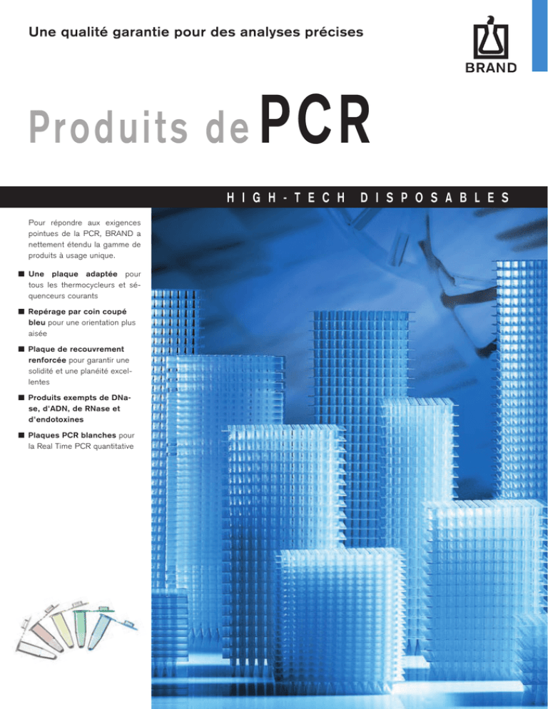 Une qualité garantie pour des analyses précises Produits de PCR H I G H - T E C H Pour répondre aux exigences pointues de la PCR, BRAND a nettement étendu la gamme de produits à usage unique. Une plaque adaptée pour tous les thermocycleurs et séquenceurs courants Repérage par coin coupé bleu pour une orientation plus aisée Plaque de recouvrement renforcée pour garantir une solidité et une planéité excellentes Produits exempts de DNase, d'ADN, de RNase et d'endotoxines Plaques PCR blanches pour la Real Time PCR quantitative D I S P O S A B L E S PCR Aussi riches en variantes que les applications! BRAND a étendu la gamme de produits à usage unique à paroi extrêmement fine conçue spécialement afin de satisfaire aux exigences PCR, notamment des plaques PCR 96 puits. Des tubes individuels, des barrettes de 8 et 12 tubes et, pour les passages fréquents d’échantillons, des plaques PCR 24, 48, 96 et 384 puits sont disponibles. Pour la PCR quantitative, il est possible de recourir aux variantes blanches des plaques et bandes. Un large choix de milieux haut de gamme vient compléter l'assortiment. Ainsi, un produit optimal est disponible pour pratiquement chaque application. Critères n Utilisation universelle dans presque tous les thermocycleurs courants n PP, épaisseurs de paroi constantes et très fines offrant un transfert thermique optimal et des temps de cycle courts n La grande solidité des plaques réduit le risque de déformation pendant l'étape de chauffage n Plaques PCR 96 puits avec codage alphanumérique bleu et repère sur les coins coupés n Bouchons plats très transparents convenant de manière optimale pour les analyses qPCR n Grande biocompatibilité sans effet inhibiteur de PCR n Exempts de DNase, ADN, RNase et endotoxines n Autoclavables à 121 °C (2 bar), selon DIN EN 285 Production en salle blanche Les articles BRAND à usage unique destinés au domaine Life Science sont fabriqués à l'aide d'une technologie de prévention de la contamination des plus modernes et dans l'une des plus grandes salles blanches pour la production d'articles de laboratoire à usage unique au monde. Conjuguée à une régulation précise des conditions ambiantes, la surveillance continue de la salle blanche permet d'assurer des températures constantes dans l'ensemble de la zone de production. Cette constance, de même que le contrôle par lots des produits finis, garantissent le niveau de qualité élevé et constant des produits Life Science de BRAND. En fonction du domaine d'application auquel le produit final sera destiné, des conditions de salle blanche conformes à la norme ISO 14 644-1 (catégories 5, 7 et 8) sont disponibles pour la production. Real Time PCR q!PCR q!PCR q!PCR q!PCR Plaques PCR: Plaques pour thermocycleur Real Time quantitatif, également disponibles en blanc Tubes PCR: Tubes possédant un bouchon très transparent pour une détection sensitive des signaux fluorescents Milieux PCR: Milieux très transparents pour la détection sensitive de signaux fluorescents Les autoclaves peuvent représenter une source de contamination des articles à usage unique! Remarque! La réaction en chaîne de la polymérase (PCR) peut être protégée en fonction du droit des brevets. L’acquisition de ces produits n'entraîne pas automatiquement la concession de la licence pour la réalisation de la PCR. Produits PCR blancs Afin de permettre d'obtenir des résultats optimaux lors de la PCR quantitative, BRAND propose des produits à usage unique blancs pour PCR conçus spécialement à cet effet. Ces plaques et récipients pour PCR blancs permettent de réaliser la détection par fluorescence extrêmement sensible et très précise. Par rapport aux plaques transparentes classiques, les produits pour PCR blancs amplifient le signal réfléchi, ce qui permet de mesurer des signaux très faibles. 40.000 30.000 Fluorescence (dR) 50.000 parois de puits transparentes 20.000 10.000 crossing point Cycle 10 puits blancs 20 30 40 50 puits transparents Amplification qPCR de 100 ng, 10 ng et 1 ng d'ADN humain, avec des plaques blanches (lignes bleues) et des plaques transparentes (lignes vertes). Avec les produits pour PCR blancs, le seuil Cp (crossing point) peut être atteint plus rapidement et la fluorescence mesurée au point final est nettement plus élevée. parois de puits blanches De plus, les parois blanches des produits pour PCR empêchent la propagation de signaux dans l'ensemble du bloc de thermocycleur. Le résultat de la mesure n'est donc pas faussé et devient plus précis. Tubes individuels et barrettes de tubes PCR Les tubes PCR 0,2 ml et 0,5 ml avec capuchon attaché sont appropriés pour l‘utilisation dans les thermocycleurs munis de couvercles chauffants de la plupart des fabricants. La fermeture optimale des capuchons attachés permet de réduire au minimum la perte de liquide par évaporation. Les capuchons sont faciles à ouvrir et à fermer sans outils. Les tubes PCR disponibles dans plusieurs couleurs permettent de classer rapidement les échantillons. capuchon bombé capuchon plat 0,2 ml et 0,5 ml capuchon attaché PP. Emballage standard 1000 unités. Capacité ml Description Couleur 0,2 capuchon bombé incolore 0,2 capuchon plat incolore capuchon plat rose capuchon plat jaune 7813 02 capuchon plat vert 7813 03 capuchon plat bleu 7813 04 capuchon plat incolore capuchon plat rose capuchon plat jaune 7813 12 capuchon plat vert 7813 13 capuchon plat bleu 7813 14 0,5 Réf. 7813 00 q!PCR 7813 05 7813 01 q!PCR 7813 10 7813 11 Barrettes de 8 bande de bouchons non attachée PP. 8 tubes de 0,2 ml en barrette. Les bouchons bombés ou plats, non attachés, sont disponibles par bande de 8. Ils sont faciles à ouvrir et à fermer sans outils. A l’une de leurs extrémités, les tubes possèdent une languette de maintien, les bandes de bouCapacité ml Couleur Barrette de 8 tubes PCR Réf. 0,2 incolore 7813 20 rose 7813 21 jaune vert chons sont prévues avec un 