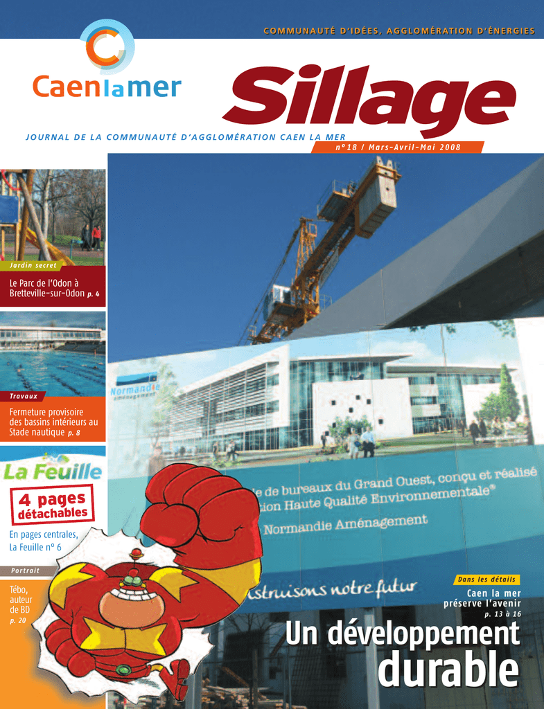 C CO OM MM MU UN NA AU U TT ÉÉ D D ’’ II D D ÉÉ EE SS ,, A AG GG G LL O OM M ÉÉ R R AT AT II O ON N D D ’’ ÉÉ N N EE R RG G II EE SS Sillage J O U R N A L D E L A C O M M U N A U T É D ’ A G G L O M É R AT I O N C A E N L A M E R n° 18 / Mars-Avril-Mai 2008 n°1 / juin 2003 Jardin secret Le Parc de l’Odon à Bretteville-sur-Odon p. 4 Tr a v a u x Fermeture provisoire des bassins intérieurs au Stade nautique p. 8 4 pages détachables En pages centrales, La Feuille n° 6 Portrait Dans les détails Tébo, auteur de BD p. 20 Caen la mer préserve l’avenir p. 13 à 16 Un développement durable Arrière-boutique Caen-Carpiquet gagne des parts de marché AV E C U N E A U G M E N TAT I O N D E 9 % D U N O M B R E D E S PA S S A G E R S D E S L I G N E S R É G U L I È R E S E N T R E 2 0 0 6 E T 2 0 07, O RG A N I S É E S A U TO U R D E S VO L S C AE N - LYO N , L’A É RO P O RT D E C AE N - C A R P I Q U E T, P RO P R I É T É D E C AE N L A M E R , P O U R S U I T S O N A N C R A G E R É G I O N A L . A U J O U R D ’ H U I , LE P R E M I E R A É RO P O RT N O R M A N D S ’ E N G A G E D A N S L A LU TT E C O N T R E LE S N U I S A N C E S S O N O R E S S U P P O RT É E S PA R LE S R I V E R A I N S E N A D O P TA N T U N E C H A RT E D E S B O N N E S P R AT I Q U E S D E S O N E N V I RO N N E M E N T. Se faire un nom Surprise. Caen la mer, désormais propriétaire de l’aéroport, a appris par un courrier de la Direction générale de l’aviation civile (DGAC) que l’aéroport de Deauville - Saint-Gatien souhaitait changer de nom pour devenir Deauville – Normandie. Pour les élus - qui se sont exprimés lors du conseil communautaire du 12 décembre 2007 - et le président de la CCI de Caen, l’aéroport communautaire peut légitimement, au regard des chiffres de son activité, de son ancrage auprès de la capitale régionale de la BasseNormandie, revendiquer le droit de porter le nom de Normandie. Fréquentation en hausse Plus de 211 000 passagers ont transité, en 2007, par l’aéroport de Caen-Carpiquet, soit une progression globale de 5 %. Les vols non commerciaux ont totalisé 99 202 passagers (+ 4 %) et les vols commerciaux 112 091 passagers (+ 5 %). Les bons résultats sont dus aux lignes régulières dont la fréquentation a augmenté de 9 % (92 483). Cette progression est notamment à mettre à l’actif des compagnies Brit Air (+ 7 %) et de Sky South, la dernière arrivée sur le tarmac. Charte de l’environnement Le bruit est une nuisance pour les riverains des aéroports. Celui de Caen-Carpiquet ne déroge pas à la règle. Aussi, Caen la mer s’engage pour atténuer l’impact du bruit sur les riverains en se dotant d’une charte de l’environnement. Celle-ci ne concerne que les activités de l’aviation générale (voltige, parachutage, avion de collection et ULM). L’aviation commerciale n’est pas concernée. Dans ce document des bonnes pratiques, six thèmes sont déclinés : respect de la réglementation, réduction des émissions sonores, modification de la VAC (carte d’approche à vue), modification des trajectoires… Plus d’informations sur www.caenlamer.fr éditorial perspectives « Le plus bel avenir possible » Caen la mer Les 29 communes de la Communauté d’agglomération de Caen la mer Authie [1] Bénouville [2] Biéville-Beuville [3] Blainville-sur-Orne [4] Bretteville-sur-Odon [5] Caen [6] Cambes-en-Plaine [7] Carpiquet [8] Colombelles [9] Cormelles-le-Royal [10] Cuverville [11] Démouville [12] Épron [13] Éterville [14] Fleury-sur-Orne [15] Giberville [16] Hermanville-sur-Mer [17] Hérouville Saint-Clair [18] Ifs [19] Lion-sur-Mer [20] Louvigny [21] Mathieu [22] Mondeville [23] Périers-sur-le-Dan [24] Saint-Aubin-d’Arquenay [25] Saint-Contest [26] Saint-Germain-la-Blanche-Herbe [27] Sannerville [28] Villons-les-Buissons [29] U La prochaine séance de Caen la mer Le prochain conseil communautaire aura lieu le vendredi 18 avril 2008 à l’hôtel de ville de Caen. Ce sera le premier conseil du nouveau mandat qui donnera lieu à la désignation, par les nouveaux élus, des vice-présidences et de la présidence. « Ce qui constitue une nation, ce n’est pas de parler la même langue, ou d’appartenir à un groupe ethnographique commun, c’est d’avoir fait ensemble de grandes choses dans le passé et de vouloir en faire encore dans l’avenir ». Ernest Renan C’est avec bien sur beaucoup d’émotion que j’écris ce dernier éditorial du mandat en cours. Dans quelques semaines, après le conseil prévu le 18 avril 2008, une nouvelle assemblée communautaire sera mise en place à Caen la mer. Il me revient donc le devoir de vous rappeler l’importance de votre vote, les 9 et 16 mars prochains, tant pour les élections municipales que pour les cantonales. La démocratie est un bien précieux de par le monde et votre mobilisation sera le signe du dynamisme du modèle français. Par ailleurs, je ne peux rédiger la conclusion, certes symbolique, de ce mandat sans avoir en tête au moins trois éléments. D’une part, il est notoire que le principe même de l’intercommunalité a fait son chemin dans tous les esprits. La mutualisation des moyens pour des intérêts et des objectifs communs est devenu une évidence et ce qui semblait peu naturel il y a quelques années est devenu un mode de gouvernance attendu. D’autre part, je veux souligner la puissance qui est celle d’une institution publique lorsque le clivage partisan est oublié et lorsque écoute et dialogue sont au rendez-vous. Bien avant que cela soit une mode, Caen la mer a rassemblé et fédéré, en toute « ouverture », des élus de tous horizons. L’engagement de tous pour l’intérêt général a été exemplaire. Enfin, je veux noter combien Caen la mer a réussi à combattre le fatalisme. Et derrière ces mots ne se cache pas un bilan comptable, mais un bilan humain. La mission de l’intercommunalité est bien celle-ci : lut