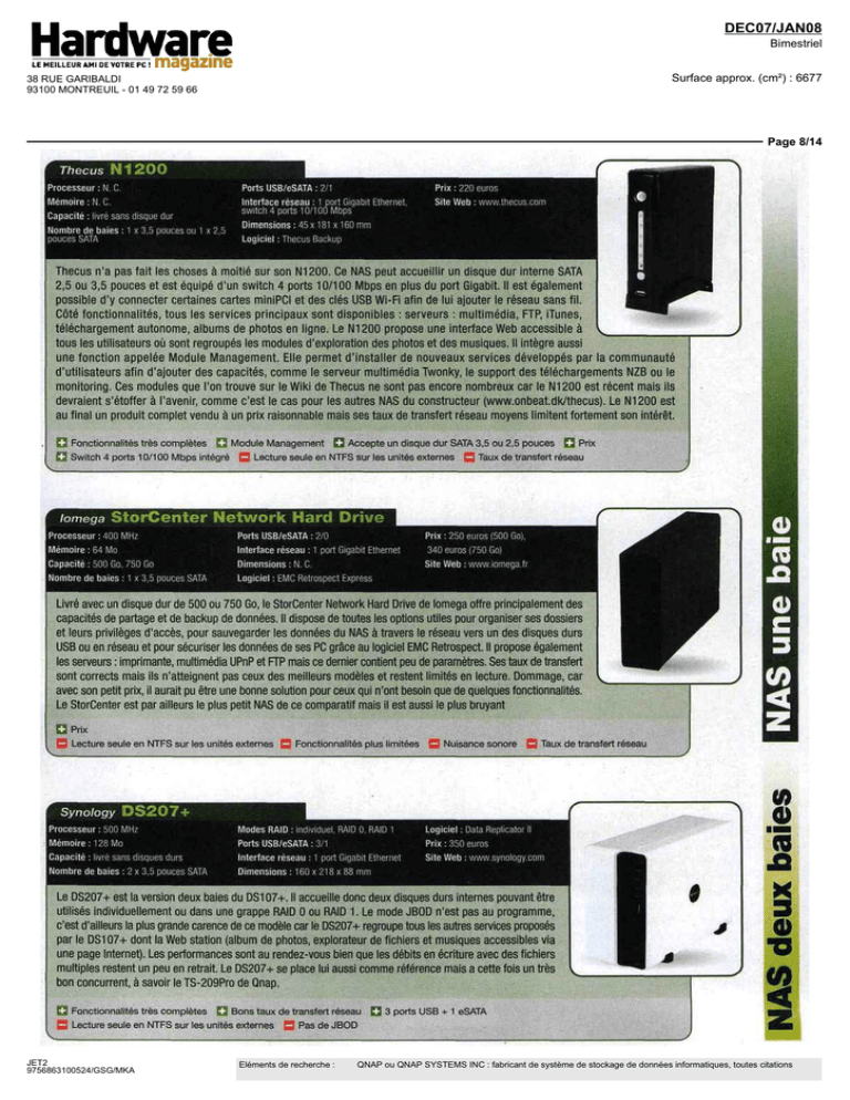 DEC07/JAN08 Bimestriel Surface approx. (cm²) : 6677 38 RUE GARIBALDI 93100 MONTREUIL - 01 49 72 59 66 Page 8/14 Thecus Nl200 Processeur : N. C. Ports USB/eSATA : 2/1 Mëmoire : N. C. Interface réseau : 1 port Gigabit Ethernet, Capacité : livré sans disque dur Nombre de baies : 1 x 3,5 pouces ou 1 x 2,5 pouces SATA Prix : 220 euros switch 4 ports 10/100 Mbps Dimensions : 45 x 181 x 160 mm Logiciel : Thecus Backup Thecus n'a pas fait les choses a moitie sur son Nl200 Ce NAS peut accueillir un disque dur interne SATA 2,5 ou 3,5 pouces et est equipe rj un switch 4 ports 10/100 Mbps en plus du port Gigabit ll est également possible d'y connecter certaines cartes mmiPCI et dés cles USB Wi-Fi afm de lui ajouter le reseau sans fil Côte fonctionnalités tous les services principaux sont disponibles serveurs multimedia, FTP iTunes, telechargement autonome, albums de photos en ligne Le Nl 200 propose une interface Web accessible a tous les utilisateurs ou sont regroupes les modules d'exploration des photos et des musiques ll integre aussi une fonction appelée Module Management Elle permet d'installer de nouveaux services developpes par la communaute d'utilisateurs afm d'ajouter des capacites, comme le serveur multimedia Twonky, le support des téléchargements NZB ou le monitoring Ces modules que l'on trouve sur le Wiki de Thecus ne sont pas encore nombreux car le Nl 200 est recent maîs ils devraient s'étoffer a l'avenir, comme c'est le cas pour les autres NAS du constructeur (www onbeat dk/thecus) Le Nl200 est au final un produit complet vendu a un pnx raisonnable maîs ses taux de transfert reseau moyens limitent follement son interêt CH Fonctionnalités tres completes Q Module Management ID Accepte un disque dur SATA 3 5 ou 2 5 pouces d Pnx Q Switch 4 ports 10/1 OO Mbps integre B Lecture seule en NTFS sur les unites externes M Taux de transfert reseau iomega StorCenter Network Hard Drive Processeur : 400 MHz Ports USB/eSATA : 2/0 Mémoire : 64 Mo Interface réseau : 1 port Gigabit Ethernet Capacité : 500 Go, 750 Go Dimensions : N C. Nombre de baies : 1 x 3,5 pouce Logiciel : EMC Retrospect Express Pnx : 250 euros [500 Go), 340 euros (750 Go) Site Web : www.iomega.fr Livre avec un disque dur de 500 ou 750 Go, le StorCenter Network Hard Drive de Iomega offre principalement des capacites de partage et de backup de donnees ll dispose de toutes les options utiles pour organiser ses dossiers et leurs privileges d acces, pour sauvegarder les donnees du NAS a travers le reseau vers un des disques durs USB ou en reseau et pour securiser les donnees de ses PC grâce au logiciel EMC Retrospect ll propose également les serveurs imprimante, multimedia UPnP et FP maîs ce dernier contient peu de paramètres Ses taux de transfert sont corrects maîs ils n'atteignent pas ceux des meilleurs modeles et restent limites en lecture Dommage, car avec son petit pnx, il aurait pu être une bonne solution pour ceux qui n'ont besoin que de quèlques fonctionnalités Le StorCenter est par ailleurs le plus petit NAS de ce comparatif maîs il est aussi le plus bruyant DPnx D Lecture seule en NTFS sur les unites externes G Fonctionnalités plus limitées Q Nuisance sonore Q Taux de transfert reseau (ft Synology DS207+ Processeur : 500 MHz Modes RAID : individuel, RAID O, RAID 1 Mémoire: 128 Mo Ports USB/eSATA : 3/1 Capacité : livré sans disques durs Nombre de baies : 2 x 3,5 pouces SATA Interface réseau : 1 port Gigabit Ethernet Logiciel : Data Replicator ll Prix : 350 euros Site Web : www.synology.com Dimensions : 160 x 218 x 88 mm Le DS207+ est la version deux baies du DSI 07+ ll accueille donc deux disques durs internes pouvant être utilises individuellement ou dans une grappe RAID O ou RAID 1 Le mode JBOD n'est pas au programme, c'est d'ailleurs la plus grande carence de ce modele car le DS207+ regroupe tous les autres services proposes par le DSI 07+ dont la Web station (album de photos explorateur de fichiers et musiques accessibles via une page Internet) Les performances sont au rendez-vous bien que les debits en ecriture avec des fichiers multiples restent un peu en retrait Le DS207+ se place lui aussi comme reference maîs a cette fois un tres bon concurrent, a savoir le TS-209Pro de Qnap Q Fonctionnalités tres completes Q Bons taux de transfert reseau H 3 ports USB + 1 eSATA G Lecture seule en NTFS sur les unites externes Q Pas de JBOD JET2 9756863100524/GSG/MKA Eléments de recherche : o I O) TJ i QNAP ou QNAP SYSTEMS INC : fabricant de système de stockage de données informatiques, toutes citations DEC07/JAN08 Bimestriel Surface approx. (cm²) : 6677 38 RUE GARIBALDI 93100 MONTREUIL - 01 49 72 59 66 Page 9/14 Qnap TS-209Pro Processeur: 500 MHz Memoire: 128 Mo Modes RAID : individuel, JBOD, RAID 0, RAID 1 Logiciel: NetBak Replicator Ports USB/eSATA: 3/0 Prix: 370 euros Capacite: livre sans disques durs Nombre de baies: 2 x 3,5 pouces SATA Interface reseau: 1 port Gigabit Ethernet Dimensions: 214 x 175 x 115 mm Site Web: www.qnap.com Le TS-109Pro a rate I'award mais le TS-209Pro a deux baies cornge le tir II possede les memes services que son petit frere et offre quelques parametres un peu plus avances que le DS207+ tels que le controle de la ventilation ou la corbeille reseau Ses disques durs internes peuvent etre configures mdividuellement, en JBOO, en RAID 0 ou en RAID 1 II affiche egalement de bons debits dont une moyenne de 28 Mo/s en ecnture avec des fichiers volummeux II se montre d'ailleurs plus rapide que tous les NAS a une, deux ou quatre baies de ce comparatif II ne lui manque done pas grand-chose et represente un excellent mvestissement, meme si vous ne comptez pas exploiter tous ses services Dommage que son ventilateur ne soil pas un peu plus discret mais la nuisance reste legere CJ Fonctionnalites tres completes £J Bons taux de transfer! reseau J. j 3 ports USB D Lecture seule en NTFS sur les unites externes Q Legere nuisance sonore Les racks pour les disques durs internes DLink D