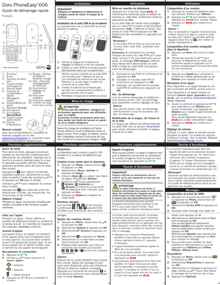 ® Éteignez le téléphone et débranchez le chargeur avant de retirer la trappe de la batterie. Français Installation de la carte SIM et de la batterie 1 Le compartiment de la carte SIM se trouve derrière la batterie. 2 1 2 3 4 14 15 3 4 5 6 7 12 13 11 10 16 17 son indicatif. Effacez avec Effacer. 2. Appuyez sur pour émettre l’appel. Appuyez sur Annul pour annuler l’appel. 3. Appuyez sur pour mettre fin à l’appel. Astuce ! Pour la réalisation d’appels internationaux, insérez toujours le signe + avant le code du pays pour obtenir un résultat optimal. Appuyez deux fois sur * pour insérer le préfixe international +. Si les codes PIN et PUK ne sont pas fournis avec votre carte SIM, contactez votre opérateur. 18 19 Composition d’un numéro enregistré dans le répertoire 1. Appuyez sur Nom pour ouvrir le réper- Restants: # correspond au nombre 9 8 1. Écouteur 2. Écran 3. Touches de direction 4. Touche contextuelle gauche 5. Touche Appel 6. Touches de numérotation rapide 7. Messagerie vocale 8. Silence/Mode de saisie 9. Raccourci Message 10.Microphone 11.Fin d’appel/ Marche/Arrêt 12.Touche contextuelle droite 13.Touche d´Assistance Composition d’un numéro 1. Saisissez le numéro de téléphone avec Mise en marche du téléphone Appuyez sur la touche rouge , et maintenez-la enfoncée pour le mettre en marche ou l’éteindre. Confirmez l’arrêt en appuyant sur Oui. Si la carte SIM est valide mais protégée par un code PIN (numéro d’identification personnel), PIN : s’affiche à l’écran. Saisissez le code PIN et appuyez sur OK. Supprimez des caractères en appuyant sur Effacer. Remarque ! Important! Guide de démarrage rapide Utilisation Utilisation Installation Doro PhoneEasy 606 1. Retirez la trappe de la batterie et dégagez la batterie si elle est installée. 2. Insérez la carte SIM en la faisant glisser délicatement dans son compartiment. Vérifiez que les contacts de la carte SIM sont tournés vers l’intérieur et que le coin biseauté est positionné vers le bas. Attention à ne pas rayer ni tordre les contacts de la carte SIM. 3. Insérez la batterie en la faisant glisser dans son compartiment (contacts à gauche tournés vers le haut). 4. Remettez la trappe de la batterie en place. 14.Rouge = Niveau de batterie faible/en charge 15.Vert = Nouveau message/appel en absence 16.Haut-parleur 17.Réglage du volume 18.Prise pour chargeur 19.Prise pour casque 20.Fixation de dragonne (pas inclus) Lors du premier démarrage du téléphone, vous pouvez utiliser l’Ass. de démarrage pour paramétrer certains réglages de base. Astuce: Vous pouvez lancer l’Ass. de démarrage ultérieurement si vous le souhaitez, voir Ass. de démarrage. ATTENTION 1 Quand la charge de la batterie est faible, l’écran affiche et le téléphone émet un signal sonore. Pour charger la batterie, raccordez l’adaptateur secteur à une prise de courant murale et à la prise pour chargeur y. Saisir du texte Pour saisir du texte, appuyez à plusieurs reprises sur les touches numériques pour sélectionner les caractères. Appuyez sur la touche à plusieurs reprises jusqu’à ce que le caractère souhaité s’affiche. Patientez quelques secondes avant de saisir le caractère suivant. Appuyez sur * pour obtenir la liste des caractères spéciaux. Sélectionnez le caractère souhaité à l’aide des touches / et appuyez sur OK pour le valider. Utilisez / pour déplacer le curseur dans le texte. Appuyez sur # pour basculer entre les majuscules initiales, les majuscules, les minuscules et les chiffres. Options d’appel Pendant un appel, les touches virtuelles permettent d’accéder à des fonctions supplémentaires. 2 Répertoire Le répertoire peut contenir jusqu’à 100 entrées et 3 numéros de téléphone par entrée. Création d’une entrée dans le répertoire 1. Appuyez sur Menu, placez-vous sur et appuyez sur OK. 2. Sélectionnez -Nouv. entrée- et appuyez sur Ajout.. 3. Entrez le Nom du contact (voir Saisir du texte). Effacez avec Effacer. 4. Utilisez / pour sélectionner Mobile, Domicile ou Bureau, et entrez le ou les numéros de téléphone avec l’indicatif, puis appuyez sur Enr.. 5. Appuyez sur pour repasser en mode veille. Infos sur l’appel Pendant un appel, l’écran affiche le numéro de téléphone entrant ou sortant et le temps écoulé. Si l’identité de l’appelant est masquée, Inconnu s’affiche. Récupération et composition 1. Appuyez sur . 2. Utilisez / pour parcourir le = Entrants = Sortants = Appel manqué 3. Appuyez sur pour composer le numéro. 5 Touche d´Assistance Appels d’urgence Vous pouvez passer un appel d’urgence tant que le téléphone est allumé en composant le numéro d’urgence local du pays où vous vous trouvez et en appuyant sur . •La fonction Assistance peut être configurée de sorte que la personne recevant l’appel doive appuyer sur «0» (zéro) pour confirmer, afin d’arrêter la séquence d’urgence. Si l’appel d’Assistance risque d’être pris en charge par une messagerie vocale ou un service de répondeur, pensez à activer la fonction en confirmant par «0». Remarque! Certaines sociétés de télésurveillance peuvent accepter les appels automatiques de leurs clients. Contactez systématiquement la société de télésurveillance avant de programmer son numéro. Toujours informer les destinataires dans la Liste N° qu’ils sont répertoriés en tant que vos contacts Assistance. ATTENTION Lorsqu’un appel d’Assistance est activé, le téléphone est préréglé pour passer en mode mains libres. Ne maintenez pas l’appareil près de votre oreille lorsque le mode mains libres est activé car le volume peut être particulièrement fort. Numéros abrégés Les touches A, B, C et les touches numériques 0 et 2–9 peuvent être utilisées pour mémoriser des numéros La touche d´Assistance vous permet d’appeler facilement des numéros (Liste N°) si vous avez besoin d’aide. Vous devez acti