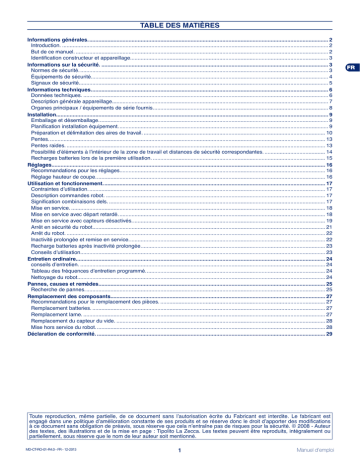table des matières Informations générales.�������������������������������������������������������������������������������������������������������������������������������������������������������������� 2 Introduction.�������������������������������������������������������������������������������������������������������������������������������������������������������������������������������� 2 But de ce manuel.����������������������������������������������������������������������������������������������������������������������������������������������������������������������� 2 Identification constructeur et appareillage.��������������������������������������������������������������������������������������������������������������������������������� 3 Informations sur la sécurité.������������������������������������������������������������������������������������������������������������������������������������������������������ 3 Normes de sécurité.�������������������������������������������������������������������������������������������������������������������������������������������������������������������� 3 Équipements de sécurité.����������������������������������������������������������������������������������������������������������������������������������������������������������� 4 Signaux de sécurité.������������������������������������������������������������������������������������������������������������������������������������������������������������������� 5 Informations techniques.������������������������������������������������������������������������������������������������������������������������������������������������������������ 6 Données techniques.������������������������������������������������������������������������������������������������������������������������������������������������������������������ 6 Description générale appareillage.��������������������������������������������������������������������������������������������������������������������������������������������� 7 Organes principaux / équipements de série fournis.������������������������������������������������������������������������������������������������������������������� 8 Installation.������������������������������