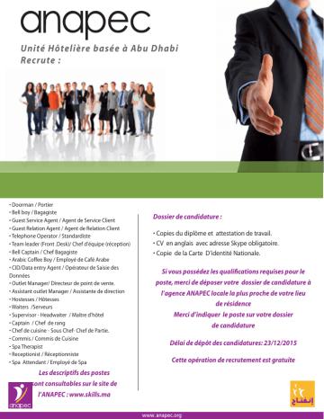 Unité Hôtelière basée à Abu Dhabi Recrute : • Doorman / Portier • Bell boy / Bagagiste • Guest Service Agent / Agent de Service Client • Guest Relation Agent / Agent de Relation Client • Telephone Operator / Standardiste • Team leader (Front .Desk)/ Chef d'équipe (réception) • Bell Captain / Chef Bagagiste • Arabic Coffee Boy / Employé de Café Arabe • CID/Data entry Agent / Opérateur de Saisie des Données • Outlet Manager/ Directeur de point de vente. • Assistant outlet Manager / Assistante de direction • Hostesses / Hôtesses • Waiters /Serveurs • Supervisor - Headwaiter / Maître d'hôtel • Captain / Chef de rang • Chef de cuisine - Sous Chef- Chef de Partie. • Commis / Commis de Cuisine • Spa Therapist • Receptionist / Réceptionniste • Spa Attendant / Employé de Spa Les descriptifs des postes sont consultables sur le site de l’ANAPEC : www.skills.ma Dossier de candidature : • Copies du diplôme et attestation de travail. • CV en anglais avec adresse Skype obligatoire. • Copie de la Carte D’identité Nationale. Si vous possédez les qualifications requises pour le poste, merci de déposer votre dossier de candidature à l’agence ANAPEC locale la plus proche de votre lieu de résidence Merci d’indiquer le poste sur votre dossier de candidature Délai de dépôt des candidatures: 23/12/2015 Cette opération de recrutement est gratuite UNITE HOTELIERE BASEE A ABU DHABI RECRUTE Department Position Sexe Nbre Doorman / Portier M/F 8 Bell boy / Bagagiste M 8 Guest Service Agent / Agent de Service Client F 10 Guest Relation Agent / Agent de Relation Client F 4 Telephone Operator / Standardiste F 5 Team leader (Front .Desk)/ Chef d'équipe F 3 Bell Captain / Chef bagagiste M 3 Arabic Coffee Boy / Employé de Café Arabe M/F 3 CID/Data entry Agent / Opérateur de Saisie des Données M/F 2 Outlet Manager/ Directeur de point de vente. M 1 Assistant outlet Manager / Assistante de direction F 1 Hostesses / Hôtesses F 2 Bartender M 2 Waiters - ress / Serveurs - Serveuses M/F 20 Supervisor - Headwaiter / Maître d'hôtel M/F 1 Captain / Chef de rang M/F 1 Chef De cuisine F 1 Sous Chef Chef de Partie DCDP M/F M/F M/F 1 2 2 Front Office Food & Beverage Kitchen Spa Commis / Commis de Cuisine M/F 4 Spa Therapist F 1 Receptionist / Réceptionniste F 1 Spa Attendant / Employé de Spa M 1 Profil Avoir une expérience d'une année au minimum dans le même poste dans un hôtel classé 4/5* ou restaurant Bonne élocution en anglais Diplôme en hôtellerie ou équivalent avec une expérience d'une année au minimum dans le même poste dans un hôtel classé 4/5* ou restaurant Bonne élocution en anglais Bac + Expérience d'expérience d'une année au minimum dans le même poste. Bonne élocution en anglais Diplôme en hôtellerie ou équivalent avec une expérience de 2 ans au minimum dans le même poste dans un hôtel classé 4/5* ou restaurant Bonne élocution en anglais Diplôme en hôtellerie/ restauration avec une expérience d'une année au minimum dans le mêmeune poste dans un hôtel ou Avoir expérience d'uneclassé année4/5* au minimum dans le même poste dans un hôtel classé 4/5* ou restaurant Avoir une expérience d'une année au minimum dans le même poste dans un hôtel classé 4/5* ou restaurant Bonne élocution en anglais Bac + 3 et plus avec une expérience de 3 ans au minimum dans le même poste dans un hôtel 5* ou restaurant Bonne élocution en anglais Bac + 2 et plus avec une expérience de 3 ans au minimum dans le même poste dans un hôtel 4-5* ou restaurant Bonne élocution en anglais Avoir une expérience d'une année au minimum dans le même poste dans un hôtel classé 4/5* ou restaurant Bonne élocution en anglais Diplôme en hôtellerie ou équivalent avec une expérience d'une année au minimum dans le même poste dans un hôtel classé 4/5* ou restaurant Bonne élocution en anglais Avoir une expérience d'une année au minimum dans le même poste dans un hôtel classé 4/5* ou restaurant Bonne élocution en anglais Diplôme en hôtellerie / restauration avec une expérience de 2 ans au minimum dans le même poste dans un hôtel classé 4/5* ou restaurant Bonne élocution en anglais Diplôme en hôtellerie ou équivalent avec une expérience de 2 années au minimum dans le même poste dans un hôtel classé 4/5* ou Diplôme en hôtellerie et restauration avec une expérience de 3 ans au minimum dans le même poste dans un hôtel 4-5* ou restaurant Bonne élocution en anglais Diplôme en hôtellerie avec une expérience d'une année au minimum dans le même poste dans un hôtel classé 4/5* ou restaurant Bonne élocution en anglais Diplôme avec une expérience de 2 ans au minimum dans le même poste dans un hôtel classé 4/5* Bonne élocution en anglais Diplôme en hôtellerie avec une expérience d'une année au minimum dans le même poste dans un hôtel classé 4/5* ou restaurant Bonne élocution en anglais Avoir une expérience d'une année au minimum dans le même poste dans un hôtel classé 4/5* Bonne élocution en anglais Salaire de base en AED Logement Type de Contrat 1 300,00 Partagé / 3 CDI Tous les 2 ans 1 050,00 Partagé / 3 CDI Tous les 2 ans 1 800,00 Partagé / 2 CDI Tous les 2 ans 2 500,00 Individuel CDI Annuellement 1 400,00 Partagé / 3 CDI Tous les 2 ans 2 500,00 Individuel CDI Tous les 2 ans 1 650,00 Partagé / 2 CDI Tous les 2 ans 1 600,00 Partagé / 3 CDI Tous les 2 ans 1 800,00 Partagé / 2 CDI Tous les 2 ans 10 000,00 Studio CDI Employé + Conjoint / Annuellement 6 000,00 Individuel CDI Annuellement 1 500,00 Partagé / 2 CDI Tous les 2 ans 1 500,00 Partagé / 2 CDI Tous les 2 ans 1 300,00 Partagé / 3 CDI Tous les 2 ans 3 500,00 Individuel CDI Tous les 2 ans 1 800,00 Partagé / 2 CDI Tous les 2 ans 13 000,00 1BRM CDI Employé + Conjoint+ 2 enfants / Annuellement 8 000,00 3 100,00 2 200,00 Individuel Individuel Partagé / 2 CDI CDI CDI Annuellement Tous les 2 ans Tous les 2 ans Partagé / 