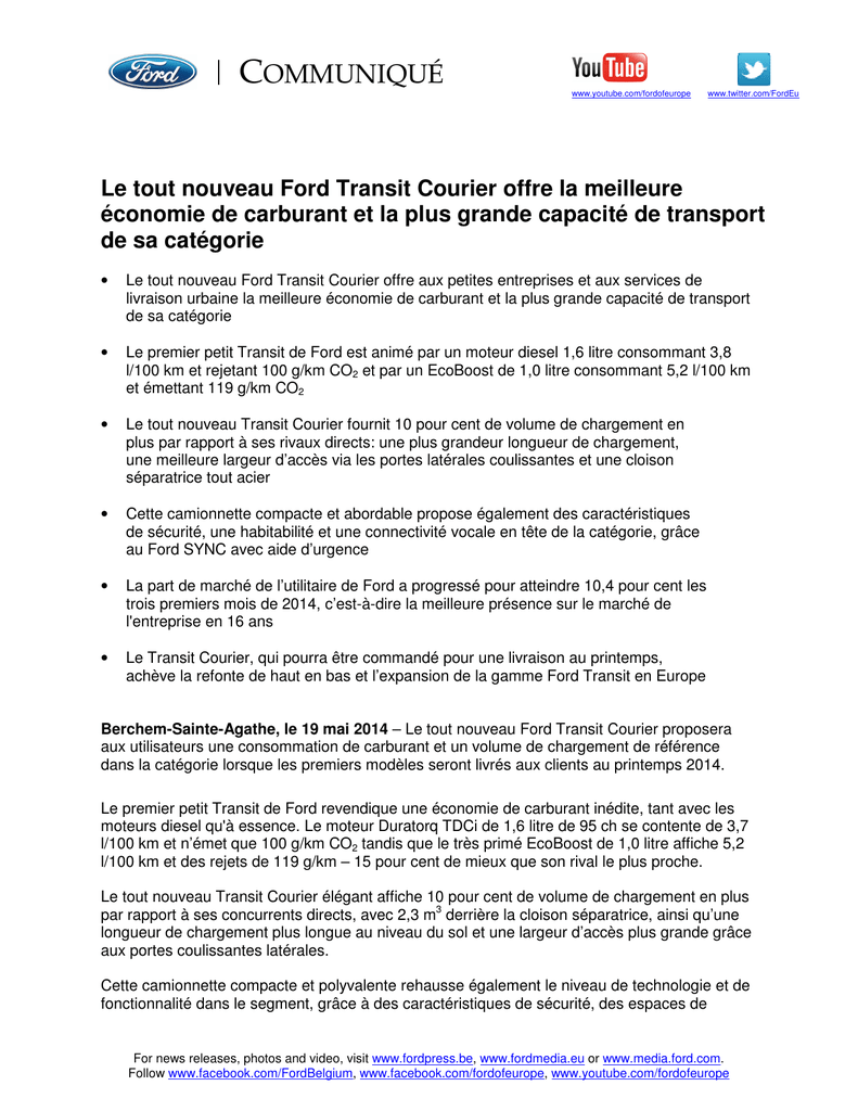 COMMUNIQUÉ www.youtube.com/fordofeurope www.twitter.com/FordEu Le tout nouveau Ford Transit Courier offre la meilleure économie de carburant et la plus grande capacité de transport de sa catégorie • Le tout nouveau Ford Transit Courier offre aux petites entreprises et aux services de livraison urbaine la meilleure économie de carburant et la plus grande capacité de transport de sa catégorie • Le premier petit Transit de Ford est animé par un moteur diesel 1,6 litre consommant 3,8 l/100 km et rejetant 100 g/km CO2 et par un EcoBoost de 1,0 litre consommant 5,2 l/100 km et émettant 119 g/km CO2 • Le tout nouveau Transit Courier fournit 10 pour cent de volume de chargement en plus par rapport à ses rivaux directs: une plus grandeur longueur de chargement, une meilleure largeur d’accès via les portes latérales coulissantes et une cloison séparatrice tout acier • Cette camionnette compacte et abordable propose également des caractéristiques de sécurité, une habitabilité et une connectivité vocale en tête de la catégorie, grâce au Ford SYNC avec aide d’urgence • La part de marché de l’utilitaire de Ford a progressé pour atteindre 10,4 pour cent les trois premiers mois de 2014, c’est-à-dire la meilleure présence sur le marché de l'entreprise en 16 ans • Le Transit Courier, qui pourra être commandé pour une livraison au printemps, achève la refonte de haut en bas et l’expansion de la gamme Ford Transit en Europe Berchem-Sainte-Agathe, le 19 mai 2014 – Le tout nouveau Ford Transit Courier proposera aux utilisateurs une consommation de carburant et un volume de chargement de référence dans la catégorie lorsque les premiers modèles seront livrés aux clients au printemps 2014. Le premier petit Transit de Ford revendique une économie de carburant inédite, tant avec les moteurs diesel qu'à essence. Le moteur Duratorq TDCi de 1,6 litre de 95 ch se contente de 3,7 l/100 km et n’émet que 100 g/km CO2 tandis que le très primé EcoBoost de 1,0 litre affiche 5,2 l/100 km et des rejets de 119 g/km – 15 pour cent de mieux que son rival le plus proche. Le tout nouveau Transit Courier élégant affiche 10 pour cent de volume de chargement en plus par rapport à ses concurrents directs, avec 2,3 m3 derrière la cloison séparatrice, ainsi qu’une longueur de chargement plus longue au niveau du sol et une largeur d’accès plus grande grâce aux portes coulissantes latérales. Cette camionnette compacte et polyvalente rehausse également le niveau de technologie et de fonctionnalité dans le segment, grâce à des caractéristiques de sécurité, des espaces de For news releases, photos and video, visit www.fordpress.be, www.fordmedia.eu or www.media.ford.com. Follow www.facebook.com/FordBelgium, www.facebook.com/fordofeurope, www.youtube.com/fordofeurope rangement dans la cabine et une connectivité qui inclut le FORD SYNC avec aide d’urgence, inédits dans la catégorie. Destiné au marché des livraisons urbaines et aux petites entreprises nécessitant une camionnette fonctionnelle et compacte, le tout nouveau Transit Courier générera de nouvelles ventes pour le Ford dans le segment des petits utilitaires à croissance rapide en Europe. Il vient s’ajouter à la dynamique amorcée par les plus grands produits de la gamme Ford Transit complètement redessinée et étendue. Suite à l’introduction des tout nouveaux modèles Transit, Transit Custom et Transit Connect entamée fin 2012, la part de marché de Ford dans les ventes de véhicules utilitaires est passée à 10,4 pour cent les trois premiers mois de 2014, ce qui représente le résultat le plus élevé de l’entreprise en 16 ans. Depuis le début de l’année, Ford a vendu quelque 50.000 utilitaires, ce qui représente une augmentation de 10 pour cent par rapport à la même période l’an dernier. “Le tout nouveau Transit Courier est une camionnette abordable, robuste qui offre une sobriété sans égale et un plus gros volume de chargement que ses concurrents les plus proches,” affirme Paulo Giantaglia, ingénieur en chef du programme de développement du Transit Courier, Ford Europe. “C’est le véhicule parfait pour les rues urbaines fréquentées qui mettra la capacité du Transit à la portée d'un tout nouveau groupe de clients.” Rendement, coût d’utilisation et longévité en tête de la catégorie Les moteurs diesel et à essence haut rendement du tout nouveau Transit Courier contribuent à son coût d’utilisation remarquable dans la catégorie. Outre les moteurs diesel 1,6 litre et à essence 1,0 litre EcoBoost, les clients peuvent opter pour le diesel 1,5 litre de 75 ch qui supplante également tous ses rivaux avec ses 103 g/km CO2 et ses 3,9 l/100 km. Le système start/stop automatique économisant davantage le carburant est disponible en option dans toute la gamme. Les intervalles d’entretien étendus de tous les moteurs sont fixés à un an/30.000 km et le véhicule a été optimisé pour simplifier les interventions et les réparations. Un pare-chocs arrière en plusieurs pièces, une protection latérale de carrosserie robuste et des feux avant et arrière surélevés concourent à réduire les coûts en cas d’accident et à abaisser les primes d’assurance. Le système exclusif Ford Easy Fuel monté de série évite de faire des erreurs de remplissage qui peuvent être préjudiciables. Le tout nouveau Transit Courier a été conçu pour offrir une fiabilité exceptionnelle et les prototypes ont été testés sur 1,6 million de km ou deux aller-retour vers la lune. Le test de longévité consistait à simuler des années d’usage intensif et inclut plus de 400.000 km dans des conditions d’utilisation typiques des clients sur les routes publiques. Les portes ont été fermées 250.000 fois dans le cadre d’essais d’endurance ininterrompus afin de garantir leur fiabilité. Meilleures capacité de chargement et praticité de la catégori