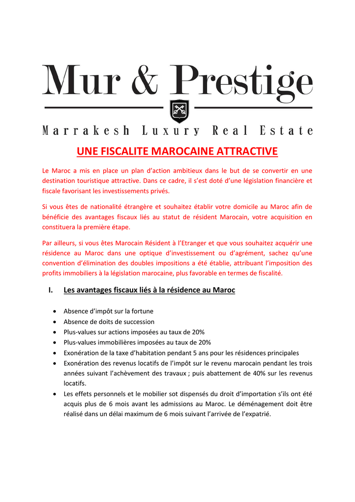 UNE FISCALITE MAROCAINE ATTRACTIVE Le Maroc a mis en place un plan d’action ambitieux dans le but de se convertir en une destination touristique attractive. Dans ce cadre, il s’est doté d’une législation financière et fiscale favorisant les investissements privés. Si vous êtes de nationalité étrangère et souhaitez établir votre domicile au Maroc afin de bénéficie des avantages fiscaux liés au statut de résident Marocain, votre acquisition en constituera la première étape. Par ailleurs, si vous êtes Marocain Résident à l’Etranger et que vous souhaitez acquérir une résidence au Maroc dans une optique d’investissement ou d’agrément, sachez qu’une convention d’élimination des doubles impositions a été établie, attribuant l’imposition des profits immobiliers à la législation marocaine, plus favorable en termes de fiscalité. I. Les avantages fiscaux liés à la résidence au Maroc Absence d’impôt sur la fortune Absence de doits de succession Plus-values sur actions imposées au taux de 20% Plus-values immobilières imposées au taux de 20% Exonération de la taxe d’habitation pendant 5 ans pour les résidences principales Exonération des revenus locatifs de l’impôt sur le revenu marocain pendant les trois années suivant l’achèvement des travaux ; puis abattement de 40% sur les revenus locatifs. Les effets personnels et le mobilier sot dispensés du droit d’importation s’ils ont été acquis plus de 6 mois avant les admissions au Maroc. Le déménagement doit être réalisé dans un délai maximum de 6 mois suivant l’arrivée de l’expatrié. Si vous êtes un Français résident au Maroc Vous bénéficiez d’une fiscalité avantageuse des actifs financiers laissés en France (aucune fiscalité sur un portefeuille de valeurs mobilière laissé en France) Vous êtes exonéré de CSG, CRDS (contribution sociale) sur les revenus de source française. Vous n’êtes plus assujetti à l’impôt sur la fortune (ISF), hormis sur les biens immobiliers français. En matière de succession, les valeurs mobilières marocaines qui dépendent de la succession d’un Français domicilié au Maroc sont exonérés en France des droits de succession. Si vous êtes résident, vous serez exempté de l’impôt sur le revenu pour les revenus de la location, durant les trois années suivant l’achèvement de la construction Exonération de la plus-value immobilière sur la résidence principale occupée depuis plus de 8 ans au jour de la cession par son propriétaire. L’imposition des français retraités résidents au Maroc peut être extrêmement faible. Si vous êtes un Français résident au Maroc Vous bénéficiez d’un abattement de 40% de la base imposable Vous bénéficiez d’une réduction d’impôt de 80% calculée sur le montant de la pension que vous transférez au Maroc sur un compte en dirhams convertibles Si vous êtes Marocain résident à l’étranger Vous bénéficier à la fois des avantages accordés aux personnes physiques marocaines résidentes et de ceux dont bénéficient les étrangers au Maroc. 1. En tant que Marocain, vous jouissez de tous les avantages accordés à vos concitoyens : L’accès à des crédits en dirhams accordés par des entités résidentes ; La liberté d’investir et d’acquérir tout actif au Maroc Le bénéfice des dotations en devises pour couvrir vos dépenses à l’étranger au titre des voyages touristiques et religieux, des frais de scolarité, des soins médicaux. 2. Au même titre que les étrangers non-résidents, vous bénéficiez dans le cadre de la réglementation des changes d’un régime libéral qui vous garantit l’entière liberté de la réalisation de vos opérations en devises. Ce régime couvre pratiquement tous les domaines : L’importation et l’exportation de devises ; Louverture de comptes en dirhams convertibles ou de comptes en devises La garantie de transfert au titre des investissements en devises que vous réalisez au Maroc L’acquisition de biens immeubles situés au Maroc et appartenant à des étrangers et le règlement en devises de la valeur correspondante à l’étranger. 3. Le logement est fiscalement assimilé à la résidence principale s’il est occupé par des parents ou des bénéficiaires indirects (ayants droits) Exonération de la taxe d’habitation pendant les cinq premières années Exonération de l’impôt sur le revenu relatif aux profits fonciers si au bout de huit ans, vous décidez de vendre votre logement affecté à l’habitation principale des conjoints, parents et bénéficiaires indirects. II. L’établissement de la résidence fiscale Saviez-vous qu’une personne physique peut résider fiscalement au Maroc sans pour autant y posséder la majorité de ses actifs ? En effet, le centre des intérêts économiques ne figure pas parmi les critères conventionnels définissant la résidence fiscale. Ainsi, l’établissement de la résidence fiscale au Maroc est principalement lié au départ physique de France et à l’installation effective de son foyer familial au Maroc pour y vivre. L’établissement de la résidence fiscale au Maroc est facilité dans la mesure où, contrairement à la convention modèle OCDE, la convention fiscale franco-marocaine exclut tout référence préalable aux critères des législations étatiques , pour se référer uniquement et directement aux critères stipulés dans la convention. RESIDENTS AU MAROC A noter que les contribuables ayant au Maroc leur résidence habituelles et titulaires de pensions de retraite de source étrangère bénéficient d’une réduction égale à 80% du montant de l’impôt dû au titre de leur pension et correspondant aux sommes transférées au Maroc à titre définitif, en dirhams non convertibles. (Article 76 du Code de l’IGR année 2010) III. La réglementation des changes Les sommes provenant de l’étranger doivent passer par un compte en dirhams conve