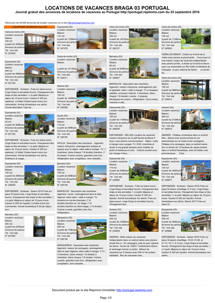 LOCATIONS DE VACANCES BRAGA 03 PORTUGAL Journal gratuit des annonces de locations de vacances au Portugal http://portugal.repimmo.com du 25 septembre 2016 Retrouvez nos 40.000 annonces de location vacances sur le site http://portugal.repimmo.com LOCATIONS VACANCES VILLA 03 Vieira-do-minho (03) Location vacances Maison 100 m2 à partir de 350€/sem Annonce de particulier Tel : Voir site N° 253436 Esposende (03) Location vacances Maison 340 m2 à partir de 406€/sem Annonce de particulier Tel : Voir site N° 251164 Esposende (03) Location vacances Maison 112 m2 à partir de 1790€/sem Annonce de particulier Tel : Voir site N° 247478 Vieira-do-minho (03) Location vacances Maison 250 m2 à partir de 1421€/sem Annonce de particulier Tel : Voir site N° 246137 Vieira-do-minho (03) Location vacances Maison Barcelos (03) Location vacances Maison 80 m2 à partir de 629€/sem Annonce de particulier Tel : Voir site N° 246057 à partir de 1211€/sem Annonce de particulier Tel : Voir site N° 246311 ESPOSENDE : Surtaxes : Frais sur place aucun. Linge Draps et serviettes fournis. Changement des draps et des serviettes 1 x à partir d'un séjour de 10 jours inclus. Caution E 200 (en espèces). Lit bébé/ Chaise haute inclus (sur commande). Animal domestique non admis. Courte description Type de... Esposende (03) Location vacances Maison 45 m2 à partir de 308€/sem Annonce de particulier Tel : Voir site N° 251162 BARCELOS : Description des chambres: logement. maison mitoyenne, aménagement clair et agréable. salon / salle à manger. TV à réception satellite, connexion Internet. 2 chambres, (dans chaque 1 lit double). cuisine , 2 plaques électriques de cuisson , réfrigérateur, micro-ondes, machine à café.... Ribeira (03) Location vacances Maison 150 m2 à partir de 1456€/sem Annonce de particulier Tel : Voir site N° 246289 Apulia (03) Location vacances Maison 110 m2 à partir de 499€/sem Annonce de particulier Tel : Voir site N° 246150 ESPOSENDE : Surtaxes : Frais sur place aucun. Linge Draps et serviettes fournis. Changement des draps et des serviettes 1 x à partir d'un séjour de 10 jours inclus. Caution E 200 (en espèces). Lit bébé/ Chaise haute inclus (sur commande). Animal domestique non admis. Extérieurs (à usage... APULIA : Description des chambres: logement. maison mitoyenne, aménagement rustique et typique pour la région. salon.salle à manger. TV. 3 chambres, (dans chaque 1 lit double).chambre, (1 lit simple). Cuisine ouverte, gazinière avec four, réfrigérateur avec congélateur, lave-vaisselle,... Esposende (03) Location vacances Maison 140 m2 à partir de 350€/sem Annonce de particulier Tel : Voir site N° 249528 Barcelos (03) Location vacances Maison 120 m2 à partir de 639€/sem Annonce de particulier Tel : Voir site N° 246149 ESPOSENDE : Surtaxes : Saison 2016 Frais sur place Si besoin bois. Linge Draps et serviettes fournis. Changement des draps et des serviettes 1 x à partir d'un séjour de 10 jours inclus. Caution E 200 (en liquide). Lit bébé inclus (sur commande). Animal domestique E 25 par séjour (sur... BARCELOS : Description des chambres: logement. moulin, aménagement dans le style régional. salon.salon / salle à manger. TV. chambre au rez-de-chaussée, (1 lit double).chambre au 1er étage, (1 lit double).chambre au 2ème étage, (1 lit double). Cuisine ouverte, gazinière avec four, réfrigérateur... Barcelos (03) Location vacances Maison 300 m2 à partir de 437€/sem Annonce de particulier Tel : Voir site N° 247493 Barqueiros (03) Location vacances Maison 200 m2 à partir de 719€/sem Annonce de particulier Tel : Voir site N° 246148 BARQUEIROS : Description des chambres: logement. maison de campagne, aménagement dans le style régional. salon.salle à manger. 2 TV. 3 chambres, (dans chaque 1 lit double).3 chambres, (dans chaque 1 lit simple). Cuisine ouverte, gazinière avec four, réfrigérateur avec congélateur, lave-vaisselle,... Vieira-do-minho (03) Location vacances Maison 130 m2 à partir de 1120€/sem Annonce de particulier Tel : Voir site N° 245924 VIEIRA-DO-MINHO : Chalet sur le bord de la rivière avec piscine et grand jardin Vous louez ici une maison unique de vacances indépendante avec piscine privée , à droite sur le bord du fleuve avec vue imprenable sur Rio Caldo et Albufeira da Caniçada , le parc national de Geres . Le terrain de... Vieira-do-minho (03) Location vacances Maison 100 m2 à partir de 990€/sem Annonce de particulier Tel : Voir site N° 245914 Esposende (03) Location vacances Maison 160 m2 à partir de 1190€/sem Annonce de particulier Tel : Voir site N° 246038 Amares (03) Location vacances Maison 260 m2 à partir de 2100€/sem Annonce de particulier Tel : Voir site N° 245910 ESPOSENDE : DELUXE Location de vacances maison mitoyenne sur le golf Quinta da Barca 9 trous, avec piscine communautaire. Séjour / salle à manger avec canapé, TV, DVD, cheminée et accès à une grande terrasse avec mobilier de jardin et barbecue en bois. Cuisine ouverte avec bar manger 4 feux,... AMARES : Château romantique dans un endroit libre - debout avec piscine privée et vue panoramique sur la rivière et les montagnes Château à la campagne, dans un endroit calme. Sur un terrain de 15 hectares de vignes situées dans un endroit fantastique, avec de belles vues panoramiques . C'est... Esposende (03) Location vacances Maison 110 m2 à partir de 392€/sem Annonce de particulier Tel : Voir site N° 245983 Esposende (03) Location vacances Maison 130 m2 à partir de 342€/sem Annonce de particulier Tel : Voir site N° 245877 ESPOSENDE : Surtaxes : Frais sur place aucun. Linge Draps et serviettes fournis. Changement des draps et des serviettes 1 x à partir d'un séjour de 10 jours inclus. Caution E 200 (en liquide). Animal domestique non admis. Frais sur place aucun. Linge Draps et serviettes fournis. Changement des... ESPOSENDE : Surtaxes : Saison 2016 Frais sur place Si besoin chauffage, E 3/ jour. Lin