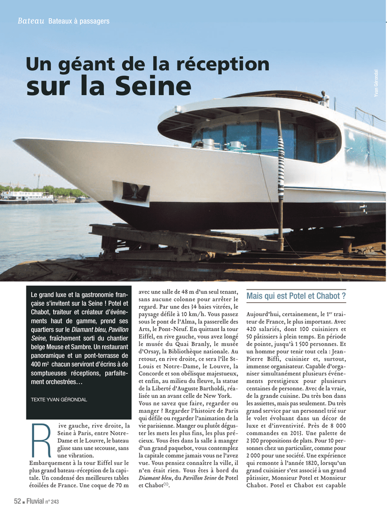 Bateaux à passagers Un géant de la réception sur la Seine Le grand luxe et la gastronomie française s’invitent sur la Seine ! Potel et Chabot, traiteur et créateur d’événements haut de gamme, prend ses quartiers sur le Diamant bleu, Pavillon Seine, fraîchement sorti du chantier belge Meuse et Sambre. Un restaurant panoramique et un pont-terrasse de 400 m2 chacun serviront d’écrins à de somptueuses réceptions, parfaitement orchestrées… TEXTE YVAN GÉRONDAL ive gauche, rive droite, la Seine à Paris, entre NotreDame et le Louvre, le bateau glisse sans une secousse, sans une vibration. Embarquement à la tour Eiffel sur le plus grand bateau-réception de la capitale. Un condensé des meilleures tables étoilées de France. Une coque de 70 m R 52 n Fluvial n° 243 avec une salle de 48 m d’un seul tenant, sans aucune colonne pour arrêter le regard. Par une des 34 baies vitrées, le paysage défile à 10 km/h. Vous passez sous le pont de l’Alma, la passerelle des Arts, le Pont-Neuf. En quittant la tour Eiffel, en rive gauche, vous avez longé le musée du Quai Branly, le musée d’Orsay, la Bibliothèque nationale. Au retour, en rive droite, ce sera l’île StLouis et Notre-Dame, le Louvre, la Concorde et son obélisque majestueux, et enfin, au milieu du fleuve, la statue de la Liberté d’Auguste Bartholdi, réalisée un an avant celle de New York. Vous ne savez que faire, regarder ou manger ? Regarder l’histoire de Paris qui défile ou regarder l’animation de la vie parisienne. Manger ou plutôt déguster les mets les plus fins, les plus précieux. Vous êtes dans la salle à manger d’un grand paquebot, vous contemplez la capitale comme jamais vous ne l’avez vue. Vous pensiez connaître la ville, il n’en était rien. Vous êtes à bord du Diamant bleu, du Pavillon Seine de Potel et Chabot(1). Mais qui est Potel et Chabot ? Aujourd’hui, certainement, le 1er traiteur de France, le plus important. Avec 420 salariés, dont 100 cuisiniers et 50 pâtissiers à plein temps. En période de pointe, jusqu’à 1 500 personnes. Et un homme pour tenir tout cela : JeanPierre Biffi, cuisinier et, surtout, immense organisateur. Capable d’organiser simultanément plusieurs événements prestigieux pour plusieurs centaines de personne. Avec de la vraie, de la grande cuisine. Du très bon dans les assiettes, mais pas seulement. Du très grand service par un personnel trié sur le volet évoluant dans un décor de luxe et d’inventivité. Près de 8 000 commandes en 2013. Une palette de 2 300 propositions de plats. Pour 10 personnes chez un particulier, comme pour 2 000 pour une société. Une expérience qui remonte à l’année 1820, lorsqu’un grand cuisinier s’est associé à un grand pâtissier, Monsieur Potel et Monsieur Chabot. Potel et Chabot est capable Yvan Gérondal Bateau d’organiser les plus grands événements gastronomiques partout dans le monde. Il gère à Paris les adresses les plus prestigieuses. Pavillons d’Armenonville, Cambon Capucines, Gabriel, Kléber et l’hôtel d’Évreux offrent des dizaines de salons pour les réceptions les plus huppées. Bateaux à passagers Meusam Bateau Une rencontre décisive Meusam Le 1er élément est prêt à Beez. L’élément central quitte le grand hangar. Yvan Gérondal Ces splendides demeures auraient pu suffire à la renommée de cette ancienne maison. Mais l’immobilisme n’est pas le gage de la pérennité. Une idée trottait dans la tête de J.-P. Biffi : un établissement de grand luxe sur la Seine. Une immense salle de réception flottante et navigante. Mais gérer un grand bateau n’est pas la même chose que gérer des immeubles prestigieux. Chez Potel et Chabot, les plus grandes fêtes à terre, c’était presque de la routine. Mais exécuter cela sur un bateau, c’était autre chose. L’idée était bien dans l’air, mais le passage à l’acte sans cesse retardé. Les projets les plus utopiques voient souvent le jour par la grâce de la rencontre de 2 hommes. J.-P. Biffi rencontra Alain Daïen presque par hasard. Les 2 hommes ne se connaissaient pas, mais le courant passa immédiatement. A. Daïen, armateur fluvial depuis 20 ans, venait de mettre en chantier un nouveau bateau, le Diamant bleu, une unité de 70 m, qu’il destinait aux croisières gastronomiques sur la Seine à Paris. A. Daïen n’était pas un novice, il exploita successivement Le coche d’eau, Le rive droite, Le grand bleu, Le capitaine Fracasse, le Paris en scène et Les calanques. Bateaux maintenant revendus, mais toujours en activité sous d’autres pavillons. Il comptait bien exploiter lui-même son Diamant bleu. J.-P. Biffi se montra convaincant en proposant une formule qui devait satisfaire les 2 futurs partenaires. A. Daïen resterait propriétaire du bateau et s’occuperait des problèmes de maintenance et de navigation. Potel et Chabot deviendrait le locataire exclusif et l’unique gestionnaire des fêtes et réceptions. Seul changement : le nom Diamant bleu serait accolé au nom de Pavillon Seine, pour assurer le lien avec les autres établissements parisiens. La décision de construire le nouveau bateau fut prise en mai 2013. Le travail Le beau parquet de la salle de réception est posé. Fluvial n° 243 n 53 Bateau Bateaux à passagers Yvan Gérondal Pendant ce temps, à Paris… Le futur lieu de réception de Potel et Chabot prend forme. fut confié au chantier naval Meuse et Sambre(2), à Beez en Belgique. Chantier auréolé de sa bonne réputation auprès de l’armateur alsacien CroisiEurope. Le bateau serait construit sur 2 sites pour gagner du temps. La partie médiane à Beez, près de Namur, la proue, la poupe, la motorisation sur le site de l’île Monsin, à Liège. Ce sera l’architecte du chantier, Alexandre Gérard, qui établira les plans. La construction Yvan Gérondal Les travaux vont commencer dès les 1res tôles livrées. Et le 6 septembre 2013, la partie médiane est sortie d