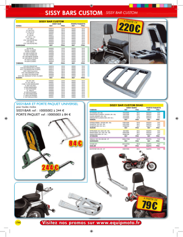 SISSY BARS CUSTOM SISSY BAR CUSTOM SISSY BAR HONDA REF: PRIX: VT 125 VT 750 C 97VT 750 C2 97VT 750 C4 VT 750 DC VT 1100 C / C2 VTX 1300 C VTX 1300 RS RETRO VTX 1800 C VTX 1300 RS RETRO HA6010 HA6022 HA6022 HA6021 HA6011 HA6008 HA6024 HA6023 HA6023 HA6024 229 € 220 € 220 € 269 € 235 € 220 € 235 € 265 € 265 € 235 € REF: EN 500 96VN 800 / CLASSIC VN 900 CLASSIC VN 1500 CLASSIC 96VN 1500 TOURER 96VN 1500 MEAN STREAK VN 1600 MEAN STREAK VN 1600 CLASSIC VN 2000 CLASSIC HA6002 HA6007 HA6020 HA6006 HA6006 HA6001 HA6001 HA6019 HA6020 REF: XVS 650 DRAGSTAR XVS 650 DRAGSTAR CLASSIC XVS 1100 DRAGSTAR CLASSIC 1200 V-MAX Aluminium XVS 1300 MIDNIGHT STAR XV 1600/1700 WILDSTAR XVS 1900 MIDNIGHT STAR / R-LINER HA6016 HA6015 HA6012 HA6017 HA6030 HA6026 HA6029 REF: GZ 125 / 250 VL 125 / 250 LC C 800 / M 800 MARAUDER VL 800 VOLUSIA VZ 800 MARAUDER C 1500 INTRUDER VL 1500 LC M 1600 INTRUDER VZ 1600 MARAUDER C 1800 R INTRUDER C 109 R BOULEVARD HA6027 HA6027 HA6005 HA6005 HA6025 HA6004 HA6004 HA6028 HA6028 HA6031 HA6031 KAWASAKI YAMAHA SUZUKI SISSY BAR CUSTOM 220 € A PARTIR DE PORTE PAQUETS REF: PRIX: H8002 H8002 H8002 H8002 H8002 H8002 H8002 H8002 H8002 H8002 155 € 155 € 155 € 155 € 155 € 155 € 155 € 155 € 155 € 155 € PRIX: REF: PRIX: 239 € 235 € 275 € 229 € 229 € 229 € 229 € 249 € 275 € H8002 H8002 H8002 H8002 H8002 H8002 H8002 H8002 H8002 155 € 155 € 155 € 155 € 155 € 155 € 155 € 155 € 155 € PRIX: REF: PRIX: 235 € 235 € 245 € 285 € 269 € 255 € 269 € H8002 H8002 H8002 H8002 H8002 H8002 H8002 155 € 155 € 155 € 155 € 155 € 155 € 155 € PRIX: REF: PRIX: 239 € 239 € 249 € 249 € 245 € 245 € 245 € 235 € 235 € 269 € 269 € H8002 H8002 H8002 H8002 H8002 H8002 H8002 H8002 H8002 H8002 H8002 155 € 155 € 155 € 155 € 155 € 155 € 155 € 155 € 155 € 155 € 155 € SISSY-BAR ET PORTE PAQUET UNIVERSEL SISSY BAR CUSTOM SHAD pour toutes motos SISSY-BAR ref : 10005002 à 244 € PORTE PAQUET ref : 10005003 à 84 € YAMAHA REF PRIX Y0V25SN Y0D19SN Y0V55SN Y0D69SN REF 90 € 82 € 79 € 100 € PRIX NADTN NADTN NADTN NADTN REF 76 € 76 € 76 € 76 € PRIX HONDA REBEL 125/250 (96 - 08) SHADOW 125 ( 99 - 08) SHADOW 600 ( 95 / 04 ) H0R16SN H0S19SN H0S65SN REF 100 € 90 € 90 € PRIX NADTN NADTN NADTN REF 76 € 76 € 76 € PRIX INTRUDER 125 / 250 ( 99 - 08) MARAUDER 125 / 250 ( 98 - 08) MARAUDER 800 ( 97 / 04 ) S0I19SN S0M18SN S0M87SN REF 90 € 90 € 90 € PRIX NADTN NADTN NADTN REF 76 € 76 € 76 € PRIX AQUILA 125 / GV 250 (06 - 07 H0QL17SN REF 140 € PRIX NADTN REF 76 € PRIX VN 900 (07 DAELIM K0VL97SN REF 185 € PRIX NADTN NADTN 76 € PRIX DAYSTAR 125 ( 00 - 07 D0D10SN 90 € NADTN 76 € SUZUKI HYOSUNG KAWASAKI PRIX PORTE PAQUETS XV125/250 ( 94- 08) DRAGSTAR CLASSIC 125/250 ( 99 - 08) XV535 VIRAGO ( 95 - 04) DRAGSTAR CLASSIC 650 ( 99 / 03 ) HONDA 84 € SISSY BARS REF 244 € A PARTIR DE 79 € 194 Visitez nos promos sur www.equipmoto.fr