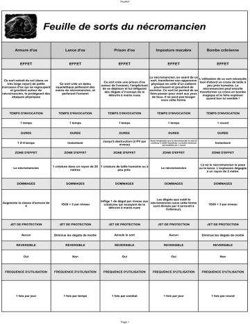 Feuille1 Feuille de sorts du nécromancien Armure d'os Lance d'os Prison d'os Imposture macabre Bombe crânienne EFFET EFFET EFFET EFFET EFFET Le nécromancien, en usant de ce L'utilisation de ce sort nécessite sort, transforme son apparence Ce sort crée une prison d'os tout d'abord un crane de taille à physique en celle d'un cadavre autour de l'ennemi, l'empêchant peu près humaine. Le pourrissant et grouillant de de se déplacer et lui infligeant nécromancien peut ensuite vermine. Ce sort lui permet de se des dégats s'il essaye de la transformer ce crane en bombe faire passer pour mort aux yeux détruire à mains nues magique et le faire exploser de tous. Il ne peut pas bouger quand bon lui semble ! sous cette forme. Ce sort extrait du sol (dans un très large rayon) de petits morceaux d'os qui se regroupent et gravitent autour du nécromancien, le protégeant des attaques physiques Ce sort crée un épieu squelettique jaillissant des mains du nécromancien, et perforant l'ennemi TEMPS D'INVOCATION TEMPS D'INVOCATION TEMPS D'INVOCATION TEMPS D'INVOCATION TEMPS D'INVOCATION 1 temps 1 temps 1 temps 1 temps 1 round DUREE DUREE DUREE DUREE DUREE 1 D 8 temps Instantané Jusqu'à destruction (2 PV par niveau) Aussi longtemps que le nécromancien le veut (il continue à vieillir toutefois). La durée minimum est toutefois de 1 round Instantané ZONE D'EFFET ZONE D'EFFET ZONE D'EFFET ZONE D'EFFET ZONE D'EFFET Le nécromancien Là où le nécromancien la pose ou la lance. L'explosion dégagée a un rayon de 2 mètre. DOMMAGES DOMMAGES Le nécromancien 1 créature dans un rayon de 20 1 créature de taille humaine ou à mètres peu près DOMMAGES DOMMAGES DOMMAGES Augmente la classe d'armure de 4 1D20 + 2 par niveau JET DE PROTECTION JET DE PROTECTION JET DE PROTECTION JET DE PROTECTION JET DE PROTECTION Aucun Diminue les dégats de moitié Annule le sort Aucun Diminue les dégats de moitié REVERSIBLE REVERSIBLE REVERSIBLE REVERSIBLE REVERSIBLE Oui Non Oui Oui Non FREQUENCE D'UTILISATION FREQUENCE D'UTILISATION FREQUENCE D'UTILISATION FREQUENCE D'UTILISATION FREQUENCE D'UTILISATION 1 fois par jour 1 fois par temps 1 fois par combat 1 fois par jour 1 fois par round Les dégats que subit le Inflige 1 de dégat par niveau aux nécromancien sous cette forme créatures qui essayent de la sont divisés par 4 (arrondi à détruire à mains nues l'inférieur). Page 1 1D20 + 3 par niveau