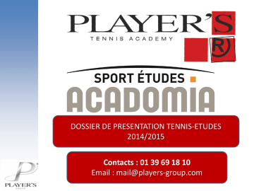 DOSSIER DE PRESENTATION TENNIS-ETUDES 2014/2015 Contacts : 01 39 69 18 10 Email : [email protected] 2 SOMMAIRE • • • • • • • • • • • • • Qui sommes-nous ?................................................... Page 4 Pourquoi intégrer PLAYER’S Tennis Academy ?........ Page 5 Quelques chiffres et résultats…………………………. Page 6 L’équipe PLAYER’S…………………………………..... Page 7 Nos activités…………………………………………….. Page 8 Les sites d’entraînements……………………………... Page 9 & 10 Programme Tennis-Etudes……………………………. Page 11 Scolarité Acadomia………………………………….… Page 12 Planning hebdomadaire……………………………...... Page 13 Un programme pour le haut-niveau…………………... Page 14 Hébergement (Option)…………………………………. Page 15 Options extra – sportives / Tarifs…...……………..….. Page 16 Tarifs & Options…………………………………........... Page 17 & 18 3 PLAYER’S TENNIS ACADEMY Pour vous offrir des conditions optimales, nous avons réuni toutes les compétences professionnelles nécessaires à la réussite de vos projets. Des conditions professionnelles Ex champions, managers sportifs, coachs de haut niveau, sparring partners tous niveaux, médecins spécialisés, enseignants professionnels, infrastructures exceptionnelles et qualitatives… Du sur-mesure Proposer des formules adaptées au profil spécifique de chaque joueur est absolument indispensable, c’est le fondement même de l’approche de Player’s… Tennis Etudes, 100% Gagnant…. 4 POURQUOI INTÉGRER PLAYER’S TENNIS ACADEMY ? Intégrer PLAYER’S Tennis Academy, c’est avant tout avoir un projet sportif et scolaire fort… Le travail, le dépassement de soi, la rigueur, l'exigence, l'envie, le plaisir, l'affirmation, la construction et l'estime de soi, sont autant de clefs pour votre réussite; Ce sont nos valeurs… Du joueur passionné au semi-professionnel, nous avons un programme adapté à votre profil… Une passion commune… Tout comme vous, nous avons la passion du tennis. Nous souhaitons la partager avec vous et mettre notre expérience à votre service afin de vous permettre d’atteindre votre plus haut niveau… A chacun son niveau… Player’s propose des partenaires adaptés au niveau de chacun (1 ère série à 3ème série) afin de développer leurs qualités personnelles. Une tête bien pleine… Pour vous donner toutes les chances de réussir votre vie et parce qu’il y aura un après tennis, « ACADOMIA Sport Etudes » vous accompagne aujourd’hui dans vos études en vous proposant un programme adapté et visionnaire. Conditions d’admission : • A partir de la 6ème jusqu’à la Terminale 5 QUELQUES CHIFFRES / RÉSULTATS / ACTIVITES Tennis Etudes & Camp d’Entraînement (depuis 2008 plus de 120 joueuses et joueurs) • Petra CETKOVSKA née en 1985, classée 48ème WTA classée 12ème Française, (1/8 de finale Roland Garros – 2008) • Mathieu RODRIGUES né en 1985, classé 245ème ATP, (Finaliste Critérium 2012) • Antoine BENNETEAU, né en 1986, classé 391ème ATP • Thibault VENTURINO, né en 1990, classé -15 • Maria CARDENAS, né en 1994, classée 1 053 WTA en 2012 • Iryna KURYANOVICH née en 1984, classée 356ème WTA en 2007 et 21ème Française en 2007 • Lyudmyla KICHENOK, née en 1992, classée 235 WTA en 2012 • Nadiya KICHENOK, née en 1992, classée 431 WTA en 2010 • Olivier STUART né en 1997, Champion de France 12 ans, classé 2/6 • Anish WIJESINGHE né en 1997, numéro 1 Sri Lankais, classé 4/6 • Farah MOURI née en 1995, numéro 1 Algérienne, classée 1/6 Stages et Stages avec Tournois (période de vacances scolaires) • 15 semaines d’activités sur l’année • Un effectif annuel de 300 stagiaires Ecole de Tennis • A partir de 5 ans. Du débutant au joueur confirmé et de compétition • 345 enfants passionnés par la balle jaune 6 L’ÉQUIPE PLAYER’S TENNIS ACADEMY Franck LEMOUSSE – Directeur / Entraîneur Tennis - Diplômé du DE Tennis - 23 années d’expériences - Entraîneur Junior haut niveau - Coach sur le circuit ITF Sylvain DELIGNY - Directeur Sportif - Diplômé du DE Tennis - Responsable des circuits & stages - 10 années d’expériences au service des joueurs de haut niveau Baptiste GRODENIC - Podologue du sport - Responsable Podologue - Soins et réalisation de semelles - Classement tennis 0 - Membre de l’ANPS Teddy DJABALI – Entraîneur Tennis Haut Niveau - Diplômé du DE Tennis - Entraîneur Haut Niveau - 16 années classé entre -15 et -30 Philippe CHAGNIER – Ostéopathe D.O. - Titulaire du diplôme d'état de Kinésithérapeute - Exerce l'ostéopathie exclusive depuis 20 ans - Fondateur de "Sostéo" la première structure nationale d'urgence ostéopathiques. - Auteur de "Connaitre l'ostéopathie" Franel édition Romain VIRLOUVET – Entraîneur Tennis - Diplômé du DE Tennis - Master Sciences, Technologies, santé à finalité professionnelle - Licence Sciences et ingénierie, Mention STAPS Xavier ROLE – Préparateur Physique - Licence STAPS - Master 2 Professionnel Entraînement parce que ce sont « les hommes » qui font la différence… 7 NOS ACTIVITÉS PLAYER’S Tennis Academy développe pour tous les joueurs et de tous niveaux différentes activités tout au long de l’année : • Tennis Etudes (Période scolaire) - Tous compétiteurs de niveau club à niveau international - De la 6ème à la Terminale - Scolarité Francophone et Anglophone : ACADOMIA Sport Etudes - Evolution vers un cursus en université américaine à Paris ou aux USA • Centres d’Entraînement (Toute l’année) - Joueurs et joueuses professionnel(le)s et semi-professionnel(le)s) - Joueurs de club, objectifs de classement • Ecole de Tennis Jeunes et Adultes (Période scolaire) - A partir de 5 ans - Groupes