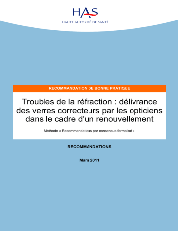 Troubles de la réfraction : délivrance de verres correcteurs par les opticiens dans le cadre d’un renouvellement RECOMMANDATION DE BONNE PRATIQUE Troubles de la réfraction : délivrance des verres correcteurs par les opticiens dans le cadre d’un renouvellement Méthode « Recommandations par consensus formalisé » RECOMMANDATIONS Mars 2011 HAS / Service des bonnes pratiques professionnelles / Mars 2011 1 Troubles de la réfraction : délivrance de verres correcteurs par les opticiens dans le cadre d’un renouvellement L’argumentaire et la synthèse des recommandations sont téléchargeables sur www.has-sante.fr Haute Autorité de Santé Service communication 2 avenue du Stade de France - F 93218 Saint-Denis La Plaine CEDEX Tél. :+33 (0)1 55 93 70 00 - Fax :+33 (0)1 55 93 74 00 Ce document a été validé par le Collège de la Haute Autorité de Santé en mars 2011. © Haute Autorité de Santé – 2011 HAS / Service des bonnes pratiques professionnelles / Mars 2011 2 Troubles de la réfraction : délivrance de verres correcteurs par les opticiens dans le cadre d’un renouvellement Sommaire Introduction............................................................................................................................ 4 1 Contexte ........................................................................................................................ 4 2 Thème et objectifs ........................................................................................................ 5 3 Populations et professionnels concernés .................................................................. 5 4 Méthode de travail ........................................................................................................ 5 5 Actualisation des recommandations........................................................................... 6 Recommandations................................................................................................................. 7 1 Dans quelles situations cliniques est-il recommandé qu’un ophtalmologiste s’oppose à l’adaptation de la prescription médicale initiale de lunettes par un opticien dans le cadre d’un renouvellement ? ................................................................................... 7 2 Quel niveau d’évolution de la réfraction devrait conduire l’opticien à orienter la personne vers l’ophtalmologiste avant délivrance de lunettes et quelles sont les conditions de cette orientation ?.......................................................................................... 8 Méthode Consensus formalisé ............................................................................................. 9 Participants ............................................................................................................................ 12 Fiche descriptive.................................................................................................................... 14 HAS / Service des bonnes pratiques professionnelles / Mars 2011 3 Troubles de la réfraction : délivrance de verres correcteurs par les opticiens dans le cadre d’un renouvellement Introduction 1 Contexte Les recommandations sur le thème « Troubles de la réfraction : délivrance de verres correcteurs par les opticiens dans le cadre d’un renouvellement » ont été élaborées à la demande du ministère de la Santé - Direction de la sécurité sociale et de la Caisse nationale d’assurance maladie des travailleurs salariés (Cnamts). La demande initiale était la suivante : élaborer à l’attention des opticiens un référentiel sur les situations dans lesquelles l’opticien doit orienter le patient vers l’ophtalmologiste avant délivrance de verres correcteurs ; élaborer à l’attention des ophtalmologistes un référentiel sur les situations pathologiques justifiant que le médecin s’oppose à la délivrance après adaptation par un opticien dans les conditions prévues par l’article L. 4362-10 du CSP ; au regard de la formation actuelle des opticiens, la HAS a-t-elle des propositions à formuler permettant de développer cette complémentarité avec les ophtalmologistes dans des conditions optimales de sécurité pour les patients ? Les troubles de la réfraction constituent un problème de santé publique en raison de leur fréquence (29 % de la population seraient myopes, 15 % astigmates, 9 % hypermétropes et plus de 40 % presbytes) et du handicap pour l’individu en cas de non ou mauvaise correction. La correction adéquate et le suivi des amétropies ont donc une importance majeure. La prescription de la correction (lunettes ou lentilles de contact) est faite par l’ophtalmologiste dans le cadre d’un examen médical complet de l’œil comprenant notamment l’étude de l’acuité visuelle et de la réfraction. Or, la démographie des ophtalmologistes est déclinante, les délais d’attente pour obtenir un rendez-vous s’allongent alors que le vieillissement de la population laisse présager une augmentation des besoins en soins oculaires par les ophtalmologistes. L’article 54 de la loi n° 2006-1640 du 21 décembre 2006 de financement de la Sécurité sociale et ses décrets d’application (décrets n° 2007-553 et n° 2007-551 d u 13 avril 2007) ont permis aux opticienslunetiers d’adapter, dans le cadre d'un renouvellement, les prescriptions médicales initiales de verres correcteurs datant de moins de 3 ans, à l'exclusion de celles établies pour les personnes âgées de moins de 16 ans et sauf opposition du médecin. Le risque évoqué est celui d’un retard au diagnostic de pathologies ophtalmologiques asymptomatiques. Ces recommandations s’inscrivent dans le cadre de la coopération entre professionnels de santé. Le décret n° 2007-553 du 13 avril 2007 a précisé le s conditions d’adaptation par l’opticien-lunetier de la prescription médicale initiale : le médecin prescripteur 