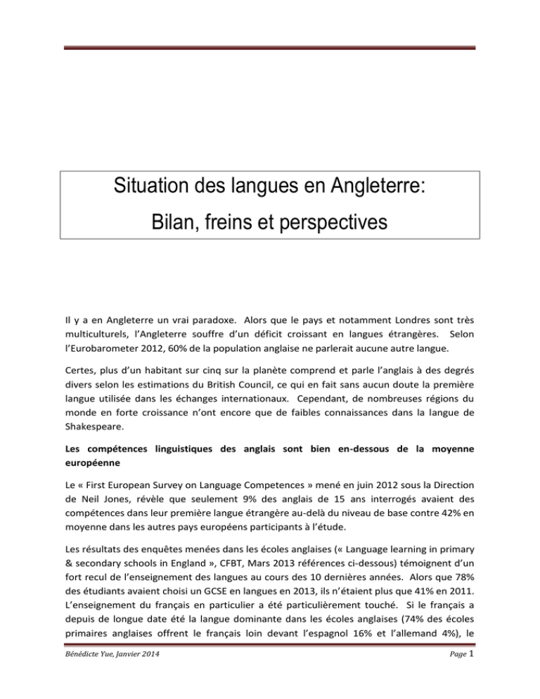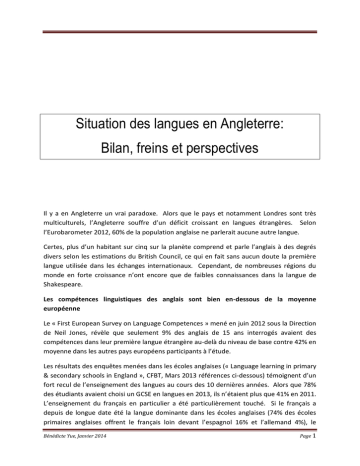 Situation des langues en Angleterre: Bilan, freins et perspectives Il y a en Angleterre un vrai paradoxe. Alors que le pays et notamment Londres sont très multiculturels, l’Angleterre souffre d’un déficit croissant en langues étrangères. Selon l’Eurobarometer 2012, 60% de la population anglaise ne parlerait aucune autre langue. Certes, plus d’un habitant sur cinq sur la planète comprend et parle l’anglais à des degrés divers selon les estimations du British Council, ce qui en fait sans aucun doute la première langue utilisée dans les échanges internationaux. Cependant, de nombreuses régions du monde en forte croissance n’ont encore que de faibles connaissances dans la langue de Shakespeare. Les compétences linguistiques des anglais sont bien en-dessous de la moyenne européenne Le « First European Survey on Language Competences » mené en juin 2012 sous la Direction de Neil Jones, révèle que seulement 9% des anglais de 15 ans interrogés avaient des compétences dans leur première langue étrangère au-delà du niveau de base contre 42% en moyenne dans les autres pays européens participants à l’étude. Les résultats des enquêtes menées dans les écoles anglaises (« Language learning in primary & secondary schools in England », CFBT, Mars 2013 références ci-dessous) témoignent d’un fort recul de l’enseignement des langues au cours des 10 dernières années. Alors que 78% des étudiants avaient choisi un GCSE en langues en 2013, ils n’étaient plus que 41% en 2011. L’enseignement du français en particulier a été particulièrement touché. Si le français a depuis de longue date été la langue dominante dans les écoles anglaises (74% des écoles primaires anglaises offrent le français loin devant l’espagnol 16% et l’allemand 4%), le Bénédicte Yue, Janvier 2014 Page 1 Situation des langues en Angleterre: bilan, freins et perspectives nombre d’étudiants choisissant le français en GCSE a baissé de 56% en 9 ans. La baisse est également notable en A level, le nombre de candidats ayant un A level en français ayant diminué de moitié entre 1996 et 2012. Cela a inévitablement des conséquences dans l’enseignement supérieur qui voit de nombreux départements de langues menacés face à la baisse des effectifs. Un contexte règlementaire et culturel peu favorable La stratégie du gouvernement anglais pour les langues a eu un effet très positif sur l’enseignement des langues dans les écoles primaires puisque 92% d’entre elles offrent la possibilité d’apprendre une langue étrangère contre 20-25% dans les années 2000. Les langues vont d’ailleurs devenir obligatoires en primaire) partir de KS2 (7 ans) à la rentrée 2014. En revanche, en secondaire, les langues ont cessé d’être obligatoires jusqu’à 16 ans en 2004. Les langues devenues optionnelles se sont ainsi retrouvées en concurrence avec d’autres matières qui sont apparues plus attractives et plus faciles dans une culture dominée par les « league tables ». Certaines mesures comme l’introduction en 2010 de l’English Bac à l’âge de 16 ans mesurant la performance dans 5 matières de base dont les langues font partie constituent des avancées sans pour autant inverser significativement la tendance. A cet environnement règlementaire très tumultueux se sont ajoutées des problématiques sur le terrain qui ont également freiné l’engouement pour les langues. On peut citer notamment : Le manque d’enseignants, conséquence directe du fort déclin des langues évoqué cidessus ; Le manque de formation initiale et continue notamment en primaire où dans 68% des cas, les langues sont enseignées par les instituteurs qui ne se sentent pas toujours suffisamment armés pour enseigner les langues ; Le manque d’information sur les ressources disponibles ; L’absence de mesures de performance reconnues et/ou lorsqu’elles existent la grande hétérogénéité des mesures utilisées (33% des écoles primaires n’ont aucun outil pour mesurer des progrès réalisés) La qualité de l’enseignement et la pédagogie utilisée longtemps critiquée par l’OFSTED ; ou encore L’absence de continuité entre primaire et secondaire, etc… De nombreux acteurs se mobilisent pour remédier à cette situation : ALL (Association for Language Learning), Network for Languages ou encore le lobby pour les langues « Speak to the future » (http://www.speaktothefuture.org) sous la Direction de Bernadette Holmes. La Bénédicte Yue, Janvier 2014 Page 2 Situation des langues en Angleterre: bilan, freins et perspectives British Academy et le British Council ont mis en avant toute une série de recommandations à travers 2 excellents rapports publiés en 2013 (références ci-dessous). Les Instituts culturels et notamment l’Institut français jouent par ailleurs un rôle important dans ce dispositif en soutenant les efforts de formation et en contribuant activement au développement de ressources pédagogiques. Les chercheurs notamment Gaby Meier, Jim Anderson et Roberto Filippi ont entrepris de coordonner leurs travaux de recherche afin de mettre en avant les nombreux avantages liés au plurilinguisme (cognitifs, cohésion sociale et ouverture au monde, apports du CLIL, etc…). Ces différentes réflexions sont au centre des préoccupations de l’objectif 2 du Plan école qui vise à promouvoir l’intégration du français dans le système éducatif britannique que ce soit par la création d’écoles bilingues (free schools, etc…), la mise en place de sections bilingues ou de CLIL (Content & Language Integrated Learning) à des degrés divers. C’est dans cet esprit que s’est tenue une table ronde organisée par le service culturel de l’ambassade le 10 décembre dernier à laquelle ont participé les différents partenaires mentionnés ci-dessus ainsi que des représentants des écoles et universitaires afin d’échanger sur ces différentes problématiqu