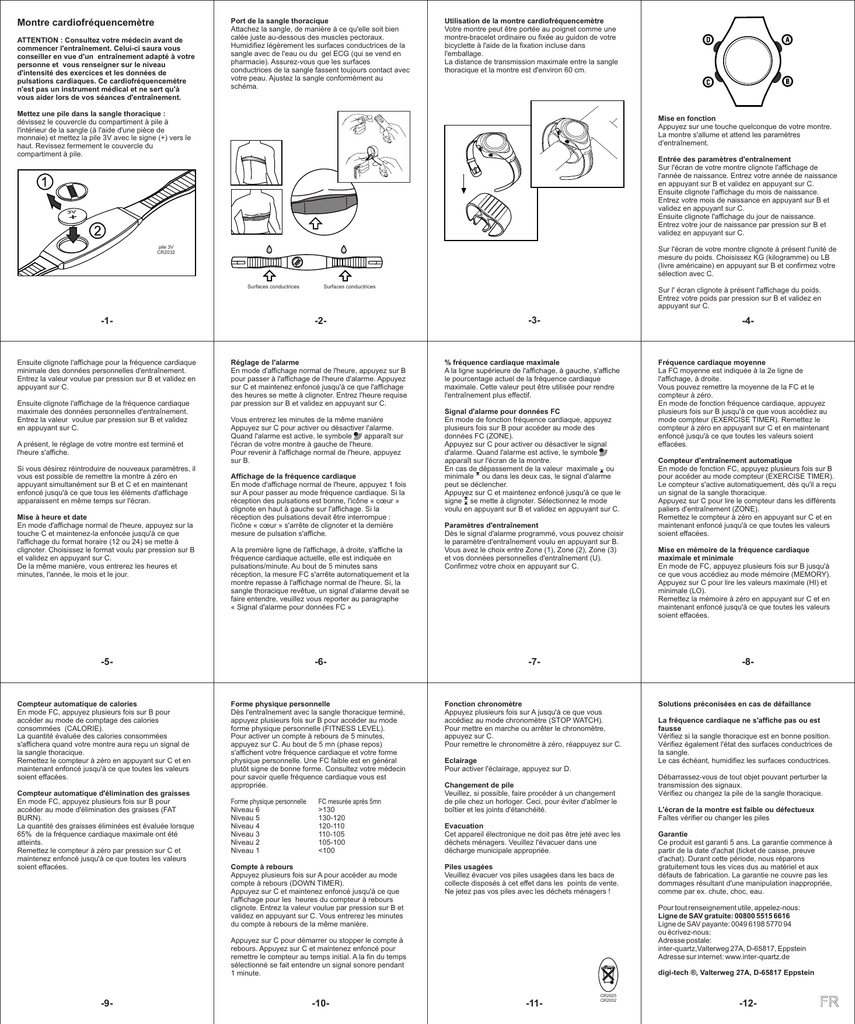 Montre cardiofréquencemètre ATTENTION : Consultez votre médecin avant de commencer l'entraînement. Celui-ci saura vous conseiller en vue d'un entraînement adapté à votre personne et vous renseigner sur le niveau d'intensité des exercices et les données de pulsations cardiaques. Ce cardiofréquencemètre n'est pas un instrument médical et ne sert qu'à vous aider lors de vos séances d'entraînement. Port de la sangle thoracique Attachez la sangle, de manière à ce qu'elle soit bien calée juste au-dessous des muscles pectoraux. Humidifiez légèrement les surfaces conductrices de la sangle avec de l'eau ou du gel ECG (qui se vend en pharmacie). Assurez-vous que les surfaces conductrices de la sangle fassent toujours contact avec votre peau. Ajustez la sangle conformément au schéma. Utilisation de la montre cardiofréquencemètre Votre montre peut être portée au poignet comme une montre-bracelet ordinaire ou fixée au guidon de votre bicyclette à l'aide de la fixation incluse dans l'emballage. La distance de transmission maximale entre la sangle thoracique et la montre est d'environ 60 cm. Mettez une pile dans la sangle thoracique : dévissez le couvercle du compartiment à pile à l'intérieur de la sangle (à l'aide d'une pièce de monnaie) et mettez la pile 3V avec le signe (+) vers le haut. Revissez fermement le couvercle du compartiment à pile. Mise en fonction Appuyez sur une touche quelconque de votre montre. La montre s'allume et attend les paramètres d'entraînement. Entrée des paramètres d'entraînement Sur l'écran de votre montre clignote l'affichage de l'année de naissance. Entrez votre année de naissance en appuyant sur B et validez en appuyant sur C. Ensuite clignote l'affichage du mois de naissance. Entrez votre mois de naissance en appuyant sur B et validez en appuyant sur C. Ensuite clignote l'affichage du jour de naissance. Entrez votre jour de naissance par pression sur B et validez en appuyant sur C. pile 3V CR2032 Sur l'écran de votre montre clignote à présent l'unité de mesure du poids. Choisissez KG (kilogramme) ou LB (livre américaine) en appuyant sur B et confirmez votre sélection avec C. Surfaces conductrices Surfaces conductrices Sur l' écran clignote à présent l'affichage du poids. Entrez votre poids par pression sur B et validez en appuyant sur C. -1- -2- -3- Ensuite clignote l'affichage pour la fréquence cardiaque minimale des données personnelles d'entraînement. Entrez la valeur voulue par pression sur B et validez en appuyant sur C. Réglage de l'alarme En mode d'affichage normal de l'heure, appuyez sur B pour passer à l'affichage de l'heure d'alarme. Appuyez sur C et maintenez enfoncé jusqu'à ce que l'affichage des heures se mette à clignoter. Entrez l'heure requise par pression sur B et validez en appuyant sur C. % fréquence cardiaque maximale A la ligne supérieure de l'affichage, à gauche, s'affiche le pourcentage actuel de la fréquence cardiaque maximale. Cette valeur peut être utilisée pour rendre l'entraînement plus effectif. Ensuite clignote l'affichage de la fréquence cardiaque maximale des données personnelles d'entraînement. Entrez la valeur voulue par pression sur B et validez en appuyant sur C. A présent, le réglage de votre montre est terminé et l'heure s'affiche. Si vous désirez réintroduire de nouveaux paramètres, il vous est possible de remettre la montre à zéro en appuyant simultanément sur B et C et en maintenant enfoncé jusqu'à ce que tous les éléments d'affichage apparaissent en même temps sur l'écran. Mise à heure et date En mode d'affichage normal de l'heure, appuyez sur la touche C et maintenez-la enfoncée jusqu'à ce que l'affichage du format horaire (12 ou 24) se mette à clignoter. Choisissez le format voulu par pression sur B et validez en appuyant sur C. De la même manière, vous entrerez les heures et minutes, l'année, le mois et le jour. Vous entrerez les minutes de la même manière Appuyez sur C pour activer ou désactiver l'alarme. Quand l'alarme est active, le symbole A apparaît sur l'écran de votre montre à gauche de l'heure. Pour revenir à l'affichage normal de l'heure, appuyez sur B. Affichage de la fréquence cardiaque En mode d'affichage normal de l'heure, appuyez 1 fois sur A pour passer au mode fréquence cardiaque. Si la réception des pulsations est bonne, l'icône « cœur » clignote en haut à gauche sur l'affichage. Si la réception des pulsations devait être interrompue : l'icône « cœur » s'arrête de clignoter et la dernière mesure de pulsation s'affiche. A la première ligne de l'affichage, à droite, s'affiche la fréquence cardiaque actuelle, elle est indiquée en pulsations/minute. Au bout de 5 minutes sans réception, la mesure FC s'arrête automatiquement et la montre repasse à l'affichage normal de l'heure. Si, la sangle thoracique revêtue, un signal d'alarme devait se faire entendre, veuillez vous reporter au paragraphe « Signal d'alarme pour données FC » -5- Compteur automatique de calories En mode FC, appuyez plusieurs fois sur B pour accéder au mode de comptage des calories consommées (CALORIE). La quantité évaluée des calories consommées s'affichera quand votre montre aura reçu un signal de la sangle thoracique. Remettez le compteur à zéro en appuyant sur C et en maintenant enfoncé jusqu'à ce que toutes les valeurs soient effacées. Compteur automatique d'élimination des graisses En mode FC, appuyez plusieurs fois sur B pour accéder au mode d'élimination des graisses (FAT BURN). La quantité des graisses éliminées est évaluée lorsque 65% de la fréquence cardiaque maximale ont été atteints. Remettez le compteur à zéro par pression sur C et maintenez enfoncé jusqu'à ce que toutes les valeurs soient effacées. -6- Forme physique personnelle Dès l'entraînement avec la sangle thoracique terminé, appuyez plusieurs fois sur B pour accéder au mode forme physique personnelle (FITNESS LEVEL). Pour