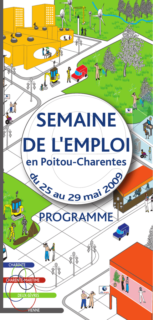 SEMAINE DE L'EMPLOI du 09 8 en Poitou-Charentes 129 0 5a 2 i u 23 9 ma PROGRAMME CHARENTE CHARENTE-MARITIME DEUX-SÉVRES VIENNE Coffe e Edito 50 manifestations pour trouver un emploi Pour la 5ème année consécutive, Pôle emploi Poitou-Charentes organise avec l’ensemble du service public de l’emploi et de nombreux partenaires, un événement régional du 25 au 29 mai 2009 : La semaine de l’emploi. Notre objectif est de vous permettre de rencontrer directement les entreprises qui recrutent dans des secteurs d’activité très variés. Pour cela des professionnels vous présenteront les métiers qui offrent des débouchés, les dispositifs de formation et d’accompagnement, ainsi que les services dont vous pourrez bénéficier pour trouver rapidement un emploi. L’édition 2008, qui présentait plus de 2 000 offres d’emploi, avait permis d’enregistrer le nombre record de plus de 9000 visiteurs dans la semaine. Je vous donne donc rendez-vous cette année encore dans les sites Pôle emploi et sur les autres lieux de manifestations organisées à votre attention. Je ne doute pas que cette mobilisation collective pour l’emploi, trouvera toute son utilité dans le contexte économique difficile qui est le nôtre actuellement, et je vous souhaite des échanges fructueux et une pleine réussite dans vos démarches de retour à l’emploi. Dominique Morin Directeur Régional Pôle emploi Poitou-Charentes La Semaine de l’Emploi - 25 au 29 mai 2009 | 2 Pôle emploi Poitou-Charentes Vienne Deux-Sèvres Charente-Maritime Charente La Semaine de l’Emploi - 25 au 29 mai 2009 | 3 Sommaire 50 manifestations dans toute la région Poitou-Charentes En Charente Lundi 25 mai...................................................................................................5 Mardi 26 mai..................................................................................................6 Mercredi 27 mai. ........................................................................................7 Jeudi 28 mai....................................................................................................7 Vendredi 29 mai.........................................................................................8 En Charente-Maritime Lundi 25 mai...................................................................................................9 Mardi 26 mai.............................................................................................. 10 Mercredi 27 mai. .................................................................................... 11 Jeudi 28 mai................................................................................................ 11 En Deux-Sèvres Lundi 25 mai............................................................................................... 12 Mardi 26 mai.............................................................................................. 12 Mercredi 27 mai. .................................................................................... 13 Jeudi 28 mai................................................................................................ 13 Vendredi 29 mai..................................................................................... 13 En Vienne Lundi 25 mai............................................................................................... 14 Mardi 26 mai.............................................................................................. 14 Mercredi 27 mai. .................................................................................... 15 Jeudi 28 mai................................................................................................ 15 Vendredi 29 mai..................................................................................... 16 La Semaine de l’Emploi - 25 au 29 mai 2009 | 4 CHARENTE Du 25 au 29 mai PÔLE EMPLOI Angoulême St Martial et Champ de Mars “ L’Insertion par l’Activité Économique : un tremplin vers l’avenir ” Rencontres directes entre les salariés issus de l’Insertion par l’Activité Économique et des entreprises invitées par les équipes professionnelles du bassin d’emploi d’Angoulême. Partenaires : Alésie, IRIS, DDTEFP, DIESS, PLIE... Lieu : Pôle emploi Angoulême Champ de Mars, 6 rue du Père Wrésinski et Pôle emploi Angoulême St Martial, 7 rue Jean Fougerat. Lundi 25 mai 10h - 16h PÔLE EMPLOI Angoulême St Martial “ La restauration rapide recrute ” L’expansion de la restauration rapide offre de nouvelles opportunités d’emploi. De nombreux recruteurs vous attendent pour pourvoir les postes qu’ils proposent. Des informations sur les formations et la découverte de la méthode de recrutement par habiletés vous seront proposées. Partenaires : PFV 16, organismes de formation locaux... Lieu : Pôle emploi Angoulême St Martial, 7 rue Jean Fougerat. 14h - 16h PÔLE EMPLOI Cognac “ Se former à la santé ” Présentation des différents dispositifs de formation dans le domaine de la santé et de l’action sociale ainsi que les contrats et les aides. Partenaires : Directeurs ressources humaines santé, Conseil régional, Fafsea, DRASS, DDTEFP... Lieu : salle « La cale », Centre Socio Culturel de Crouin, bd des Borderies, COGNAC. La Semaine de l’Emploi - 25 au 29 mai 2009 | 5 CHARENTE Mardi 26 mai 8h45 - 12h PÔLE EMPLOI Angoulême Champ de Mars “ Evaluez vos habiletés pour les métiers de la santé ” Les employeurs du secteur santé découvrent les exercices par habiletés sur les métiers d’ASH et d’Agent de bio-nettoyage de 8h45 à 10h. Deux tables rondes suivront avec les demandeurs d’emploi de 10h30 à 11h10 et de 11h20 à 12h. Partenaires : employeurs du secteur santé (hôpitaux, cliniques, maisons de retraite médicalisées). Lieu : Pôle emploi Charente - Plateforme de vocation, 11 impasse route de St Michel - LA COURONNE. 10h - 16h PÔLE EMPLOI Angoulême St Martial “ Les métiers des transports e