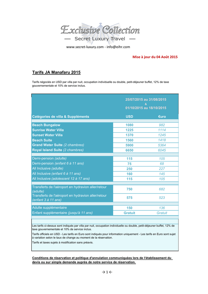1,1 www.secret‐luxury.com ‐ [email protected] Mise à jour du 04 Août 2015 Tarifs JA Manafaru 2015 Tarifs négociés en USD par villa par nuit, occupation individuelle ou double, petit-déjeuner buffet, 12% de taxe gouvernementale et 10% de service inclus. 25/07/2015 au 31/08/2015 & 01/10/2015 au 18/10/2015 Catégories de villa & Suppléments USD €uro Beach Bungalow Sunrise Water Villa Sunset Water Villa Beach Suite Grand Water Suite (2 chambres) Royal y Island Suite (2 ( chambres)) 1080 1225 1370 1560 5900 6650 982 1114 1245 1418 5364 6045 Demi-pension (adulte) Demi-pension (enfant 6 à 11 ans) All Inclusive (adulte) All Inclusive (enfant 6 à 11 ans) All Inclusive (adolescent 12 à 17 ans) 115 75 250 160 115 105 68 227 145 105 750 682 575 523 150 Gratuit 136 Gratuit Transferts de l'aéroport en hydravion aller/retour (adulte) Transferts de l'aéroport en hydravion aller/retour (enfant 3 à 11 ans) Adulte supplémentaire Enfant supplémentaire (jusqu'à 11 ans) 1,31 Les tarifs ci-dessus sont indiqués par villa par nuit, occupation individuelle ou double, petit-déjeuner buffet, 12% de taxe gouvernementale et 10% de service inclus. Tarifs officiels en USD - Les tarifs en Euro sont indiqués pour information uniquement - Les tarifs en Euro sont sujet à variation selon le taux de change au moment de la réservation. Tarifs et taxes sujets à modification sans préavis. Conditions de réservation et politique d'annulation communiquées lors de l'établissement du devis ou sur simple demande auprès de notre service de réservation. → 1 ← Tarifs négociés en USD par villa par nuit, occupation individuelle ou double, petit-déjeuner buffet, 12% de taxe gouvernementale et 10% de service inclus. 01/09/2015 au 30/09/2015 Catégories de villa & Suppléments USD €uro Beach Bungalow Sunrise Water Villa Sunset Water Villa Beach Suite Grand Water Suite (2 chambres) Royal Island Suite (2 chambres) 900 1050 1190 1380 4500 5280 818 955 1082 1255 4091 4800 Demi-pension (adulte) Demi-pension (enfant 6 à 11 ans) All Inclusive (adulte) All Inclusive (enfant 6 à 11 ans) All Inclusive (adolescent 12 à 17 ans) 115 75 225 140 85 105 68 205 127 77 750 682 575 523 150 Gratuit 136 Gratuit Transferts de l'aéroport en hydravion aller/retour (adulte) Transferts de l'aéroport en hydravion aller/retour (enfant 3 à 11 ans) Adulte supplémentaire Enfant supplémentaire (jusqu'à 11 ans) 1,31 Les tarifs ci-dessus sont indiqués par villa par nuit, occupation individuelle ou double, petit-déjeuner buffet, 12% de taxe gouvernementale et 10% de service inclus. Tarifs officiels en USD - Les tarifs en Euro sont indiqués pour information uniquement - Les tarifs en Euro sont sujet à variation selon le taux de change au moment de la réservation. Tarifs et taxes sujets à modification sans préavis. Conditions de réservation et politique d'annulation communiquées lors de l'établissement du devis ou sur simple demande auprès de notre service de réservation. → 2 ← Tarifs négociés en USD par villa par nuit, occupation individuelle ou double, petit-déjeuner buffet, 12% de taxe gouvernementale et 10% de service inclus. 19/10/2015 au 23/12/2015 Catégories de villa & Suppléments USD €uro Beach Bungalow Sunrise Water Villa Sunset Water Villa Beach Suite Grand Water Suite (2 chambres) Royal Island Suite (2 chambres) 1320 1500 1705 1920 6120 7140 1200 1364 1550 1745 5564 6491 Demi-pension (adulte) Demi-pension (enfant 6 à 11 ans) All Inclusive (adulte) All Inclusive (enfant 6 à 11 ans) All Inclusive (adolescent 12 à 17 ans) 115 75 250 160 115 105 68 227 145 105 750 682 575 523 150 Gratuit 136 Gratuit Transferts de l'aéroport en hydravion aller/retour (adulte) Transferts de l'aéroport en hydravion aller/retour (enfant 3 à 11 ans) Adulte supplémentaire Enfant supplémentaire (jusqu'à 11 ans) 1,25 Les tarifs ci-dessus sont indiqués par villa par nuit, occupation individuelle ou double, petit-déjeuner buffet, 12% de taxe gouvernementale et 10% de service inclus. Tarifs officiels en USD - Les tarifs en Euro sont indiqués pour information uniquement - Les tarifs en Euro sont sujet à variation selon le taux de change au moment de la réservation. Tarifs et taxes sujets à modification sans préavis. Conditions de réservation et politique d'annulation communiquées lors de l'établissement du devis ou sur simple demande auprès de notre service de réservation. → 3 ← Tarifs négociés en USD par villa par nuit, occupation individuelle ou double, petit-déjeuner buffet, 12% de taxe gouvernementale et 10% de service inclus. 24/12/2015 au 08/01/2016 Catégories de villa & Suppléments Beach Bungalow Sunrise Water Villa Sunset Water Villa Beach Suite Grand Water Suite (2 chambres) Royal Island Suite (2 chambres) Demi-pension (adulte) Demi-pension (enfant 6 à 11 ans) All Inclusive (adulte) All Inclusive (enfant 6 à 11 ans) All Inclusive (adolescent 12 à 17 ans) Transferts de l'aéroport en hydravion aller/retour (adulte) Transferts de l'aéroport en hydravion aller/retour (enfant 3 à 11 ans) Adulte supplémentaire Enfant supplémentaire (jusqu'à 11 ans) USD €uro 1740 1980 2220 2700 8950 10000 1582 1800 2018 2455 8136 9091 115 75 250 160 115 105 68 227 145 105 750 682 575 523 150 Gratuit 136 Gratuit 1,31 Les tarifs ci-dessus sont indiqués par villa par nuit, occupation individuelle ou double, petit-déjeuner buffet, 12% de taxe gouvernementale et 10% de service inclus. Supplément obligatoire à prévoir pour le dîner du Réveillon de la St. Sylvestre - Montant du supplément sera communiqué lors de l'établissement de votre devis. Tarifs officiels en USD - Les tarifs en Euro sont indiqués pour information uniquement - Les tarifs en Euro sont sujet à variation selon le taux de change au moment de la réservation. Tarifs et taxes sujets à modification sans préavis. Conditions de réservation et politique d'annulation communiquées lors de l'établissement du devis ou sur simple deman