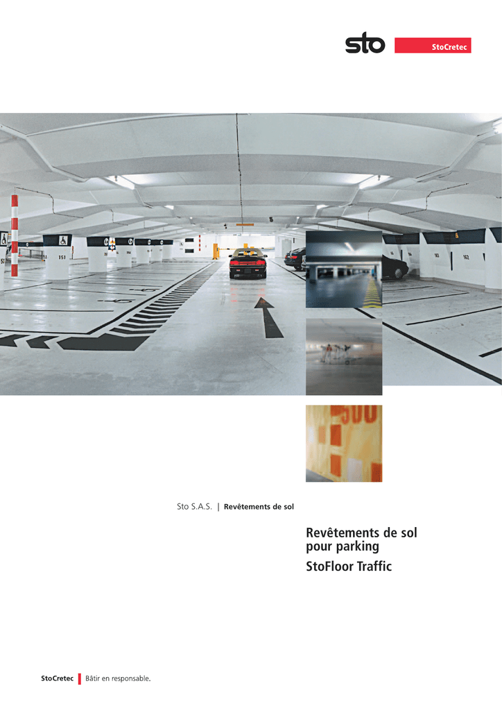 Sto S.A.S. | Revêtements de sol Revêtements de sol pour parking StoFloor Traffic Les informations contenues dans ce document correspondent à l’état de nos connaissances à sa date de parution. Elles sont fondées sur notre expérience et sur les travaux de nos laboratoires et service de recherche. Ces informations sont complémentaires à nos instructions de mise en œuvre et à nos fiches techniques. En raison des différentes techniques d’application et des utilisations diverses ces informations sont sans engagement de notre part : nous ne saurions notamment assumer une responsabilité générale du simple fait de l'utilisation et de la mise en œuvre de nos produits. Nous travaillons en permanence au développement et à l'amélioration de nos produits et systèmes. Nous nous réservons donc le droit de procéder à des modifications que ce soit pour des raisons techniques ou légales. Notre site Internet ou votre conseiller sto, vous permettrons d’avoir les informations techniques les plus récentes. Cette édition annule et remplace la précédente, et perd sa validité dès la parution d'une nouvelle édition. 2 Sommaire l Revêtements de sol pour parking Page 5 I Systèmes de revêtements de sol pour parking Page 5 I Préliminaire à la mise en œuvre d’un revêtement de sol pour parking Pages 6-9 I Systèmes TrafficEco, Classic, Plus, Pro Page 10 I Produits de compléments aux revêtements de sol Page 11 I Références 3 Revêtements de sol pour parking | Systèmes de revêtement de sol pour parking StoCretec : Systèmes de revêtements de sol pour parking Les revêtements de sol industriel doivent présenter des caractéristiques et des performances en accord avec les exigences du chantier et la destination des locaux. StoCretec vous propose des systèmes de revêtements de sol spécialement adaptés et conçus pour vos parkings. Le parking : des exigences de performances pour la protection des bétons. Le parking présente une grande variété tant dans ses dimensions, sa construction (aérienne ou souterraine) que pour ces exigences mécaniques (véhicule léger ou poids lourds). Le manque de places de stationnement dans les villes, incite à la construction de parking de plus en plus nombreux que ce soient pour les habitations collectives, les bureaux, mais aussi les aéroports, les galeries marchandes… . De plus, les parkings existants font l’objet d’une rénovation afin d’attirer les utilisateurs sur un lieu plus design et plus sécurisé. Dans le passé, le béton utilisé pour la construction des parkings n’a fait l’objet d’aucune protection. Or, les sollicitations mécaniques et chimiques du béton armé dans un parking sont très élevées. En effet, l’eau et les sels de déverglaçage en hiver amenés par les véhicules ainsi que la concentration en CO2 élevée due aux gaz résiduels agressent le béton et ceci d’autant plus que les sols béton sont soumis à des vibrations provoquant de fines fissures par lesquelles s’infiltrent les polluants chimiques encore plus facilement. C’est pourquoi StoCretec vous propose différents systèmes de revêtements de sols de parking afin de répondre au mieux à vos exigences tant techniques qu’esthétiques. 4 Préliminaire à la mise en œuvre d’un revêtement de sol pour parking l Revêtements de sol pour parking Préliminaire à la mise en œuvre d’un revêtement de sol pour parking Pour des sols neufs ou en rénovation Préparation de sols • Grenaillage systématique. • Suppression des graisses et tâches d’huile, soit par un agent nettoyant approprié, soit en éliminant (au marteaupiqueur) les parties de béton souillées. Traitement des joints de fractionnement Traitement des joints de dilatation • Ouvrir à la disqueuse le joint : bourrer le joint avec la résine StoPox GH 205 chargé avec du StoQuarz. - 1 part de résine StoPox GH 205 - 2 parts en StoQuarz 0,01 mm - 2 parts en StoQuarz 0,1 à 0,5 mm • Recouvrir avec le revêtement prévu. Les joints de dilatation doivent être traités avec un mastic Polyuréthane résistant aux sollicitations chimiques et mécaniques. En aucun cas, les joints de dilatation ne doivent être recouverts par le revêtement en résine. • Préparer un mortier époxy composé de : - 1 part de résine StoPox GH 205 Plinthes - 3 parts en StoQuarz 0,1 à 0,5 mm - 3 parts en StoQuarz 0,3 à 0,8 mm (Consommation du mélange : environ 2 kg/m en plinthe de 5 cm). • Le mortier préparé sera appliqué sur une couche primaire de StoPox GH 205 encore fraîche, bien compacté et profilé en plinthe. 5 Revêtements de sol pour parking | Système TrafficEco Système TrafficEco Description du système • Revêtement pour sols de parking en intérieur • Pour la protection et la décoration de sols à trafics moyens : parking en étage, parking souterrain • Epaisseur du système : 0,3 à 0,6 mm Caractéristiques • StoPox WL 100 : - Epoxy bi-composant pigmenté en phase aqueuse - Aspect brillant - Revêtement perméable à la vapeur d’eau Résistance mécanique : *** Résistance chimique : ** Application de StoPox WL 100, dilué avec 20 % d’eau Primaire • Matériel d’application : raclette en caoutchouc mousse et rouleau à poils courts • Consommation : 250 g/m2 (selon l’absorption du support) • Dilution : 20% avec de l’eau. Application de 2 couches StoPox WL 100 • Matériel d’application : raclette en caoutchouc mousse et rouleau à poils courts ou pistolet de projection, Finition type Airless • Consommation : environ 250 g/m2 et par couche • Dilution : 5 % avec de l’eau. Remarque : Le StoPox WL 100 est un revêtement en film mince, il ne masque pas les défauts esthétiques du support. Ce revêtement peut être utilisé en extérieur, si l’on accepte un léger farinage ou une légère décoloration des couleurs. 6 Système TrafficClassic l Revêtements de sol pour parking Système TrafficClassic Description du système 