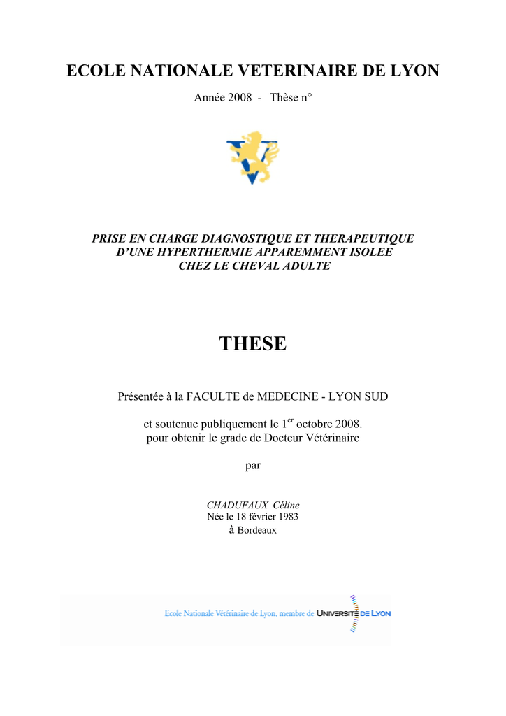 ECOLE NATIONALE VETERINAIRE DE LYON Année 2008 - Thèse n° PRISE EN CHARGE DIAGNOSTIQUE ET THERAPEUTIQUE D’UNE HYPERTHERMIE APPAREMMENT ISOLEE CHEZ LE CHEVAL ADULTE THESE Présentée à la FACULTE de MEDECINE - LYON SUD et soutenue publiquement le 1er octobre 2008. pour obtenir le grade de Docteur Vétérinaire par CHADUFAUX Céline Née le 18 février 1983 à Bordeaux 2 Remerciements A Monsieur le Professeur Jean-Pierre FLANDROIS De la Faculté de Médecine de Lyon Qui m’a fait l’honneur d’accepter la présidence de mon jury de thèse. Hommages respectueux. A Monsieur le Professeur Jean-Luc CADORE De l’Ecole Nationale Vétérinaire de Lyon Qui m’a fait l’honneur d’accepter le rôle de premier assesseur de ce jury. Qui a initié et guidé ce travail. Toute ma gratitude et très sincères remerciements. A Madame le Professeur Agnès LEBLOND De l’Ecole Nationale Vétérinaire de Lyon Qui m’a fait l’honneur d’accepter le rôle de deuxième assesseur de ce jury. Sincères remerciements. 3 4 Au Docteur Vétérinaire François VALON De la Commission des maladies infectieuses et parasitaires de l’AVEF Qui a également initié ce travail et qui m’a permis d’utiliser les données de l’enquête. Sincères remerciements. 5 6 A mes parents A Nathalie, Amélie, Clément et Clara Pour votre soutien, vos encouragements, pour chaque moment passé à vos côtés. Toute mon affection et mes éternels remerciements. A toute ma famille Toute ma tendresse. A Lala, Isa, Mimie et Blandine (et leurs moitiés) Pour ces 5 superbes années et pour toutes celles à venir. Mille et un mercis. A Sébastien et miss Morgane Un grand merci A mes amis de l’Ecole et d’ailleurs A tous ceux qui ont accepté de relire tout ou une partie de ce travail A tous ceux qui ont et qui vont participer à ma formation 7 8 Table des matières Remerciements ........................................................................................................................................................ 3 Liste des figures..................................................................................................................................................... 12 Liste des tableaux .................................................................................................................................................. 13 Liste des abréviations ............................................................................................................................................ 14 Introduction ........................................................................................................................................................... 15 Chapitre I :........................................................................................................................................................... 17 Enquête auprès des praticiens à propos de la piroplasmose et l’utilisation de l’imidocarbe........................ 17 I. Pourquoi une telle étude ? ......................................................................................................................... 19 II. Questionnaire : ........................................................................................................................................... 19 III. Résultats de l’enquête :.............................................................................................................................. 21 IV. Interprétation et biais de l’enquête : ........................................................................................................ 22 A. Biais de l’enquête :.................................................................................................................................. 22 B. Interprétation :......................................................................................................................................... 23 Chapitre II : ......................................................................................................................................................... 25 Pathogénie et étiologie de l’hyperthermie chez le cheval adulte...................................................................... 25 I. Définitions : ................................................................................................................................................ 27 A. Définition de l’hyperthermie :................................................................................................................. 27 B. Distinction entre fièvre et hyperthermie :................................................................................................ 27 C. Le syndrome « piro-like » : ..................................................................................................................... 27 II. Les mécanismes de la thermorégulation et de l’hyperthermie : ............................................................ 28 A. Mécanismes de la thermorégulation :...................................................................................................... 28 1. Thermogenèse et thermolyse :............................................................................................................ 28 a) Echanges thermiques : ................................................................................................................... 28 b) Modifications comportementales :................................................................................................. 29 c) Sudation :....................................................................................................................................... 30 d) Polypnée thermique : ..................................................................................................................... 31 e) Conclusion :.......................................................................................