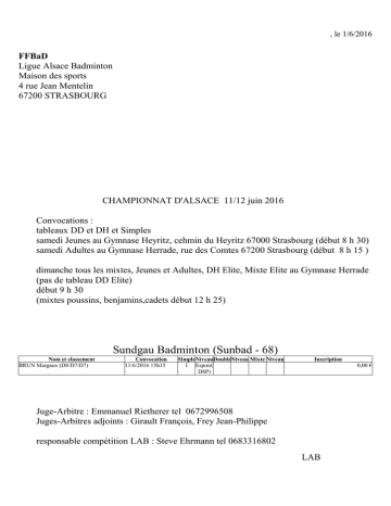 , le 1/6/2016 FFBaD Ligue Alsace Badminton Maison des sports 4 rue Jean Mentelin 67200 STRASBOURG CHAMPIONNAT D'ALSACE 11/12 juin 2016 Convocations : tableaux DD et DH et Simples samedi Jeunes au Gymnase Heyritz, cehmin du Heyritz 67000 Strasbourg (début 8 h 30) samedi Adultes au Gymnase Herrade, rue des Comtes 67200 Strasbourg (début 8 h 15 ) dimanche tous les mixtes, Jeunes et Adultes, DH Elite, Mixte Elite au Gymnase Herrade (pas de tableau DD Elite) début 9 h 30 (mixtes poussins, benjamins,cadets début 12 h 25) Sundgau Badminton (Sunbad - 68) Nom et classement BRUN Margaux (D8/D7/D7) Convocation 11/6/2016 15h15 SimpleNiveauDoubleNiveau Mixte Niveau I Espoir( D8P) Inscription 0,00 € Juge-Arbitre : Emmanuel Rietherer tel 0672996508 Juges-Arbitres adjoints : Girault François, Frey Jean-Philippe responsable compétition LAB : Steve Ehrmann tel 0683316802 LAB , le 1/6/2016 FFBaD Ligue Alsace Badminton Maison des sports 4 rue Jean Mentelin 67200 STRASBOURG CHAMPIONNAT D'ALSACE 11/12 juin 2016 Convocations : tableaux DD et DH et Simples samedi Jeunes au Gymnase Heyritz, cehmin du Heyritz 67000 Strasbourg (début 8 h 30) samedi Adultes au Gymnase Herrade, rue des Comtes 67200 Strasbourg (début 8 h 15 ) dimanche tous les mixtes, Jeunes et Adultes, DH Elite, Mixte Elite au Gymnase Herrade (pas de tableau DD Elite) début 9 h 30 (mixtes poussins, benjamins,cadets début 12 h 25) Ent Sportive 2 Badminton (ES2B - 68) Nom et classement BOURNAUD Morgane (D7/R6/R6) Convocation 11/6/2016 8h50 FARINELLI Camille (D7/R6/R6) 11/6/2016 8h50 GROELL Malorie (D7/D8/D8) SCHWARTZ Noe (D8) 11/6/2016 9h00 11/6/2016 9h30 ROUBY Geoffrey (N3/N2/N3) 11/6/2016 14h40 BERTIN Remi (P1) 11/6/2016 8h30 LYAUTEY Paul (P1) 11/6/2016 8h30 JAEG Mickael (R4/N3/R4) 11/6/2016 10h00 SimpleNiveauDoubleNiveau Mixte Niveau I Honne ur(R4 R5) I Honne ur(R4 R5) I Cadet I Minim I Minim I Minim e e e I Excelle nce(N2 N3) I I I Poussi Poussi Poussi n n n I I Poussi Poussi n n I Honne I Honne ur(R4 ur(R4 R5) R5) Inscription 0,00 € 0,00 € 0,00 € 0,00 € 0,00 € 0,00 € 0,00 € 0,00 € HERNANDEZ Pierre (R5/R5/R6) 11/6/2016 8h50 I JOLY Killian (R5/R4/R5) 11/6/2016 10h00 I LE NEZET Aurélie (R5/R4/R5) 11/6/2016 8h50 I VOGTENBERGER Laure (R5/R5/R4) 12/6/2016 11h15 GHINOLFI Florine (R6/R6/D7) 11/6/2016 12h00 I LEPRINCE Romane (R6/R6/D7) 11/6/2016 12h00 I RISSER Alexandre (R6/R5/R5) 11/6/2016 8h50 Honne ur(R4 R5) I Honne ur(R4 R5) Honne ur(R4 R5) Honne ur(R4 R5) I 0,00 € 0,00 € I Minim e Minim e I I I Minim e Minim e Honne ur(R4 R5) 0,00 € Promot ion(R6 D7) I I 0,00 € Honne ur(R4 R5) Minim e Minim e 0,00 € 0,00 € 0,00 € Juge-Arbitre : Emmanuel Rietherer tel 0672996508 Juges-Arbitres adjoints : Girault François, Frey Jean-Philippe responsable compétition LAB : Steve Ehrmann tel 0683316802 LAB , le 1/6/2016 FFBaD Ligue Alsace Badminton Maison des sports 4 rue Jean Mentelin 67200 STRASBOURG CHAMPIONNAT D'ALSACE 11/12 juin 2016 Convocations : tableaux DD et DH et Simples samedi Jeunes au Gymnase Heyritz, cehmin du Heyritz 67000 Strasbourg (début 8 h 30) samedi Adultes au Gymnase Herrade, rue des Comtes 67200 Strasbourg (début 8 h 15 ) dimanche tous les mixtes, Jeunes et Adultes, DH Elite, Mixte Elite au Gymnase Herrade (pas de tableau DD Elite) début 9 h 30 (mixtes poussins, benjamins,cadets début 12 h 25) Entente Nord Alsace Badminton (ENA Bad - 67) Nom et classement DUBOIS Arnaud (D7/D8/D8) Convocation 12/6/2016 9h30 ILDAN Sarah (D7/D8/D8) 11/6/2016 14h00 MARTINEZ Florence (D9/D8/D8) 11/6/2016 9h25 ROBIN Charlotte (D9/D8/D8) 11/6/2016 9h25 GÖRTZ Lara (N3/N3/N2) 12/6/2016 12h25 CASALANGUIDA Mattéo (P3) 12/6/2016 12h25 PIOTROWSKI Coraline (P3) 12/6/2016 12h25 SCHMITTER Julia (R5/R5/R6) 11/6/2016 8h15 SimpleNiveauDoubleNiveau Mixte Niveau I Minim e I Minim I Minim e e I Espoir( D8P) I Espoir( D8P) I Excelle nce(N2 N3) I Poussi n I Poussi n I Promot I Promot I Minim ion(R6 ion(R6 e D7) D7) Inscription 0,00 € 0,00 € 0,00 € 0,00 € 0,00 € 0,00 € 0,00 € 0,00 € REEB Lou-anne (R6/R5/R6) 11/6/2016 8h15 STRIEGEL Nathan (R6/R6/R5) 12/6/2016 9h30 I Promot ion(R6 D7) I I 0,00 € Promot ion(R6 D7) Promot ion(R6 D7) 0,00 € Juge-Arbitre : Emmanuel Rietherer tel 0672996508 Juges-Arbitres adjoints : Girault François, Frey Jean-Philippe responsable compétition LAB : Steve Ehrmann tel 0683316802 LAB , le 1/6/2016 FFBaD Ligue Alsace Badminton Maison des sports 4 rue Jean Mentelin 67200 STRASBOURG CHAMPIONNAT D'ALSACE 11/12 juin 2016 Convocations : tableaux DD et DH et Simples samedi Jeunes au Gymnase Heyritz, cehmin du Heyritz 67000 Strasbourg (début 8 h 30) samedi Adultes au Gymnase Herrade, rue des Comtes 67200 Strasbourg (début 8 h 15 ) dimanche tous les mixtes, Jeunes et Adultes, DH Elite, Mixte Elite au Gymnase Herrade (pas de tableau DD Elite) début 9 h 30 (mixtes poussins, benjamins,cadets début 12 h 25) Entente Nord Alsace Badminton (ENABad - 67) Nom et classement KNITTEL Maxence (D7/D8/D8) Convocation 11/6/2016 8h30 ROSET Clarisse (D8/D9/D9) DE MAGALHAES Alicia (D9/D9/P1) ENGELDINGER Maxime (D9/P1/P1) 11/6/2016 9h00 11/6/2016 9h00 11/6/2016 13h30 FUCHS Evan (D9/P1/P1) 11/6/2016 9h30 HEIM Vivien (N3/N2/N3) 11/6/2016 17h35 SimpleNiveauDoubleNiveau Mixte Niveau I Minim e I Cadet I Cadet I Cadet I Benja min I I Poussi Poussi n n I Elite(N 1) Inscription 0,00 € 0,00 € 0,00 € 0,00 € 0,00 € 0,00 € Juge-Arbitre : Emmanuel Rietherer tel 0672996508 Juges-Arbitres adjoints : Girault François, Frey Jean-Philippe responsable compétition LAB : Steve Ehrmann tel 0683316802 LAB , le 1/6/2016 FFBaD Ligue Alsace Badminton Maison des sports 4 rue Jean Mentelin 67200 STRASBOURG CHAMPIONNAT D'ALSACE 11/12 juin 2016 Convocations : tableaux DD et DH et Simples samedi Jeunes au Gymnase Heyritz, cehmin du Heyritz 67000 Strasbourg (début 8 h 30) samedi Adultes au Gymnase Herrade, rue des Comtes 67200 Strasbourg (début 8 h 15 ) dimanche tous les mixtes, Jeunes et Adultes, DH Elite, Mixte Elite au Gymnase Herr