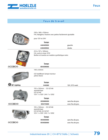 Feux Feux de travail 230 x 160 x 150mm H4, halogène, fixation avec pattes facilement ajustable pour 12V et 24V lampe 44045503 gauche 44045504 droite 214 x 157 x 120mm H4, socle à visser M12 Boîtier et lunette en matière synthétique noire lampe 05439000 140 x 64mm GE SealtBeam lampe tracteur Johne Deere lampe H4360 12V, 37.5 watt 155 x 102mm - E3-52146 asymétrique E3-52146 12V: 1 x 1201 24V: 1 x 1202 lampe 05389000 sans feu de pos. 05411000 avec feu de pos. 155 x 102mm - E3-52146 asymétrique E3-52146, E3-52147 12V: 1 x 1201 24V: 1 x 1202 lampe 05455000 sans feu de pos. 05456000 avec feu de pos. Industriestrasse 20 | CH-8712 Stäfa | Schweiz 79 Feux 167 x 107mm H4, sans feu de pos. pour des tracteurs Same & Hürlimann 12V: 1101 24V: 1102 lampe 05575000 sans feu de pos. Ø 130mm H4, avec feu de pos. E5-408 12V: 1101, 1501 24V: 1102, 1502 lampe 05575000 avec feu de pos. Feux de travail Ø 85mm M6, IP67, fiche étanche: PGJ13 d‘orig. sur: Landini, John Deere, Laverda 12V: 1176 GE886 lampe 05069900 80 Téléphone: 044 928 34 34 | Fax: 044 928 34 35 | [email protected] Feux 160 x 100mm - M10 12V: 2 x 1121 - 24V: 2 x 1122 lampe PL29001 PC09000 PL09000 PC09000 double feu de travail av. interrupteur PL09000 av. poignée & interrupteur PL29001 av. poignée, interrup., aimant & ventouse Ø 160mm avec interrupteur 12V: 1 x 1121 lampe 2990000 av. cintre en U 2990051 av. magnète et câble spirale 150 x 90mm avec interrupteur 12V: 1 x 1121 Lampe 2995000 av. cintre en U 160 x 100mm - M12 12V: 1121 24V: 1122 lampe PC02000 av. cintre en U 160 x 105mm 12V: 2 x 1121 24V: 2 x 1122 lampe PC03000 double feu de travail av. interrupteur PL03000 av. poignée & interrupteur Industriestrasse 20 | CH-8712 Stäfa | Schweiz 81 Feux 180 x 115mm XENON HID lampe 3095001 3095051 3095001 12V - av. poignée sans interrupteur 3095051 12V - av. magnète et câble spirale 110 x 110mm H3, M10 lampe 4205WL 110 x 100mm compact, H3 12V: 1121 24V: 1122 PC01000 PL01000 PL21001 lampe PC01000 av. cintre en U PL01000 av. grip & interrupteur PL21001 av. magnète & câble spirale Ø 177 x 208mm 12V: 1121 24V: 1122 avec poigné et interrupteur, support-U M12 lampe 4208 XENON 120 x 110 x 140mm 12/24V 10-32V, 35W, 4300K, IP65 3‘200 Lumen câble prémonté 200mm Lampe GS8510 82 Téléphone: 044 928 34 34 | Fax: 044 928 34 35 | [email protected] Feux Feux tournants 47 x 22 x 17cm av. 3 ventouses magnétiques pour l‘utilisation sur tous les surfaces lisses jusqu‘à 130 km/h E2-05013 12V: 2 x 1111 24V: 2 x 1112 lampe 2350M3TP15 av. 3 ventouses Ø 13cm, hauteur 20cm avec transmission escargot 7760934 E2-90041 12V: 1111 24V: 1112 lampe verre de rechange 7761014 7760004 7760934 av. magnète et ventouse 7761014 montage sur toit 7760004 pour support d‘encl. DIN A 7768210 jaune 7768220 rouge 7768250 bleu feu tournant ELLIPSE magn. + ventouse H21W 12 + 24V E4-006529 12V: 1897 / 24V: 1895 câble spirale avec fiche allume-cigare incl. ampoule 12V avec transmission escargot lampe verre de rechange 2144HM25 2144811 jaune Industriestrasse 20 | CH-8712 Stäfa | Schweiz 83 Feux feu tournant ELLIPSE flexible pour DIN A H21W 12 + 24V E4-006529 12V: 1897 / 24V: 1895 incl. ampoule 12V avec transmission escargot lampe verre de rechange 2144HO25 2144811 jaune Quasarino Ø 12.8cm , hauteur 23.5cm anti-choc E2-006125 12V: 1111 lampe verre de rechange 2189001 2189811 pour support d‘encl. DIN A Quasarino Ø 13.5cm, hauteur 26cm anti-choc E2-006125 12V: 1111 24V: 1112 84 lampe verre de rechange 2177004 2177811 pour support d‘encl. DIN A Téléphone: 044 928 34 34 | Fax: 044 928 34 35 | [email protected] Feux Feux de clignotant Ø 6cm, hauteur 11.5cm 20 Watt avec interrupteur „Beep Beep Beep“ 12V: 1839 24V: 1842 Lampe 2138HCIO12 Ø 6cm, hauteur 11.5cm 20 Watt sans interrupteur „Beep Beep Beep“ 12V: 1839 24V: 1842 lampe 2138H00024 Industriestrasse 20 | CH-8712 Stäfa | Schweiz 85 Feux Feux à éclats XENON Ø 13cm, hauteur 20cm XENON E2-6088, E2-6123 12V: 1111 24V: 1112 2176F33D lampe 2176F21D 2176F01D verre de rechange 2176F33D av. magnète et ventouse 2176F21D montage sur toit 2176F01D pour support d‘encl. DIN A 7768210 jaune 7768220 rouge 7768250 bleu 9016410 Neon ampoules de rechange anti-choc XENON 12V & 24V lampe verre de rechange FX81013 GF81211 FX10641 ampoules de rechange Ø 13cm, hauteur 11.5cm pour montage sur toit, XENON 10V jusqu‘à 100V 86 lampe verre de rechange 2130010 2130811 (jaune) consomm. d‘éléctr. env. 0.6 amp. 2130851 (bleu) av. ventouse et socle magnétique Téléphone: 044 928 34 34 | Fax: 044 928 34 35 | [email protected] Feux Accessoires pour des feux tournants & à éclats fiche DIN pour feu tournant article 7910000 DIN A accessoires pour des feux tournants DIN A article 7920000 2197000 7920000 tube avec bride 2193000 fiche 2197000 support pliable tube p. feu tournant article 2198000 50cm capteur pour feu tournant 12V éteinds en dessous de 80W article KFZ SYSTEME Sensor/R12V joint pour feu tourant pour montage sur le toit article 2176283 Industriestrasse 20 | CH-8712 Stäfa | Schweiz 87 Feux Feux d‘arrière 160 x 67mm E1-35715 12V: 1341, 1321 24V: 1342, 1322 lampe verre de rechange 02728000 02728210 FX CL ST • • • FX CL ST • • • FX CL ST FR FB EP FG CT • 160 x 70mm E3-52497 12V: 2 x 1321, 2 x 1401 24V: 2 x 1322, 2 x 1402 lampe verre de rechange 02180000 02180200 FR FB EP FG CT FR FB EP FG CT FG CT FG CT 160 x 67mm E3-32673, E3-32670, E3-32671, E3-32672 12V: 1321, 1711 24V: 1322, 1712 lampe verre de rechange 02224000 02224200 gauc. • • • • 02225000 02225200 droite • • • • FX CL ST 160 x 81mm E3-32673, E3-32670, E3-32671 12V: 2 x 1321, 1 x 1401, 1711 24V: 2 x 1322, 1 x 1402, 1712 lampe verre de rechange 02268000 02224200 gauc. • • • 02269000 02225200 droite • • • FX CL ST • • • • FR FB EP • 185 x 76 x 75mm E13-9545 12V: 1 x 1321, 1 x 1341 24V: 1 x 1322, 1 x 1342 88 lampe verre de rechange 02430000 02356200 02368000 02356200 gauc. • • • • 02369000 