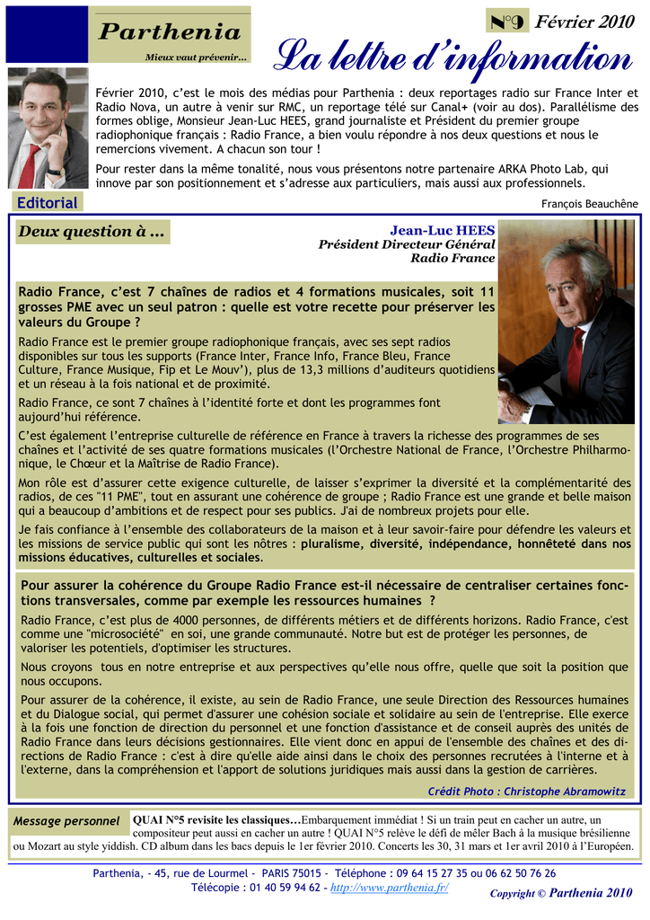 N°9 Février 2010 Mieux vaut prévenir... La lettre d’information Février 2010, c’est le mois des médias pour Parthenia : deux reportages radio sur France Inter et Radio Nova, un autre à venir sur RMC, un reportage télé sur Canal+ (voir au dos). Parallélisme des formes oblige, Monsieur Jean-Luc HEES, grand journaliste et Président du premier groupe radiophonique français : Radio France, a bien voulu répondre à nos deux questions et nous le remercions vivement. A chacun son tour ! Pour rester dans la même tonalité, nous vous présentons notre partenaire ARKA Photo Lab, qui innove par son positionnement et s’adresse aux particuliers, mais aussi aux professionnels. Editorial François Beauchêne Deux question à ... Jean-Luc HEES Président Directeur Général Radio France Radio France, c’est 7 chaînes de radios et 4 formations musicales, soit 11 grosses PME avec un seul patron : quelle est votre recette pour préserver les valeurs du Groupe ? Radio France est le premier groupe radiophonique français, avec ses sept radios disponibles sur tous les supports (France Inter, France Info, France Bleu, France Culture, France Musique, Fip et Le Mouv’), plus de 13,3 millions d’auditeurs quotidiens et un réseau à la fois national et de proximité. Radio France, ce sont 7 chaînes à l’identité forte et dont les programmes font aujourd’hui référence. C’est également l’entreprise culturelle de référence en France à travers la richesse des programmes de ses chaînes et l’activité de ses quatre formations musicales (l’Orchestre National de France, l’Orchestre Philharmonique, le Chœur et la Maîtrise de Radio France). Mon rôle est d’assurer cette exigence culturelle, de laisser s’exprimer la diversité et la complémentarité des radios, de ces "11 PME", tout en assurant une cohérence de groupe ; Radio France est une grande et belle maison qui a beaucoup d’ambitions et de respect pour ses publics. J'ai de nombreux projets pour elle. Je fais confiance à l’ensemble des collaborateurs de la maison et à leur savoir-faire pour défendre les valeurs et les missions de service public qui sont les nôtres : pluralisme, diversité, indépendance, honnêteté dans nos missions éducatives, culturelles et sociales. Pour assurer la cohérence du Groupe Radio France est-il nécessaire de centraliser certaines fonctions transversales, comme par exemple les ressources humaines ? Radio France, c’est plus de 4000 personnes, de différents métiers et de différents horizons. Radio France, c'est comme une "microsociété" en soi, une grande communauté. Notre but est de protéger les personnes, de valoriser les potentiels, d'optimiser les structures. Nous croyons tous en notre entreprise et aux perspectives qu’elle nous offre, quelle que soit la position que nous occupons. Pour assurer de la cohérence, il existe, au sein de Radio France, une seule Direction des Ressources humaines et du Dialogue social, qui permet d'assurer une cohésion sociale et solidaire au sein de l'entreprise. Elle exerce à la fois une fonction de direction du personnel et une fonction d'assistance et de conseil auprès des unités de Radio France dans leurs décisions gestionnaires. Elle vient donc en appui de l'ensemble des chaînes et des directions de Radio France : c'est à dire qu'elle aide ainsi dans le choix des personnes recrutées à l'interne et à l'externe, dans la compréhension et l'apport de solutions juridiques mais aussi dans la gestion de carrières. Crédit Photo : Christophe Abramowitz QUAI N°5 revisite les classiques…Embarquement immédiat ! Si un train peut en cacher un autre, un compositeur peut aussi en cacher un autre ! QUAI N°5 relève le défi de mêler Bach à la musique brésilienne ou Mozart au style yiddish. CD album dans les bacs depuis le 1er février 2010. Concerts les 30, 31 mars et 1er avril 2010 à l’Européen. Message personnel Parthenia, - 45, rue de Lourmel - PARIS 75015 - Téléphone : 09 64 15 27 35 ou 06 62 50 76 26 Télécopie : 01 40 59 94 62 - http://www.parthenia.fr/ Copyright © Parthenia 2010 Le coin des Partenaires Plein feux sur ARKA Une stratégie gagnante : se positionner sur des axes de développement innovants ou délaissés par la concurrence L'environnement dans lequel les entreprises doivent se positionner est de plus en plus concurrentiel. Elles doivent constamment rechercher des axes de développement innovants répondant à l'évolution de la demande des consommateurs, dans des services où la concurrence n'a pas une présence trop envahissante. Et cela est vrai quelque soit la taille de l'entreprise. Un axe qui revient de façon récurrente, sans être réellement satisfait, est la demande pour un conseil de qualité à l'écoute des besoins exprimés par les clients, professionnels ou amateurs C'est l'orientation qu'a choisi Arka, laboratoire photo professionnel, pour développer son activité. Cette entreprise accompagne chaque client, qu'il soit professionnel, amateur averti, ou simple photographe occasionnel, pour guider ses choix techniques et lui garantir une mise en valeur de ses images tant argentiques que numériques. Cette stratégie lui permet de créer des relations commerciales pérennes avec chacun d'entre eux. Arka propose une large gamme de prestations : Développement argentique professionnel pour images aux couleurs irréprochables révélant tout le potentiel des prises de vue. Tirages argentiques traditionnels sur papier baryté ou Cibachrome pour un modelé tout en nuances. Services de scanérisation pour tous types de documents. Tirages numériques toutes dimensions dans les deux technologies, argentique et jet d'encre, accompagnés des prestations amont de retouche et d'équilibrage de la chromie, ainsi que des prestations traditionnelles de finition, contre-collage et encadrement. Edition de livres photographiques en micro-édition avec une qualité n'ayant rien à envier à l'édition trad