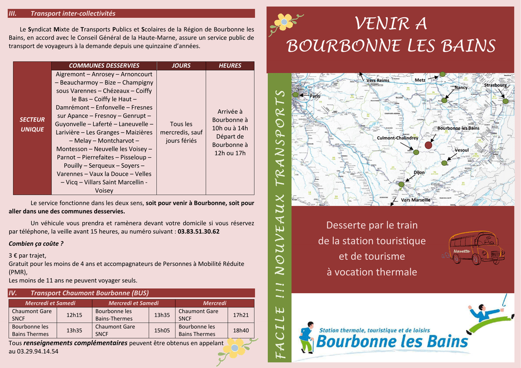Transport inter-collectivités Le Syndicat Mixte de Transports Publics et Scolaires de la Région de Bourbonne les Bains, en accord avec le Conseil Général de la Haute-Marne, assure un service public de transport de voyageurs à la demande depuis une quinzaine d’années. SECTEUR UNIQUE COMMUNES DESSERVIES Aigremont – Anrosey – Arnoncourt – Beaucharmoy – Bize – Champigny sous Varennes – Chézeaux – Coiffy le Bas – Coiffy le Haut – Damrémont – Enfonvelle – Fresnes sur Apance – Fresnoy – Genrupt – Guyonvelle – Laferté – Laneuvelle – Larivière – Les Granges – Maizières – Melay – Montcharvot – Montesson – Neuvelle les Voisey – Parnot – Pierrefaites – Pisseloup – Pouilly – Serqueux – Soyers – Varennes – Vaux la Douce – Velles – Vicq – Villars Saint Marcellin Voisey JOURS HEURES Vers Reims Tous les mercredis, sauf jours fériés Arrivée à Bourbonne à 10h ou à 14h Départ de Bourbonne à 12h ou 17h Un véhicule vous prendra et ramènera devant votre domicile si vous réservez par téléphone, la veille avant 15 heures, au numéro suivant : 03.83.51.30.62 Combien ça coûte ? 3 € par trajet, Gratuit pour les moins de 4 ans et accompagnateurs de Personnes à Mobilité Réduite (PMR), Les moins de 11 ans ne peuvent voyager seuls. Transport Chaumont Bourbonne (BUS) Mercredi et Samedi Chaumont Gare 12h15 SNCF Bourbonne les 13h35 Bains Thermes Metz Nancy Le service fonctionne dans les deux sens, soit pour venir à Bourbonne, soit pour aller dans une des communes desservies. IV. VENIR A BOURBONNE LES BAINS Mercredi et Samedi Bourbonne les 13h35 Bains-Thermes Chaumont Gare 15h05 SNCF Mercredi Chaumont Gare SNCF Bourbonne les Bains Thermes Tous renseignements complémentaires peuvent être obtenus en appelant au 03.29.94.14.54 17h21 18h40 FACILE !!! NOUVEAUX TRANSPORTS III. Paris Bourbonne les Bains Culmont-Chalindrey Vesoul Dijon Vers Marseille Desserte par le train de la station touristique et de tourisme à vocation thermale Navette Strasbourg COMMUNE DE BOURBONNE LES BAINS SYNDICAT MIXTE DE TRANSPORT Parc du Château 52400 BOURBONNE LES BAINS PUBLIC ET SCOLAIRE DE LA 03 25 90 14 80 03 25 90 69 40 [email protected] REGION DE BOURBONNE LES BAINS La Haute-Marne bénéficie d’un arrêt TGV à Culmont-Chalindrey. La plupart des trains s’arrêtent à cette gare. Un transport sur réservation, ouvert à tous, fait le lien entre la gare de Culmont Chalindrey et la station thermale. II. Place des Bains 52400 Bourbonne les Bains 03 25 90 01 71 03 25 90 14 12 [email protected] Par rabattement et réservation en lien avec les horaires TGV (petit temps d’attente à Culmont) A. Ligne Reims - Culmont Comment réserver ? - OFFICE DE TOURISME DE BOURBONNE LES BAINS En appelant la centrale de réservation au 1. Départ de Culmont - 18h50 du lundi au dimanche arrivée à 22h20 à Reims et 21h33 le samedi, 2. Départ de Reims Le mardi, mercredi, jeudi et vendredi matin de 8h a 11h. - Ou sur le site internet : www.lereseauutile.fr - B. Ligne Paris - Culmont-Chalindrey Combien ça coûte ? 3 € par trajet, Gratuit pour les moins de 4 ans et accompagnateurs de Personnes à Mobilité Réduite (PMR), Les moins de 11 ans ne peuvent voyager seuls. I. Desserte TGV 7j/7j (du 11/12/2011 au 07/07/2012) ALLER TGV 07h32 du lundi au dimanche arrivée à 10h09 à Culmont 5456 Metz 16h01 Nancy 16h35 Nancy 16h43 Culmont-Chalindrey 18h12 Culmont-Chalindrey 18h20 Dijon 19h06 Dijon 19h21 Mâcon 20h18 Mâcon 20h20 Lyon Part-Dieu 20h56 Lyon Part-Dieu 21h06 Avignon TGV 22h08 Avignon TGV 22h11 Aix en Provence TGV 22h31 Aix en Provence TGV 22h34 Marseille Saint Charles 22h46 Tous les jours, départ de Culmont-Chalindrey à 18h19, arrivée à Marseille à 22h46 soit 4h27 de trajet RETOUR TGV 5458 Marseille Saint Charles 06h14 Aix en Provence TGV 06h27 Aix en Provence TGV 06h29 Valence TGV 07h18 Valence TGV 07h21 Lyon Part-Dieu 07h56 Lyon Part-Dieu 08h04 Châlons sur Saône 09h03 Châlons sur Saône 09h06 Dijon Ville 09h37 Dijon Ville 09h46 Culmont-Chalindrey 10h33 Culmont-Chalindrey 10h41 Nancy 12h10 Nancy 12h18 Metz 12h51 Tous les jours, départ de Marseille à 06h14 arrivée à Culmont-Chalindrey à 10h33 soit 4h19 de trajet 3. Départ de Paris - 06h42 du lundi au vendredi arrivée 09h46 à Culmont - 15h12 du lundi au dimanche arrivée 17h54 à Culmont 4. Départ de Culmont - 10h50 du lundi au dimanche arrivée13h46 à Paris (sauf du 7 au 10 février et du 12 au 30 mars en raison de travaux) - 18h20 du lundi au dimanche arrivée à 21h24 à Paris C. Ligne Vesoul-Culmont 1. Départ de Culmont - 17h55 du lundi au dimanche arrivée à 18h32 à Vesoul, ne circule pas les samedis D. Ligne Nancy-Merrey Une liaison est également assurée entre la gare de MERREY et BOURBONNE LES BAINS, sur demande moyennant une participation de 12 € par personne, par voyage. - Desserte gare de MERREY : aux horaires des trains, hors créneaux scolaires Tous RENSEIGNEMENTS COMPLEMENTAIRES et RESERVATIONS peuvent être obtenus en appelant le secrétariat du SMTPS en Mairie de Bourbonne les Bains aux heures d’ouverture au 03.25.90.14.80 Ligne Paris-Culmont, des perturbations sont possible au printemps en raison de travaux