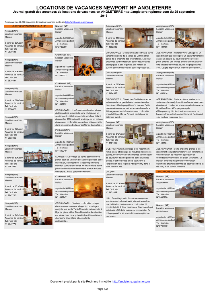 LOCATIONS DE VACANCES NEWPORT NP ANGLETERRE Journal gratuit des annonces de locations de vacances en ANGLETERRE http://angleterre.repimmo.com du 25 septembre 2016 Retrouvez nos 40.000 annonces de location vacances sur le site http://angleterre.repimmo.com LOCATIONS VACANCES VILLA NP Newport (NP) Location vacances Maison à partir de 83€/sem Annonce de particulier Tel : Voir site N° 2838635 Newport (NP) Location vacances Maison à partir de 83€/sem Annonce de particulier Tel : Voir site N° 2838634 Newport (NP) Location vacances Maison à partir de 596€/sem Annonce de particulier Tel : Voir site N° 2838428 Newport (NP) Location vacances Maison à partir de 77€/sem Annonce de particulier Tel : Voir site N° 2833302 Newport (NP) Location vacances Maison à partir de 83€/sem Annonce de particulier Tel : Voir site N° 2762939 Newport (NP) Location vacances Maison à partir de 131€/sem Annonce de particulier Tel : Voir site N° 2747780 Newport (NP) Location vacances Maison à partir de 143€/sem Annonce de particulier Tel : Voir site N° 2747779 Newport (NP) Location vacances Maison Crickhowell (NP) Location vacances Maison Abergavenny (NP) Location vacances Maison à partir de 269€/sem Annonce de particulier Tel : Voir site N° 2726950 à partir de 458€/sem Annonce de particulier Tel : Voir site N° 1592236 à partir de 542€/sem Annonce de particulier Tel : Voir site N° 1431466 CRICKHOWELL : Ce superbe gîte se trouve sur le versant ensoleillé de la vallée de Duffryn et fait partie de la propriété des propriétaires. Les deux propriétés sont entretenues selon des principes écologiques et des légumes, des herbes de cuisine et des fruits cultivés dans le potager du... ABERGAVENNY : Hatterall View Cottage est un grand chalet que ce soit pour un séjour romantique à juste un couple ou pour une famille avec de petits enfants. Les jeunes enfants aiment toujours être capable de voir les poulets les propriétaires »ont. Le gîte dispose d'un intérieur ensoleillé et... Crickhowell (NP) Location vacances Maison Abergavenny (NP) Location vacances Maison à partir de 587€/sem Annonce de particulier Tel : Voir site N° 1494567 à partir de 496€/sem Annonce de particulier Tel : Voir site N° 1431414 CRICKHOWELL : Chalet Hen Stabl de vacances est une petite rangée joliment restauré écuries dans les motifs du propriétaire "s maison. Cette maison de vacances tout au rez-de-chaussée a été soigneusement rénové rendant confortable, chaud et léger. Ce est l'endroit parfait pour se détendre avant... ABERGAVENNY : Cette ancienne remise pour voitures à chevaux joliment transformée avec deux chambres à coucher se trouve dans le domaine de Bryn Cain Farm à Penpergwym près d'Abergavenny. Un lieu idéal pour savourer un luxueux dîner au tout proche Hardwick Restaurant , élu meilleur restaurant du... Pontypool (NP) Location vacances Maison Abergavenny (NP) Location vacances Maison à partir de 542€/sem Annonce de particulier Tel : Voir site N° 1451893 à partir de 736€/sem Annonce de particulier Tel : Voir site N° 1431404 GOETRE-FAWR : Le cottage a été récemment remis à neuf et rééquipé de meubles d'excellente qualité, décoré avec de charmantes combinaisons de couleur et doté de parquets dans toutes les pièces. C'est une base idéale pour partir à l'exploration de la région d'Abergavenny dans le Parc national des... ABERGAVENNY : Cette ancienne grange a été récemment complètement rénovée et transformée en une maison de vacances spacieuse et confortable avec vue sur les Black Mountains. La maison offre une magnifique combinaison d'éléments originels (comme les poutres en bois et les sols) et de confort moderne... Crickhowell (NP) Location vacances Maison à partir de 1621€/sem Annonce de particulier Tel : Voir site N° 1592272 Crickhowell (NP) Location vacances Maison à partir de 684€/sem Annonce de particulier Tel : Voir site N° 1592252 CRICKHOWELL : Le Crown dans l'ancien village de Llangattock présente la porte d'origine et un sentier pavé ; c'était un pub très populaire datant des années 1890 qui a été aménagé en un cottage chaleureux, confortable, accueillant et impeccable dans un super endroit pour profiter de toutes les... Pontypool (NP) Location vacances Maison à partir de 496€/sem Annonce de particulier Tel : Voir site N° 1592249 LLANELLY : Le cottage de Jenny est un endroit parfait pour les visiteurs des vallées galloises et de Blaenavon, site inscrit sur la liste du patrimoine mondial, comprenant toutes les installations d'une petite ville de vallée traditionnelle à deux minutes de marche.. Prix à partir de 496 euros Crickhowell (NP) Location vacances Maison Usk (NP) Location vacances Maison à partir de 633€/sem Annonce de particulier Tel : Voir site N° 1451889 à partir de 542€/sem Annonce de particulier Tel : Voir site N° 1592247 CRICKHOWELL : Vaste et confortable cottage dans un environnement villageois. Le cottage a une jolie vue sur la Table Mountain, qui remonte à lâge de glace, et les Black Mountains. La situation est idéale pour ceux qui veulent résider à distance de marche d'un village et dexcellents restaurants.... USK : Ce cottage plein de charme occupe un emplacement calme et a été joliment rénové en une habitation chaleureuse et confortable. Il convient plutôt à deux personnes, étant donné qu'il est situé à côté de la maison du propriétaire. Ce cottage possède sa propre terrasse en pierre à part avec... Document produit par le site Repimmo Immobilier http://angleterre.repimmo.com Page 1/2 LOCATIONS VACANCES APPARTEMENT NP Newport (NP) Location vacances Appartement à partir de 143€/sem Annonce de particulier Tel : Voir site N° 2843770 Newport (NP) Location vacances Appartement à partir de 143€/sem Annonce de particulier Tel : Voir site N° 2796972 LOCATIONS DE VACANCES NEWPORT NP ANGLETERRE Journal gratuit des annonces de locations de vacances en ANGLETERRE 