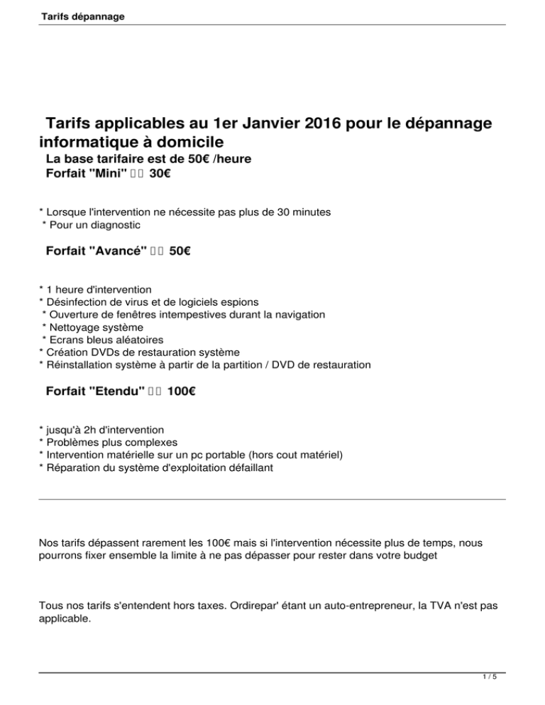 Tarifs dépannage Tarifs applicables au 1er Janvier 2016 pour le dépannage informatique à domicile La base tarifaire est de 50€ /heure Forfait "Mini" 30€ * Lorsque l'intervention ne nécessite pas plus de 30 minutes * Pour un diagnostic Forfait "Avancé" 50€ * 1 heure d'intervention * Désinfection de virus et de logiciels espions * Ouverture de fenêtres intempestives durant la navigation * Nettoyage système * Ecrans bleus aléatoires * Création DVDs de restauration système * Réinstallation système à partir de la partition / DVD de restauration Forfait "Etendu" 100€ * jusqu'à 2h d'intervention * Problèmes plus complexes * Intervention matérielle sur un pc portable (hors cout matériel) * Réparation du système d'exploitation défaillant Nos tarifs dépassent rarement les 100€ mais si l'intervention nécessite plus de temps, nous pourrons fixer ensemble la limite à ne pas dépasser pour rester dans votre budget Tous nos tarifs s'entendent hors taxes. Ordirepar' étant un auto-entrepreneur, la TVA n'est pas applicable. 1/5 Tarifs dépannage Zone d'intervention OrdiRepar' propose un service de dépannage informatique à domicile sur Paris (75) et sa banlieue (92 - Hauts-de-Seine , 93 - Seine-Saint-Denis, 94 - Val-de-Marne, 95 - Val d'Oise). 75 Dépannage informatique Paris 75001 75002 75003 75004 75005 75006 75007 75008 75009 75010 75011 75012 75013 75014 75015 75016 75017 75018 75019 75020 Dépannage informatique Paris 1er Dépannage informatique Paris 2ème Dépannage informatique Paris 3ème Dépannage informatique Paris 4ème Dépannage informatique Paris 5ème Dépannage informatique Paris 6ème Dépannage informatique Paris 7ème Dépannage informatique Paris 8ème Dépannage informatique Paris 9ème Dépannage informatique Paris 10ème Dépannage informatique Paris 11ème Dépannage informatique Paris 12ème Dépannage informatique Paris 13ème Dépannage informatique Paris 14ème Dépannage informatique Paris 15ème Dépannage informatique Paris 16ème Dépannage informatique Paris 17ème Dépannage informatique Paris 18ème Dépannage informatique Paris 19ème Dépannage informatique Paris 20ème 92 Dépannage informatique Hauts-de-Seine 92160 92600 92220 92270 92100 92340 92290 92320 92370 92140 92110 92700 92400 Dépannage informatique Antony Dépannage informatique Asnières-sur-Seine Dépannage informatique Bagneux Dépannage informatique Bois-Colombes Dépannage informatique Boulogne-Billancourt Dépannage informatique Bourg-la-Reine Dépannage informatique Châtenay-Malabry Dépannage informatique Châtillon Dépannage informatique Chaville Dépannage informatique Clamart Dépannage informatique Clichy Dépannage informatique Colombes Dépannage informatique Courbevoie 2/5 Tarifs dépannage 92260 92380 92250 92230 92130 92300 92240 92430 92190-92360 92120 92000 92200 92350 92800 92500 92210 92330 92310 92150 92170 92420 92410 92390 94 94480 94140 94110 94470 94380 94360 94230 94500 94220 94430 94550 94600 94000 94120 94260 94250 94240 94200 94340 94270 94450 94700 Dépannage informatique Fontenay-aux-Roses Dépannage informatique Garches Dépannage informatique Garenne-Colombes Dépannage informatique Gennevilliers Dépannage informatique Issy-les-Moulineaux Dépannage informatique Levallois-Perret Dépannage informatique Malakoff Dépannage informatique Marnes-la-Coquette Dépannage informatique Meudon Dépannage informatique Montrouge Dépannage informatique Nanterre Dépannage informatique Neuilly-sur-Seine Dépannage informatique Plessis-Robinson Dépannage informatique Puteaux Dépannage informatique Rueil-Malmaison Dépannage informatique Saint-Cloud Dépannage informatique Sceaux Dépannage informatique Sèvres Dépannage informatique Suresnes Dépannage informatique Vanves Dépannage informatique Vaucresson Dépannage informatique Ville-d'Avray Dépannage informatique Villeneuve-la-Garenne Dépannage informatique Val-de-Marne Dépannage informatique Ablon-sur-Seine Dépannage informatique Alfortville Dépannage informatique Arcueil Dépannage informatique Boissy-Saint-Léger Dépannage informatique Bonneuil-sur-Marne Dépannage informatique Bry-sur-Marne Dépannage informatique Cachan Dépannage informatique Champigny-sur-Marne Dépannage informatique Charenton-le-Pont Dépannage informatique Chennevières-sur-Marne Dépannage informatique Chevilly-Larue Dépannage informatique Choisy-le-Roi Dépannage informatique Créteil Dépannage informatique Fontenay-sous-Bois Dépannage informatique Fresnes Dépannage informatique Gentilly Dépannage informatique Haÿ-les-Roses Dépannage informatique Ivry-sur-Seine Dépannage informatique Joinville-le-Pont Dépannage informatique Kremlin-Bicêtre Dépannage informatique Limeil-Brévannes Dépannage informatique Maisons-Alfort 3/5 Tarifs dépannage 94520 94440 94130 94880 94310 94490 94520 94170 94420 94510 94150 94160 94100-94210 94410 94440 94370 94320 94460 94440 94800 94290 94190 94350 94300 94400 Dépannage informatique Mandres-les-Roses Dépannage informatique Marolles-en-Brie Dépannage informatique Nogent-sur-Marne Dépannage informatique Noiseau Dépannage informatique Orly Dépannage informatique Ormesson-sur-Marne Dépannage informatique Périgny-sur-Yerres Dépannage informatique Perreux-sur-Marne Dépannage informatique Plessis-Trévise Dépannage informatique Queue-en-Brie Dépannage informatique Rungis Dépannage informatique Saint-Mandé Dépannage informatique Saint-Maur-des-Fossés Dépannage informatique Saint-Maurice Dépannage informatique Santeny Dépannage informatique Sucy-en-Brie Dépannage informatique Thiais Dépannage informatique Valenton Dépannage informatique Villecresnes Dépannage informatique Villejuif Dépannage informatique Villeneuve-le-Roi Dépannage informatique Villeneuve-Saint-Georges Dépannage informatique Villiers-sur-Marne Dépannage informatique Vincennes Dépannage informatique Vitry-sur-Seine 93 Dépannage informatique Seine-Saint-Denis 93300 93600 93170 9
