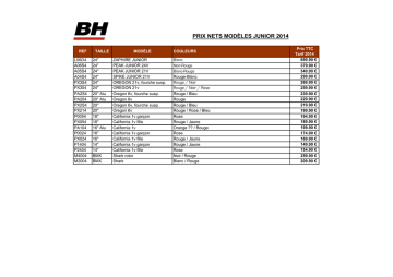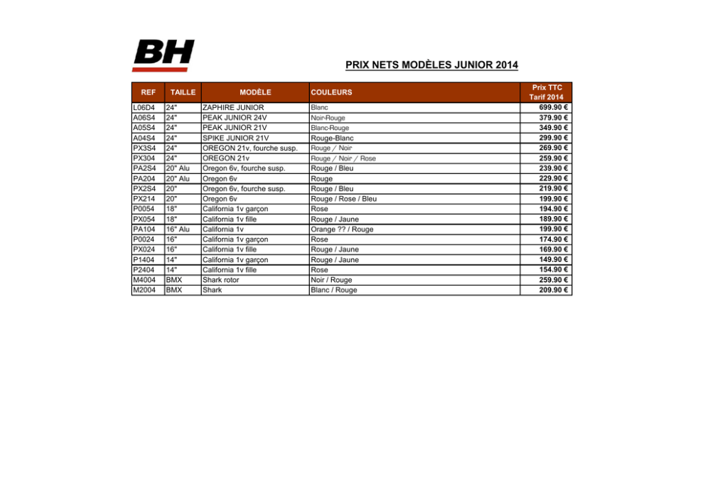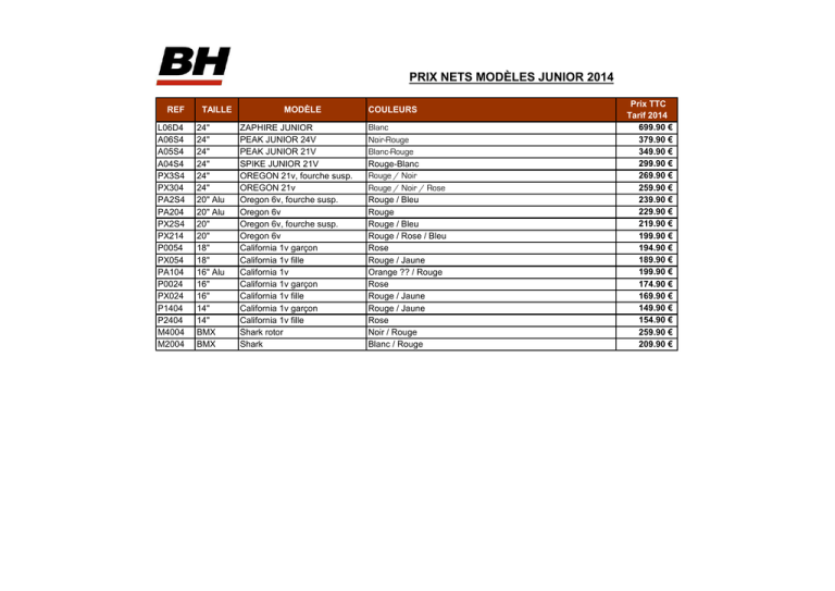 PRIX NETS MODÈLES JUNIOR 2014 REF L06D4 A06S4 A05S4 A04S4 PX3S4 PX304 PA2S4 PA204 PX2S4 PX214 P0054 PX054 PA104 P0024 PX024 P1404 P2404 M4004 M2004 TAILLE 24" 24" 24" 24" 24" 24" 20" Alu 20" Alu 20" 20" 18" 18" 16" Alu 16" 16" 14" 14" BMX BMX MODÈLE ZAPHIRE JUNIOR PEAK JUNIOR 24V PEAK JUNIOR 21V SPIKE JUNIOR 21V OREGON 21v, fourche susp. OREGON 21v Oregon 6v, fourche susp. Oregon 6v Oregon 6v, fourche susp. Oregon 6v California 1v garçon California 1v fille California 1v California 1v garçon California 1v fille California 1v garçon California 1v fille Shark rotor Shark COULEURS Blanc Noir-Rouge Blanc-Rouge Rouge-Blanc Rouge / Noir Rouge / Noir / Rose Rouge / Bleu Rouge Rouge / Bleu Rouge / Rose / Bleu Rose Rouge / Jaune Orange ?? / Rouge Rose Rouge / Jaune Rouge / Jaune Rose Noir / Rouge Blanc / Rouge Prix TTC Tarif 2014 699.90 € 379.90 € 349.90 € 299.90 € 269.90 € 259.90 € 239.90 € 229.90 € 219.90 € 199.90 € 194.90 € 189.90 € 199.90 € 174.90 € 169.90 € 149.90 € 154.90 € 259.90 € 209.90 €